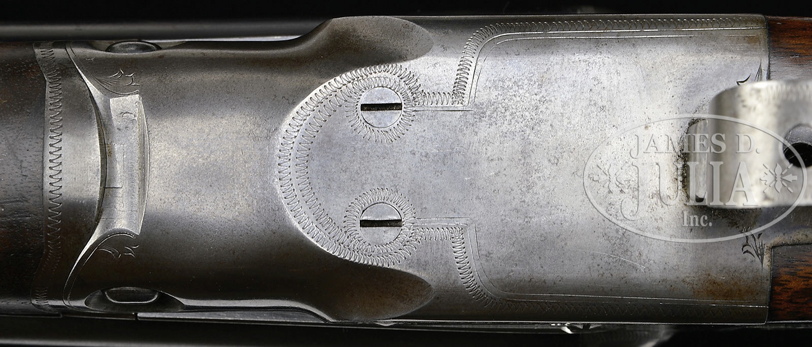 *RARE HAYES DESIGN PARKER “TRY GUN”.SN 171493. Cal. 12 ga. 2-3/4″ Chambers. No. 2 Frame. One of fewer than 20 Parker “try guns” made in all types, this specimen has 30″ Vulcan steel bbls with correct markings on rib and bbl flats. The rear of rib is drilled and tapped with three holes for affixing measuring device (not included). A gun with device affixed is pictured in THE PARKER STORY on p. 671. Most known examples are of Hayes pattern. This is one of a group of three made in 1915 by altering a standard “V” action. with engraving that differs from normal production in that “PARKER BROS” is in large letters at bottom of each side. Also, action has been fitted with brazed-on extensions at rear with square headed screws to be turned in and out to adjust for cast. There are also adjustment screws through forward part of top tang and in front of triggers, with access hole through trigger guard bow for adjusting grip angle and initial adjustment for drop at heel. Trigger guard has been thickened at forward and rear portion of bow for unique attachment to trigger plate. Capped pistol grip stock of lightly figured American walnut has yoke affixed to stock at front of checkering which extends into action area to be acted on by aforementioned adjustment screws. Butt portion of stock behind unusual scallop bordered mullered checkering, has knurled wheel adjustment screws for drop at heel and comb. Thick, hard, checkered, rubber buttplate has wheel adjustments for length of pull, and pitch, and screw adjustment on bottom wheel for extra cast at toe. Gun is fitted with standard splinter forend. Parker Gun Identification and Serialization ledger lists this gun with an extra code of “4” which normally refers to a single trigger. In this case, however, it must denote a “special” gun, as other “try guns” in the group, all have the same designation. Bore diameter: left-.730, right -.730. Bore restrictions: left -.032 (Full), right -.034 (Full). Wall thickness: left -.025, right -.031. Drop at heel: adjustable, drop at comb: adjustable. Weight: 8 lbs. 11 oz. LOP: adjustable. CONDITION: Fine. Bbls retain most of their orig blue, considerably silvered and thinned at normal carry and wear areas. Action retains traces of its orig case hardening color, mostly cleaned to silver gray. Stocks retain most of their orig finish with numerous small marks and light compressions. Bores are excellent. Action is tight. This is a well designed, shootable, “try gun”. 4-49288 MGM128 (10,000-15,000) – Lot 3509