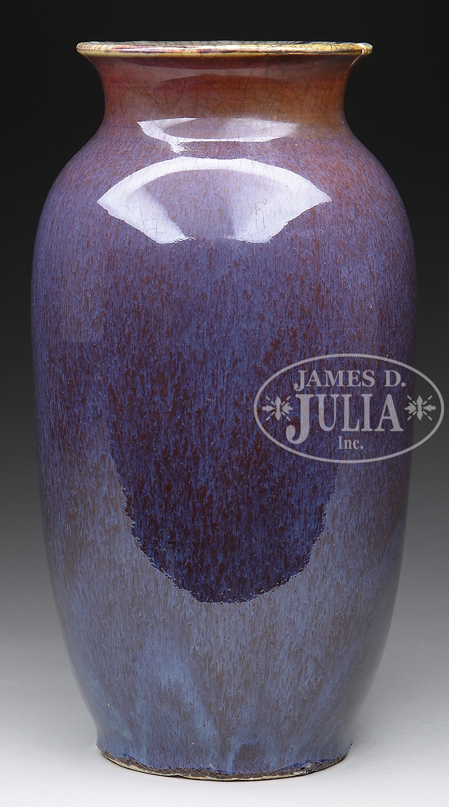 FLAMBE GLAZED PORCELAIN VASE.19th century, China. The vase made in ovoid form with a short neck and slightly flared top rim. Flambe glaze covering the entire exterior fading to clear at the top of the neck. SIZE: 14-3/4″ h. CONDITION: Restoration at rim. 50283-4 (800-1,200) – Lot 3509