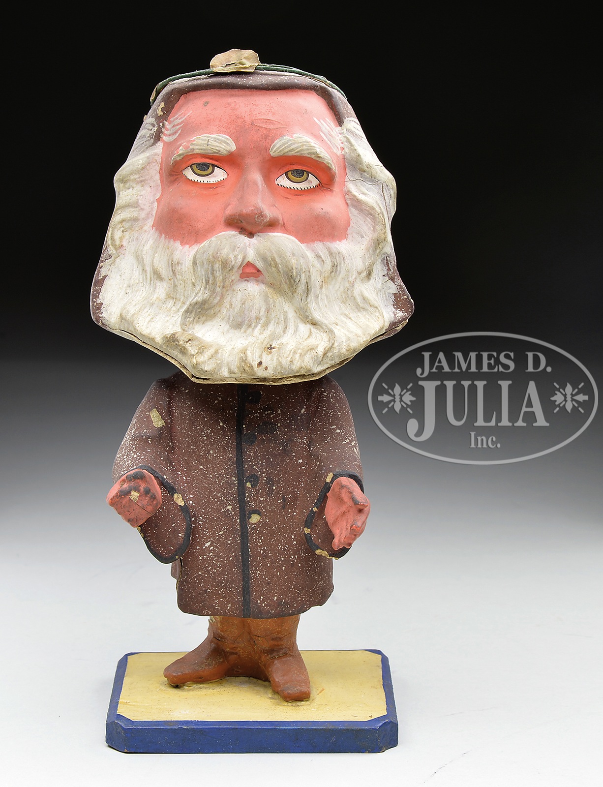 FABULOUS GERMAN COMPOSITION NODDING HEAD SANTA.Brown coated nodding head Santa has beautiful hand-painted facial features with green garland attached to head. Hand would have held feather tree. A great look to this oversize headed Christmas figure. SIZE: 9-1/2″ t. CONDITION: Small area of composition material missing to side of head and light overall soiling – still good to very good. 1-13944 (600-1,200) – Lot 3511 Auction: Advertising, Toy & Doll - Spring 2014 Please Note: All prices include the hammer price plus the buyer’s premium, which is paid by the buyer as part of the purchase price. The prices noted here after the auction are considered unofficial and do not become official until after the 46th day. |