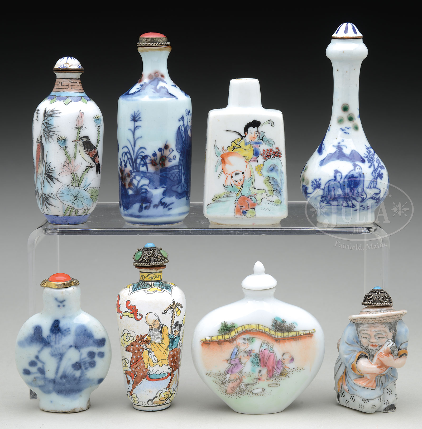 LOT OF EIGHT SNUFF BOTTLES.China. 20th century. The lot consisting of six porcelain examples of various form along with two enamel on copper bottles. SIZE: Tallest 3″ h. Smallest 2″ h. CONDITION: Overall very good. Some stoppers missing spoons. 51863-7 (700-900) – Lot 3511