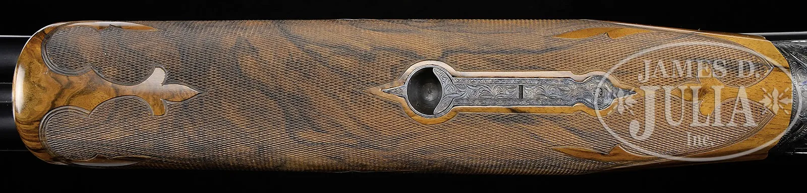*PARKER INVINCIBLE UPGRADE BY PACHMAYR.SN 235974. Cal. 12 ga. No. 1-1/2 Frame. 2-3/4″ Chambers. Starting with a DHE with ventilated rib, single trigger, and beavertail forend, Pachmayr created this unusual Parker and donated it to “Ducks Unlimited” according to gold oval on pistol grip cap. 32″ Bbls with orig Parker ventilated rib, are gold inlaid “CUSTOM BY PACHMAYR” on rib. Bbl flats are stamped with Parker proofs and “INV” and “9”. There are 2-1/2″ triangles of scrolled acanthus engraved on breech ends of bbls, and 1″ triangles at muzzles. Typical action has been customized with the addition of ornamental sideplates, as well as side clips. Rear of fences have been nicely filed with four beads. Top lever has filed in chevron, and pierced scrolled thumbpiece. Single selective trigger has been gold-plated. Action is engraved with full coverage large, shaded, scrolled acanthus with floral highlights. “PARKER BROS” is gold inlaid on each side of action. Water table has been engine turned and stamped “INV” and “9” above and below SN. Blued, scroll and floral engraved trigger guard has SN gold inlaid at grip. Finely marbled, flesh-toned European walnut capped pistol grip buttstock measures 15″ over brown Old English pad. Checkering at grip is of fleur-di-lis pattern, and has mullered borders and fleur-di-lis flourishes into butt. Pistol grip cap has inlaid gold oval engraved “DONATED BY Nan and Frank Pachmayr to DUCKS UNLIMITED.” Matching beavertail ejector forend has reinforcing bolt. Iron is engine turned and marked “INV” and “9”. Bore diameter: left-.733, right -.733. Bore restrictions: left -.035 (Full), right -.017 (Light mod). Minimum wall thickness: left -.030, right -.030. Drop at heel: 2″, drop at comb: 1-3/8″. Weight: 8 lbs. 7 oz. LOP: 15″. CONDITION: Excellent, nearly new as custom finished, retaining nearly all fine finishes on wood and metal, with only a few light marks, mostly on butt. Bores are excellent. Action is tight. Ejectors are in time. Trigger works. 4-49552 MGM134 (8,000-12,000) – Lot 3512