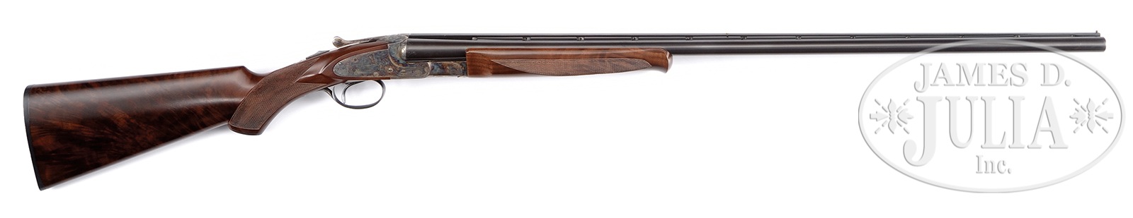 *TRULY EXCEPTIONAL HIGH CONDITION L.C. SMITH SPECIALTY GRADE 20 GAUGE SHOTGUN.SN 128457. Cal. 20 ga. 2-3/4″ Chambers. 30″ bbls with full length ventilated matted top rib. Ivory mid bead and small brass front sight. Tops of bbls marked “L.C. Smith Specialty Grade” on right and “Hunter Arms Co. Inc. M’F’R’S Fulton N.Y. U.S.A.” Water table with SN and grade designation. Same marking found on bbl flats and reinforced bbl lug for beavertail forearm. Hunter One SST, automatic ejectors and non-automatic safety. Capped pistol grip buttstock is checkered in 2-point pattern with flame grained American walnut with a crisp lined HRBP. Beavertail forearm with banjo roll-type release and proper reinforcing bolt, checkered in 3-point pattern, lockplates are engraved with quail on left, flying goose in marsh on right surrounded by foliate scrolls in typical Specialty grade pattern. Bottom of frame lightly scroll engraved as is trigger plate and trigger guard bow. SN noted at tang. Top of frame with light open scroll work. Bore diameter: left – .660, right – .660. Bore restrictions: left – .024 (mod), right – .020 (mod). Minimum wall thickness: left – .036, right – .038 . Weight: 7 lbs. 4 oz. Drop at comb: 1-7/16″, drop at heel: 2-5/16″. LOP: 14-1/2″ from rear position sgl trigger. PROVENANCE: Remarkable William Larkin Moore Private Estate Collection of Fine Sporting Arms. Special Note: This item(s) contains plant or animal properties that may be covered by the Endangered Species Act (ESA). We have taken care to ensure that this item(s) meets the standard for sale under the ESA. However, certain states and other countries have laws that are more restrictive than the ESA. It is the bidder’s responsibility to ensure that it is lawful to purchase or transport this item(s) into their state, and to obtain the necessary import and export approvals. Delay or failure to obtain any such permit or approval does not relieve the buyer of paying for the item(s) and consummating the purchase. CONDITION: Truly exceptional collector quality. Bbls retain virtually all of their factory orig rust blue finish just starting to tone. Receiver retains nearly all of its dark, bold and vivid orig case color particularly strong on side locks starting to tone on bottom of frame near lug and at high points. Buttstock and forearm are superb as expertly restored. Checkering is extremely crisp and sharp. Buttplate is near mint. Breech face shows only scant evidence of shell marking indicating a very lightly used gun that has survived in near mint orig condition. 50594-27 JSL (6,000-10,000) IVORY – Lot 3512