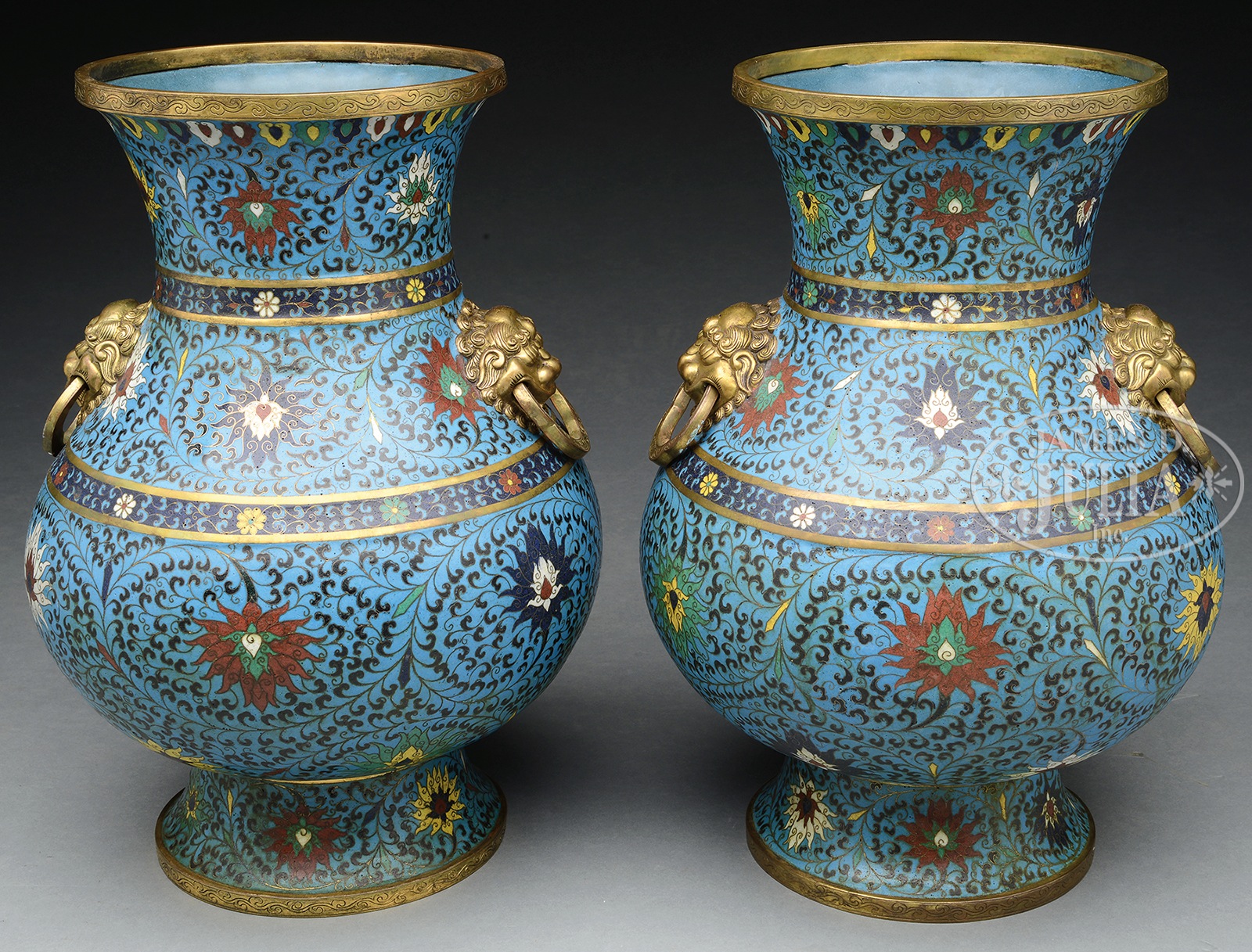 PAIR OF CLOISONNE VASES, HU.China, 20th c. Of baluster form, the vase’s body with flowers and foliage patterns, two gilt lion masks on the side with ruyi shaped handles, the bottom bears four character mark. SIZE: 14″ h. CONDITION: Age related wear and discoloration. 7-75505 (5,000-7,000) – Lot 3513