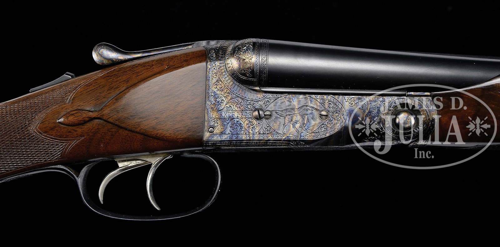 *VERY FINE 20 GAUGE PARKER CH UPGRADE BY RUNGE.SN 172139. Cal. 20 ga. 0 Frame. 2-3/4″ Chambers. 26″ Bbls are marked “Acme Steel” on matted top rib. Bbl flats have been re-marked to have correct markings. Case hardened action features automatic safety and nickel-plated double triggers. Water table has been re-marked to reflect upgrade. Action is engraved in typical “C” style with nicely detailed dogs on either side surrounded by medium scroll with line and geometric borders. Trigger plate depicts a pointer on point with flushing pheasant in hilly background. “PARKER BROS” is on rectangle on each side of action. Border above front arch of trigger plate is engraved in very small capitals “ENGR R P RUNGE ILION NY 79”. Flame figured American walnut straight grip buttstock measures 14-3/8″ over skeleton steel buttplate and features lozenge-shaped drop points, scallop patterned checkering with mullered borders, and a silver oval on toe line engraved “L”. Matching beavertail forend has typical release and reinforcing bolt. Bore diameter: left-.615, right -.617. Bore restrictions: left -.018 (Mod), right -.006 (IC). Minimum wall thickness: left -.026, right -.030. Drop at heel: 2-3/8″, drop at comb: 1-1/2″. Weight: 6 lbs. 12 oz. LOP: 14-3/8″. PARKER GUN IDENTIFICATION AND SERIALIZATION ledger confirms that this was converted from “VH” with capped pistol grip. CONDITION: Excellent, essentially as new, since upgrade. with only a few very minor marks in all fine wood and metal finishes. Bores are excellent. Action is tight. 4-50361 MGM233 (6,500-11,500) – Lot 3514