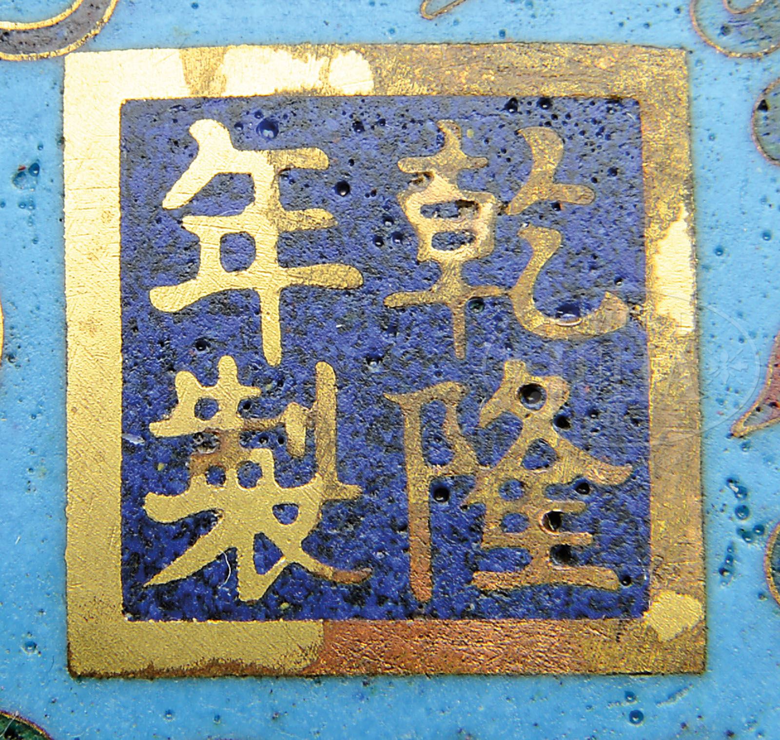 PAIR OF CLOISONNE INCENSE BURNERS. 19th century, China. Decoration of Kuei dragon scrolls on a turquoise ground. Pierced repousse gilt tops with a design of lotus, dragons, and clouds. Ch’ien Lung mark on base. SIZE: 13″ h x 7-1/2″ w. CONDITION: Very good. 9-91040 (600-800)