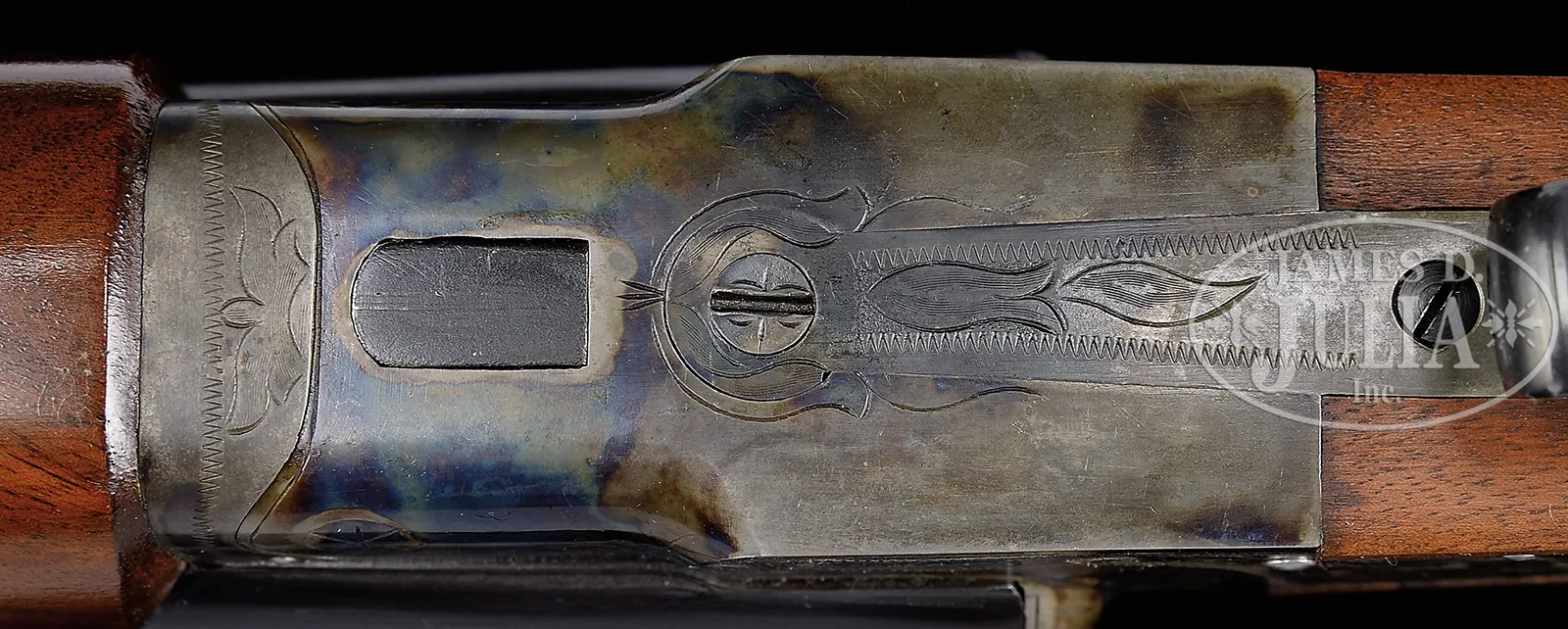 *HIGH ORIGINAL CONDITION 20 GAUGE L.C. SMITH “IDEAL” GRADE SHOTGUN WITH EJECTORS, SINGLE TRIGGER, AND BEAVERTAIL FOREND.SN FWS38049. Cal. 20 ga. 2-3/4″ Chambers. 28″ Bbls with raised, matted, single sighting plane, solid rib are marked “L. C. SMITH – 20 GA – IDEAL – FULTON, N.Y. U.S.A.” on top right bbl. Bbl flats are stamped with SN, grade, chambers, and proofs; bottoms of bbls with “LONDON STEEL”. Typical case hardened, small sized, featherweight action has all correct marks on water table, and features non-automatic safety and Hunter One trigger. Action and lockplates are engraved in typical “Ideal” fashion with large acanthus. “L. C. SMITH” is stamped on each lockplate. Blued trigger guard with some engraving on bow, has SN on tang. Lightly figured American walnut capped pistol grip buttstock measures 14″ over ribbed composition buttplate. Standard point pattern checkering is at grip. Matching, short, swept late style beavertail ejector forend has typical J-spring and knurled button release in oval steel escutcheon. Bore diameter: left -.608, right – .608. Bore restrictions: left – .028 (full), right – .019 (mod). Wall thickness: left – .038, right – .038. Drop at heel: 2-7/16″, drop at comb: 1-3/8″. Cast: Neutral. Weight: 7 lbs. 3 oz. LOP: 14″. PROVENANCE: Remarkable William Larkin Moore Private Estate Collection of Fine Sporting Arms. CONDITION: Excellent, near to new. Bbls retain nearly all of their orig lustrous blue, with only one or two light handling marks. Action retains approx 98% orig case hardening color with only a hint of high edge wear. Blue of trigger guard is excellent. Blue on forend escutcheon is slightly flaked. There are only a few light marks in all orig stock finish, checkering light in color. Bores are excellent. Trigger needs help in setting up for second shot (in need of lubrication?) when in right bbl first mode. Ejectors are in time. A crisp little “Ideal” grade that handles well. 50594-31 MGM144 (6,000-10,000) C&R – Lot 3515
