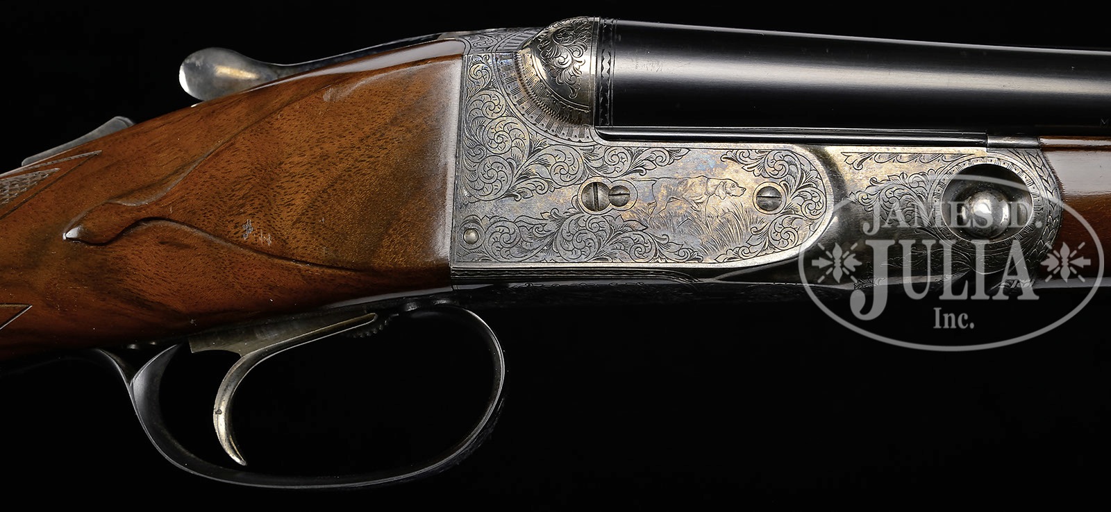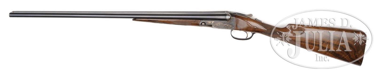 *28 GAUGE PARKER REPRODUCTION DHE WITH CASE.SN 28-00436. Cal. 28 ga. 2-3/4″ Chambers. 26″ Bbls with Winchester reproduction markings, are choked improved cylinder and modified. Case hardened action has lightening cuts in water table, and is engraved in typical “D” style with simple, large scroll surrounding dogs on sides, and pheasants on bottom of action along with “PARKER”. Nicely marbled and figured claro walnut straight grip buttstock measures 14-1/4″ over skeleton steel buttplate, and features typical drop points and checkering. Splinter ejector forend has wood that matches buttstock. Drop at heel: 2-1/4″, drop at comb: 1-3/8″. Weight: 5 lbs. 8 oz. LOP: 14-1/4″. Leather case with leather corners has tan canvas leather trimmed outer cover. Case is lined in green felt, and has Parker reproduction label in lid, and contains 2-pc walnut and brass cleaning rod and Parker marked square oil bottle. CONDITION: Excellent, retaining over 90% orig finish on bbls, thinned slightly, and with a number of marks. Action retains approx 75% of its orig color, thinning and silvering from normal hand wear. Stocks have a number of scratches and marks, and some light scuffs in their orig finish, with a fairly deep ding in checkering at right of grip. Bores are excellent. Action is tight. Mechanically fine. Case leather is excellent, outer cover has some slight discoloration and scuffs. Interior of case is excellent. 4-49280 MGM132 (3,000-5,000) – Lot 3516