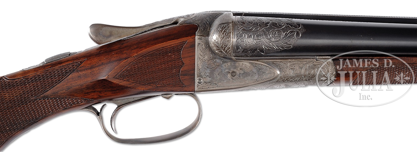 Please Note: The barrel was professionally shortened to 26″. *EXCELLENT FOX XE 20 GAUGE SHOTGUN.SN 201415. Cal. 20 ga. 26″ bbls with a 2-3/4″ chambers. Full length matted top rib with twin ivory beads and left tube marked “Chromox Fluid Compressed Steel”, right tube marked “Made by A.H. Fox Gun Co. Phila. PA. U.S.A.”. Nice wedge with oak leaf scroll at breech. Kautzky SST, automatic ejectors, automatic safety. Round knob full pistol grip buttstock with checkered side panels and checkered in 2-pt pattern near frame and wave pattern towards comb. Older replacement silvers type pad at butt. Case hardened trigger guard. Slender splinter forearm, near fully checkered and Deeley release engraved in light oak leaf pattern with finely shaped triangular ebony tip. Receiver is full coverage oak leaf pattern engraved with ducks in marsh scene on left, quail on right. Bottom of frame with fox in oval and trigger plate which is fully oak leaf engraved. Trigger guard is nicely oak leaf engraved with shield at bow and SN noted at tang. Top of frame, bbl fences and top lever in oak leaf pattern as is top tang. Bore diameter: left – .618, right – .618. Bore restrictions: left – .007 (imp/cyl), right – .002 (skeet). Minimum wall thickness: left – .030, right – .022 . Weight: 5 lbs. 10 oz. Drop at comb: 1-9/16″, drop at heel: 2-1/2″. LOP: 13-7/8″. PROVENANCE: Remarkable William Larkin Moore Private Estate Collection of Fine Sporting Arms. Special Note: This item(s) contains plant or animal properties that may be covered by the Endangered Species Act (ESA). We have taken care to ensure that this item(s) meets the standard for sale under the ESA. However, certain states and other countries have laws that are more restrictive than the ESA. It is the bidder’s responsibility to ensure that it is lawful to purchase or transport this item(s) into their state, and to obtain the necessary import and export approvals. Delay or failure to obtain any such permit or approval does not relieve the buyer of paying for the item(s) and consummating the purchase. CONDITION: Excellent. Bbls retain 97-98% orig blued finish. Receiver retains 40-50% orig case color. Engraving still quite crisp and clear with very little wear. Trigger guard retains approximately 50% orig color, mostly on bow, starting to tone at tang. Buttstock & forearm are superb and retain nearly all of a professional restored hand-rubbed finish. Checkering is extremely sharp and there are just a couple of minor handling marks throughout. Trigger works flawlessly, mechanics are crisp, action is tight. This is an outstanding investment grade small bore Fox. 50594-21 JSL (12,500-17,500) IVORY – Lot 3517 Click here to view provenance
