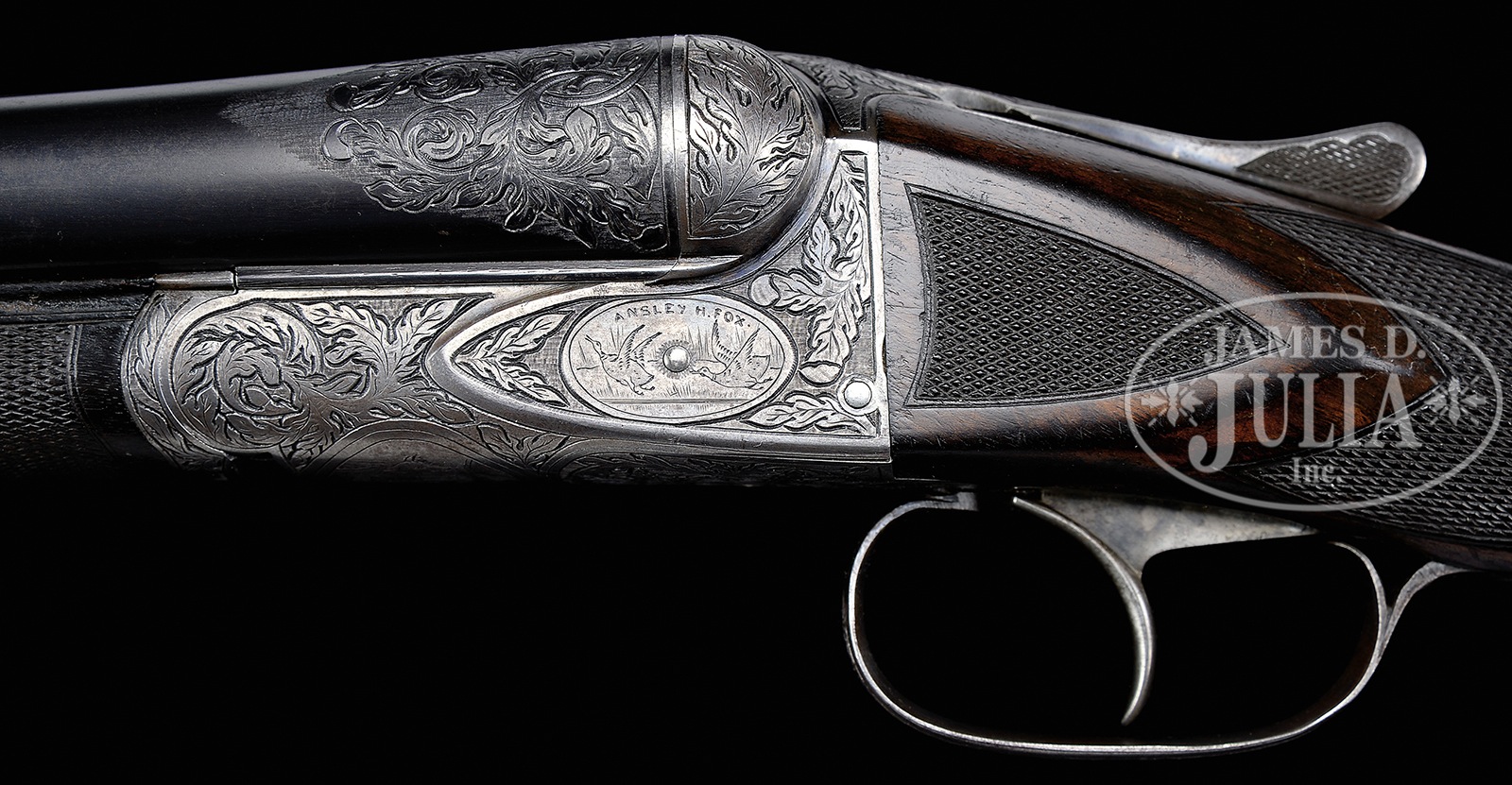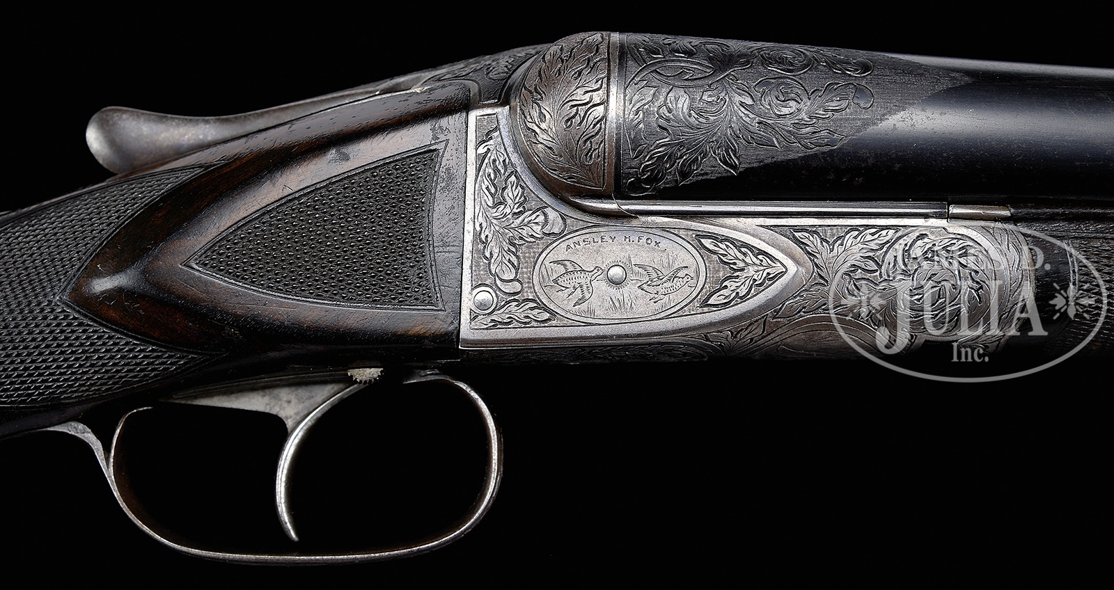 *LOVELY A.H. FOX XE GRADE SHOTGUN.SN 21812. Cal. 12 ga. 28″ bbls, 2-3/4″ chambers, IC/M chokes. Bbl wedge engraving. Double ivory beads. Concave rib. Krupp steel bbls. Deeply engraved receiver & metal work in X grade style with 2 ducks on left, 2 quail on right & “low head” fox on belly. Kautzky single selective trigger in center position. Auto ejectors. Splinter forend with ribbon in checkering pattern. Buttstock is nicely grained & figured with ribbon in grip checkering. Solid red Silvers pad. LOP 14-1/8″ over pad. DAC 1-3/4″. DAH 2-7/8″. Auto safety. Special Note: This item(s) contains plant or animal properties that may be covered by the Endangered Species Act (ESA). We have taken care to ensure that this item(s) meets the standard for sale under the ESA. However, certain states and other countries have laws that are more restrictive than the ESA. It is the bidder’s responsibility to ensure that it is lawful to purchase or transport this item(s) into their state, and to obtain the necessary import and export approvals. Delay or failure to obtain any such permit or approval does not relieve the buyer of paying for the item(s) and consummating the purchase. CONDITION: Bbls retain a majority of blue, with thinning & handling marks. Bbls appear professionally shortened with chokes opened. Small hole drilled in left bbl flat. Receiver & metal work have toned to a pleasing silver. Screws very nice. Forend is shorter than typically seen with flat ebony wedge tip, gives the appearance of factory work. Color of forend is darker than buttstock. Nice finish on buttstock with light bumps & handling marks. Pad is compressed at heel & chipping at toe. Top lever at center. Gun is tight, crisp mechanics, strong ejectors slightly out of time. 51026-4 TJW (6,500-11,500) C&R; IVORY – Lot 3518