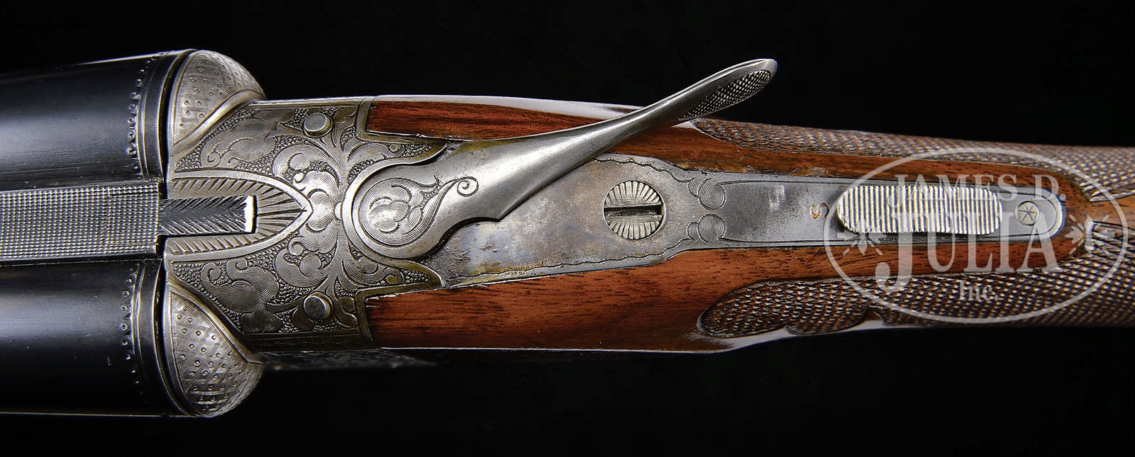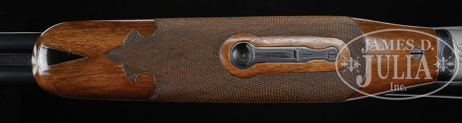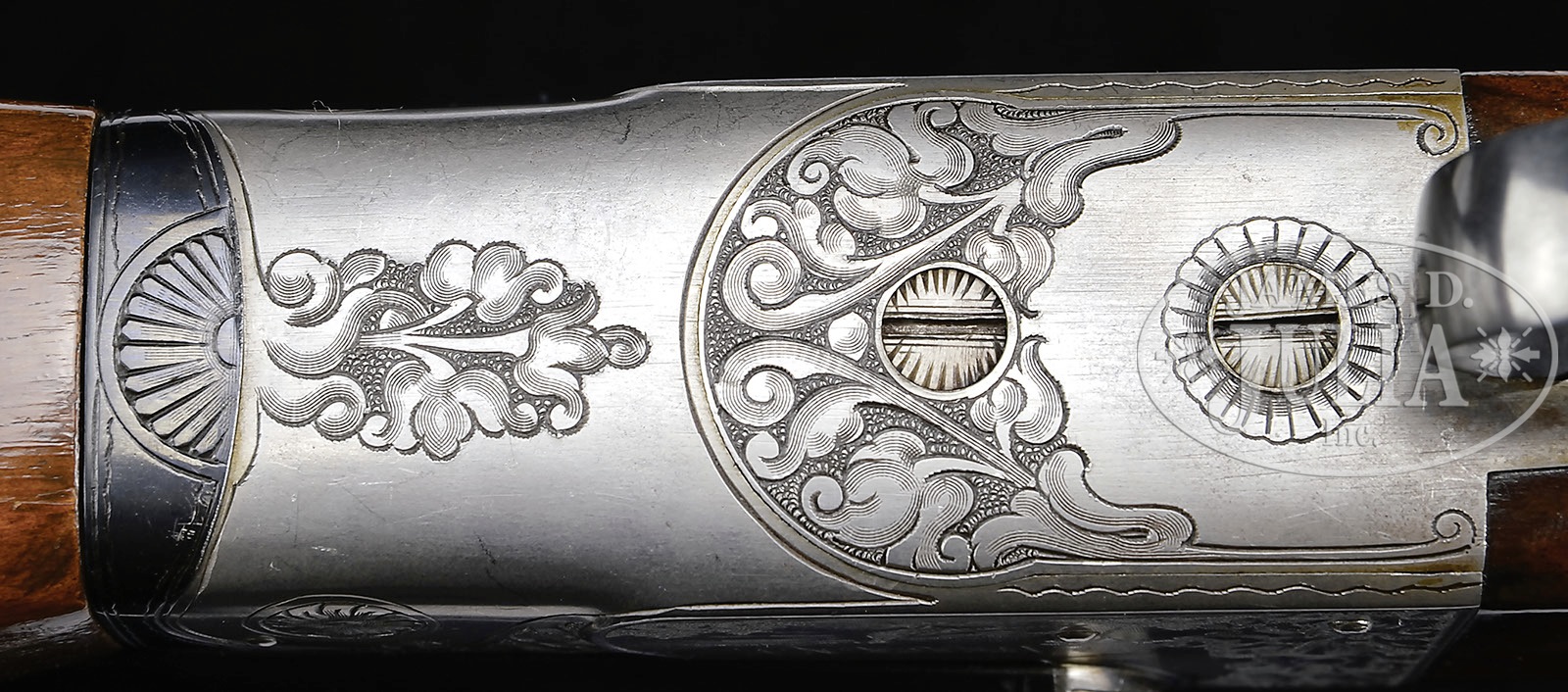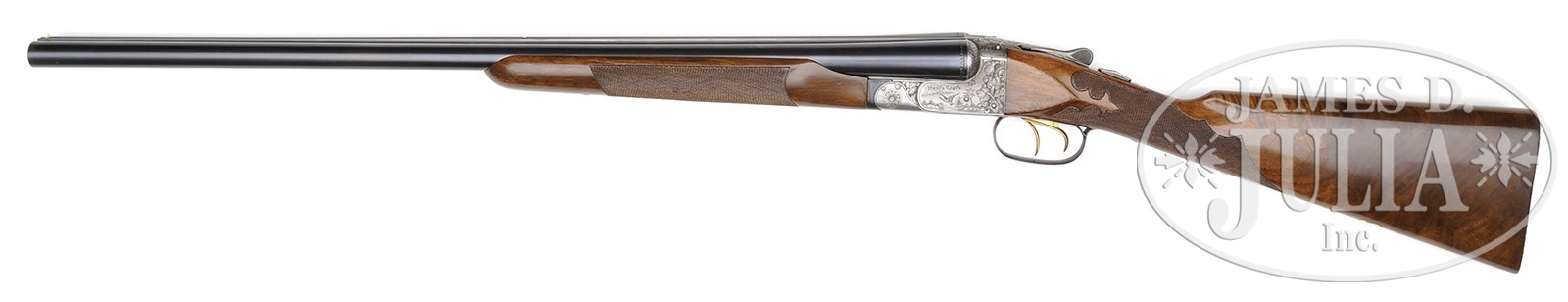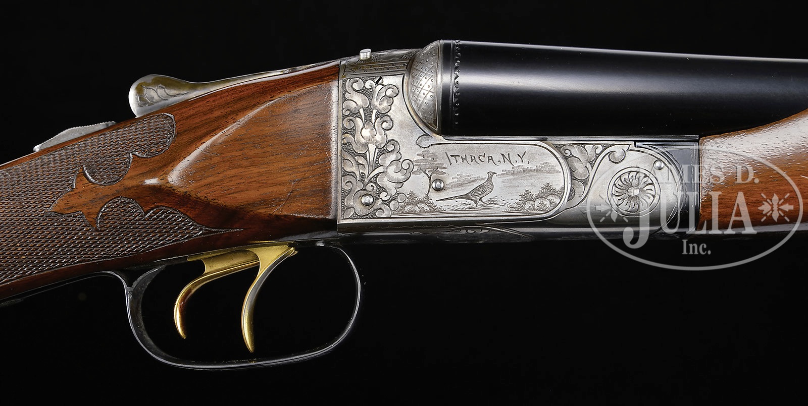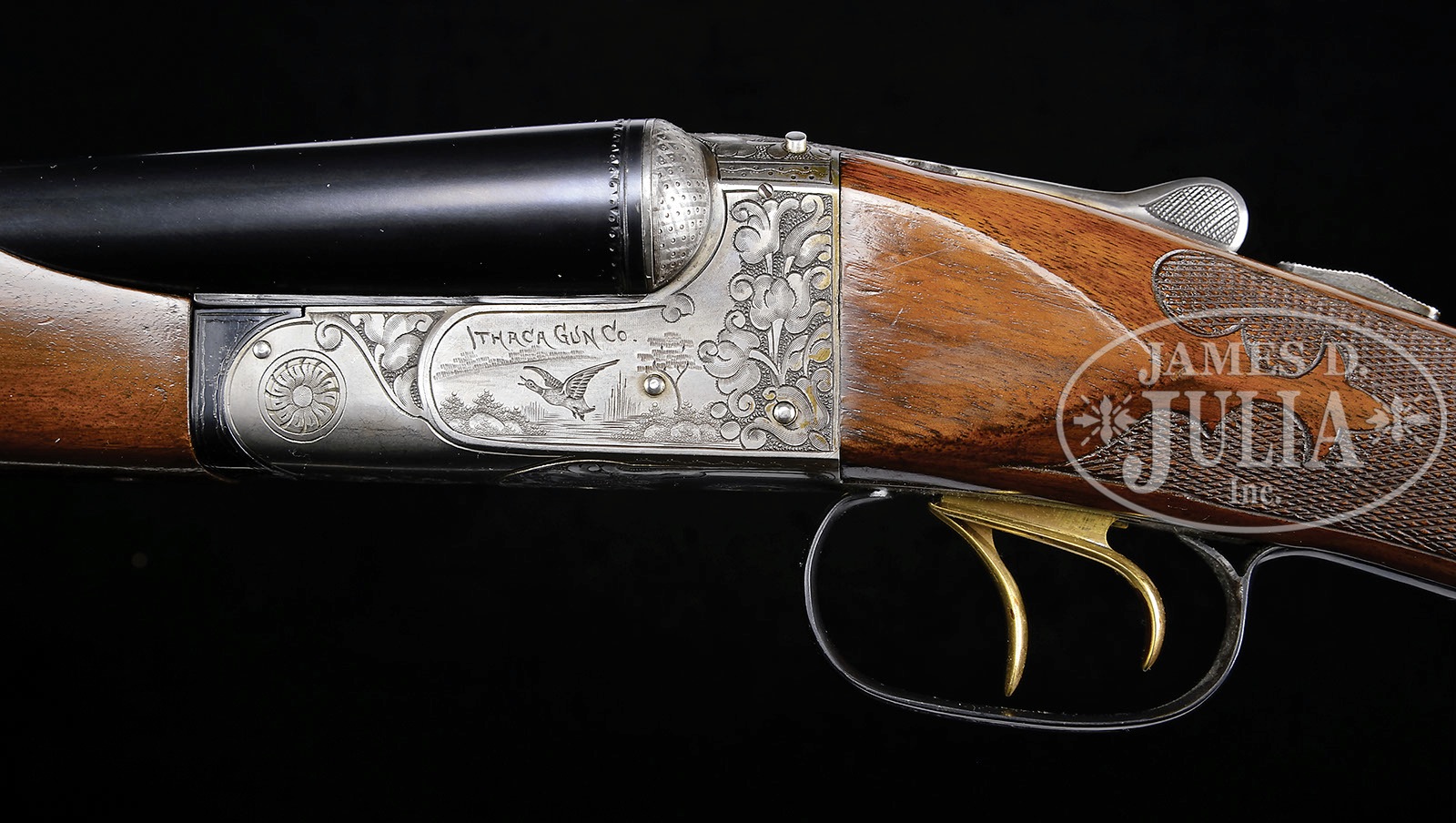 *16 GAUGE ITHACA GRADE 4 NID.SN 448937. Cal. 16 ga. 2-3/4″ Chambers. 26″ Bbls with concave, matted rib are stamped with SN, grade, and “2-3/4” on engine turned bbl flats. Bottoms of bbls are stamped “BEST FLUID STEEL”. Case hardened NID boxlock action features pin type cocking indicators, automatic safety, and gold-plated double triggers. Action is engraved with large open scrolled acanthus with stippled backgrounds and line borders surrounding vignettes of game bird on each side; a mallard flies over swamp on left, and a perched pheasant is in field on right. Trigger guard with scroll on bow has SN at grip. Slight feather crotch figured American walnut straight grip buttstock measures 13-7/8″ over checkered wood butt. There is fancy borderless fleur-di-lis checkering at grip. A vacant gold shield is on toe line. Matching beavertail forend has inset ebony tip, and Deeley type release. Bore diameter: left-.673, right -.674. Bore restrictions: left -.014 (Mod), right -.011 (IC). Minimum wall thickness: left -.024, right -.019. Drop at heel: 2-1/16″, drop at comb: 1-5/8″. Weight: 6 lbs. 7 oz. LOP: 13-7/8″. PROVENANCE: Estate Collection of John Houchins. CONDITION: Very fine, as partially refinished. Bbls retain nearly all of an old re-black. Action retains 30% orig case hardening color, strong where protected, considerably silvered from normal carry wear. Triggers retain most of their gold plate. Stocks retain nearly all what appears to be their orig finish with oil rubbed in as maintenance. Forend iron and trigger guard have been re-blued and retain essentially all of that blue. Checkering has not been re-cut. Bores are excellent. Action is tight. An unusual NID in skeet configuration. 4-50872 MGM252 (3,000-5,000) – Lot 3519