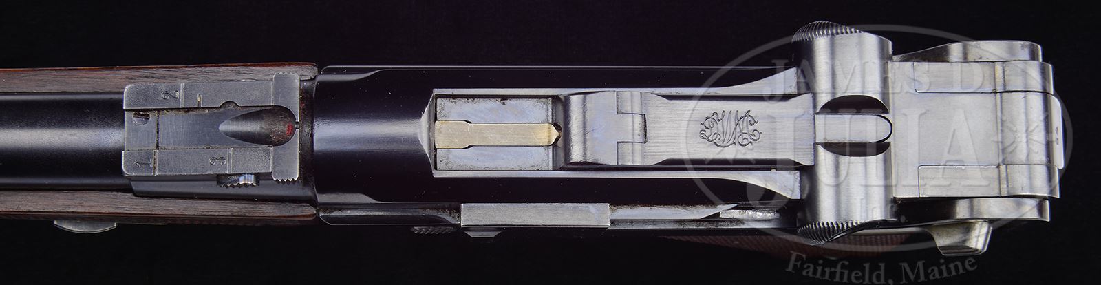 *DWM 1902 LUGER CARBINE WITH MATCHING STOCK & ACCESSORIES IN PRESENTATION CASE.SN 24484. Cal. .30 Luger. Standard M1902 carbine with 11-3/4″ bbl and 3 position rear sight, marked “1,2,3” and ramp front with bead insert. Early flat top breech block, middle toggle link with intertwined “DWM” and dished toggle ears with anti-rebound spring. Left side of receiver proofed with crown/B and crown/U. The full SN is under the bbl and repeated on the receiver lug. Extensive takedown shows all matching numbers including the forend, takedown lever, sideplate, trigger, usual toggle linkages and grip safety. The crisply checkered walnut grips are unnumbered. Correct magazine with tin plated body and wood base having flaming bomb acceptance. Orig buttstock made of European walnut has a matching 2-screw iron that has been refinished. Stock is checkered at grip area and ends in ribbed horn buttplate. Correct sling swivels on both forend and buttstock. Contemporary wood presentation case measuring 18-1/2″ x 9-1/2″ x 2-3/4″, lined in red velvet and compartmentalized for separate placement of pistol, buttstock and accessories that include a Swiss screwdriver combination tool, a WWI takedown tool and two spare magazines. One of the spares is a WWI military magazine renumbered to match the pistol; the other spare is from a Swiss 1929 Bern, brown base, numbered to match the pistol. Secured with a single keyed lock, key supplied. CONDITION: Pistol with 98% rust blue with the bbl having a slightly darker hue than the balance of the pistol. Sharp edge wear as expected. Small parts with approx 95% orig straw. Stock iron with nearly 100% restored blue. Body of stock excellent retaining most orig varnish and light scattering of handling dings. Stock with two hairline cracks extending up from the buttplate, each measuring about 2-1/2″. Excellent orig buttplate with minor losses commensurate with overall condition of buttstock. Dull bore with sharp rifling. Perfect manual mechanics. VG spare magazines with renumbering as noted. Good condition Swiss combination tool. Case with expected storage & handling marks. Interior scuffed and with velvet showing moderate losses. 49432-148 LMA C&R (15,000-25,000) – Lot 3519