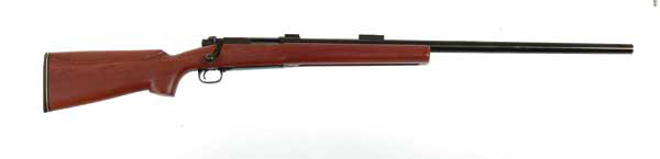 *WINCHESTER EXPERIMENTAL MODEL 70 SOLID ACTION SINGLE SHOT RIFLE. Cal. 308. This rifle is 1 of a consecutive numbered pair in this auction. The receiver was made at the request of the U.S. Army Marksmanship Training Center at Ft. Benning, GA. It was made without top and bottom cutouts, for added strength and accuracy. The Army ordered two of these rifles from Winchester. The factory initially made four receivers in case one or more was damaged. None were damaged in the initial assembly, so two receivers remained. Mr. Max Thompson, the Manager of Rifle and Pistol Promotion at Winchester had the custom shop build these two rifles, one in Cal. 308 and the other in Cal. 225 Winchester. This rifle has a 28″ tapered heavy round bbl, 7/8″ at the muzzle. It is mounted in a heavy target stock with hand stop rail groove in the bottom (rail never installed). It has a deep pistol grip with Winchester black recoil pad. It also has an alloy Model 70 trigger guard and floorplate that covers the plug in the magazine well. The bbl and front receiver ring are mounted with Unertl-style target blocks. The normal Model 70 action cutoff is missing and a screw is inserted through the side of the receiver as a bolt stop. Accompanied by a letter from the former Director of Marketing at Winchester identifying this rifle and verifying its production. SN 905151. CONDITION: Excellent to as new. Retains virtually all its original factory finish to both metal and wood. 4-47435 (2,500-5,000)