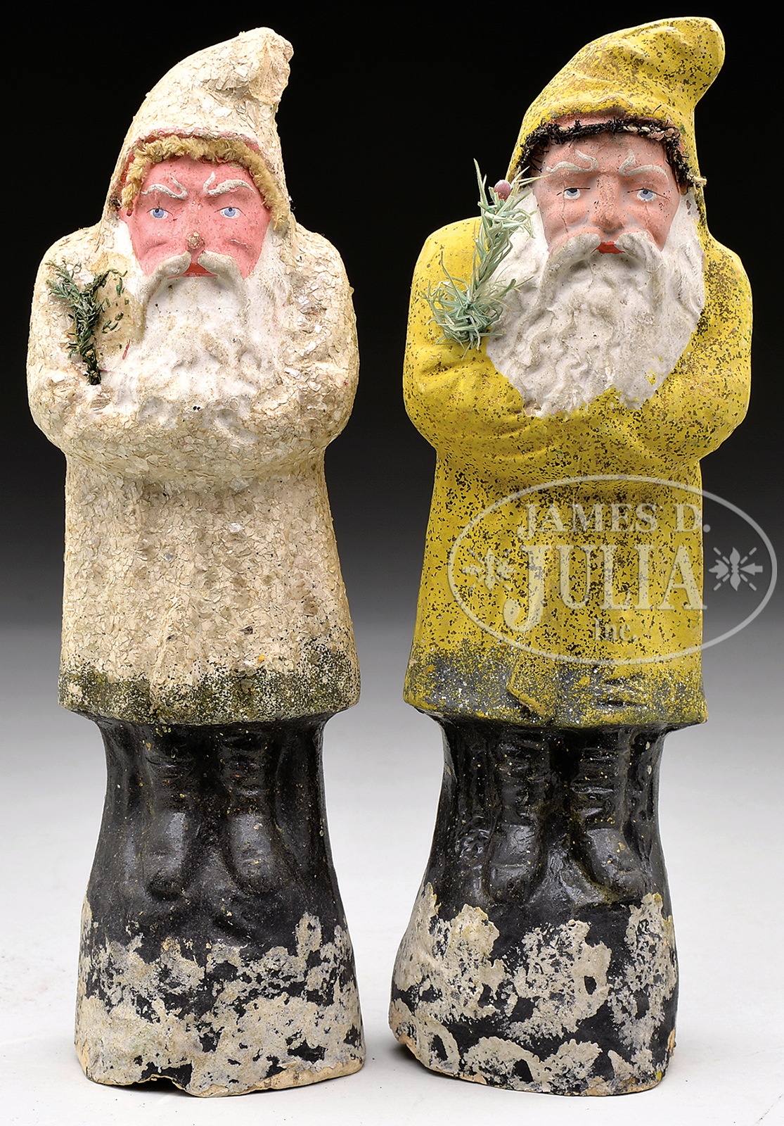 TWO LARGE GERMAN BELSNICKLES.Important lot shows a Santa dressed in yellow made from molded composition and decorated with gold glitter. A second Santa is done in white with silvery mica decoration. Both show an early appearance to face decoration. SIZE: Largest is 12″ h. CONDITION: Yellow Santa retains sprig of real feather tree and tinsel decoration-very good. White Santa has missing portion of hood. Otherwise good to very good. 1-13957 (900-1,200) – Lot 3525 Auction: Advertising, Toy & Doll - Spring 2014 Please Note: All prices include the hammer price plus the buyer’s premium, which is paid by the buyer as part of the purchase price. The prices noted here after the auction are considered unofficial and do not become official until after the 46th day. |