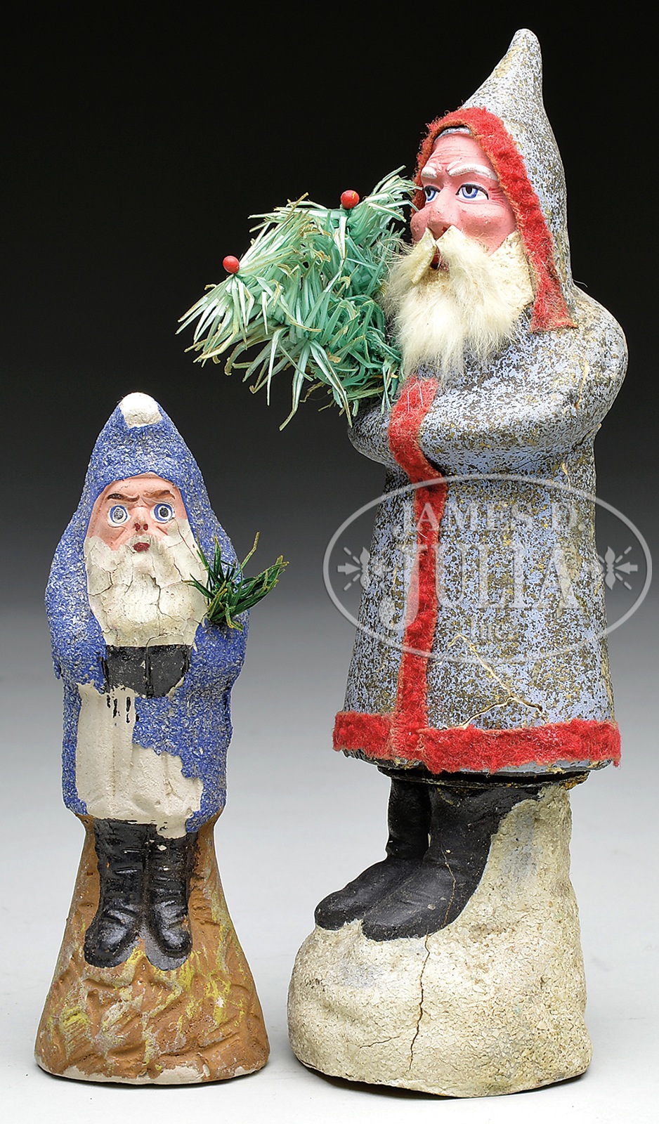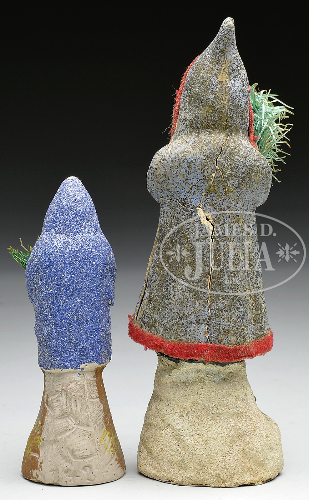 TWO STANDING BLUE FIGURAL SANTAS.Larger German Santa has rabbit’s fur beard and felt trimmings to molded composition body. Retains original feather tree sprig. Smaller Belsnickle Santa shows blue coat with mica decoration. SIZE: Larger is 9-1/2″ h. CONDITION: Larger Santa shows several cracks and separations through body and base. Smaller Belsnickle has crazing to beard area and missing blue decoration at tip of hat. 1-13958 (300-500) – Lot 3527 Auction: Advertising, Toy & Doll - Spring 2014 Please Note: All prices include the hammer price plus the buyer’s premium, which is paid by the buyer as part of the purchase price. The prices noted here after the auction are considered unofficial and do not become official until after the 46th day. |