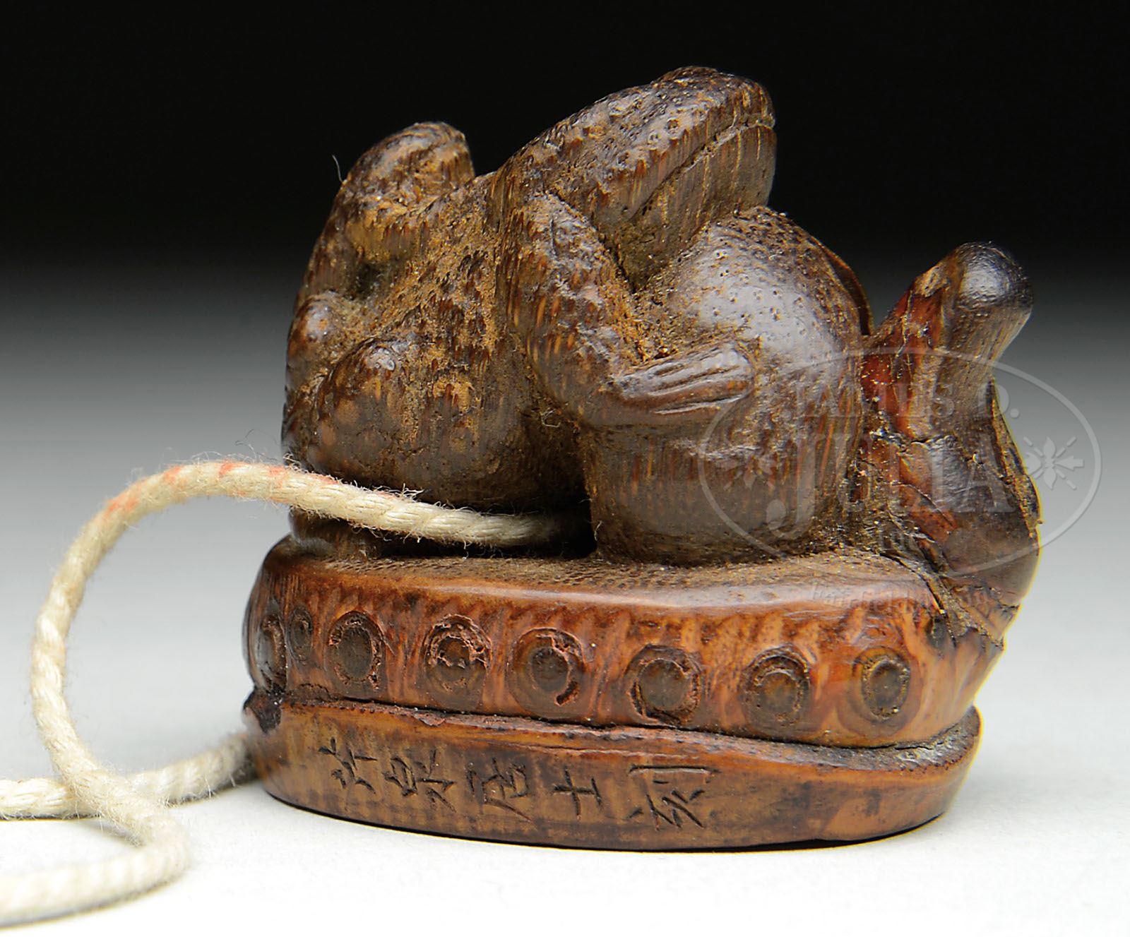 BAMBOO ROOT SEAL. 20th century, China. The seal with frog finial. Inscription on one side. SIZE: 1-1/4″ h. CONDITION: Seal intact, very good. 9-90779 (700-900)