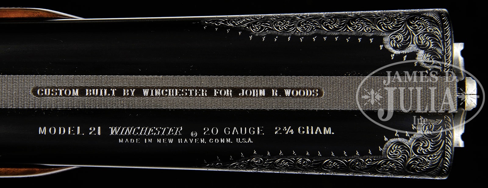 *VERY FINE WINCHESTER MODEL 21 GRAND AMERICAN WITH EXTRA BARRELS AND CASE.SN W33062. Cal. 20 ga. 26″ and 30″ Raised ventilated rib bbls are engraved “CUSTOM BUILT BY WINCHESTER FOR JOHN R. WOODS” on rear portion of ribs. Tops of left bbls are engraved with Winchester address, model and gauge. There are 3″ triangles of medium scroll at breech ends. Engine turned bbl flats are stamped with SNs, bottoms of bbls with “WINCHESTER PROOF STEEL”. 26″ Bbls are marked skeet and skeet, 30″ bbls modified and full. Each bbl set has its own forend. 26″ Bbls are stamped “1” on loop, and 30″ bbls are stamped “2”. These numbers are also stamped on their respective forends at tip of iron. Flat-sided blued action has Winchester information stamped on engine turned water table. Action is engraved with nearly full coverage of medium scroll and foliate borders surrounding vignettes of gold inlaid birds and dog; a quail is on left side of action, a pheasant is on right, with a setter on bottom. Initials “J. R. W.” are gold inlaid on trigger guard bow. Fences are deep chisel engraved in oak leaf motif. Exceptional feather crotch figured American walnut buttstock is checkered in 21-B style with fleur-di-lis and ribbons through pattern. It is fitted with black leather covered pad, and a gold oval on toe line is engraved “GRAND AMERICAN”. Matching beavertail ejector forends have engine turned iron internals and inset ebony tips. 26″ BBLS: Drop at heel: 2-3/16″. Drop at comb: 1-1/2″. Weight. 6 lbs 13 oz. LOP: 14″. 30″ BBLS: Drop at heel: 2-1/8″. Drop at comb: 1-1/2″. Weight. 7 lbs 2 oz. LOP: 14″. Fine quality brown leather case with stitched leather corners is gold embossed “J. R. W.” on top, has zippered canvas outer cover with leather trim, which is also embossed “J. R. W.” on central leather medallion. Interior is lined in burgundy cloth and has a gold embossed black leather Winchester label in lid. Case contains a pair of Winchester marked snap caps, square oil bottle, and a 2-pc brass and rosewood cleaning rod with jag, mop, and brush in black leather snap case. CONDITION: Excellent, essentially as new, with only the slightest handling marks in wood and metal. Old grease is beginning to congeal. Case leather is excellent. Outer cover is beginning to fade, and has some scuffs. Interior cloth is excellent with some areas rubbed through from contact with muzzles. Accessories are excellent. 4-51901 MGM216 (25,000-45,000) – Lot 3528