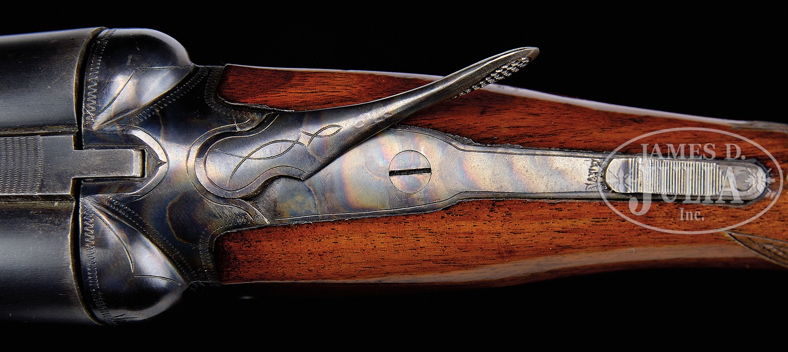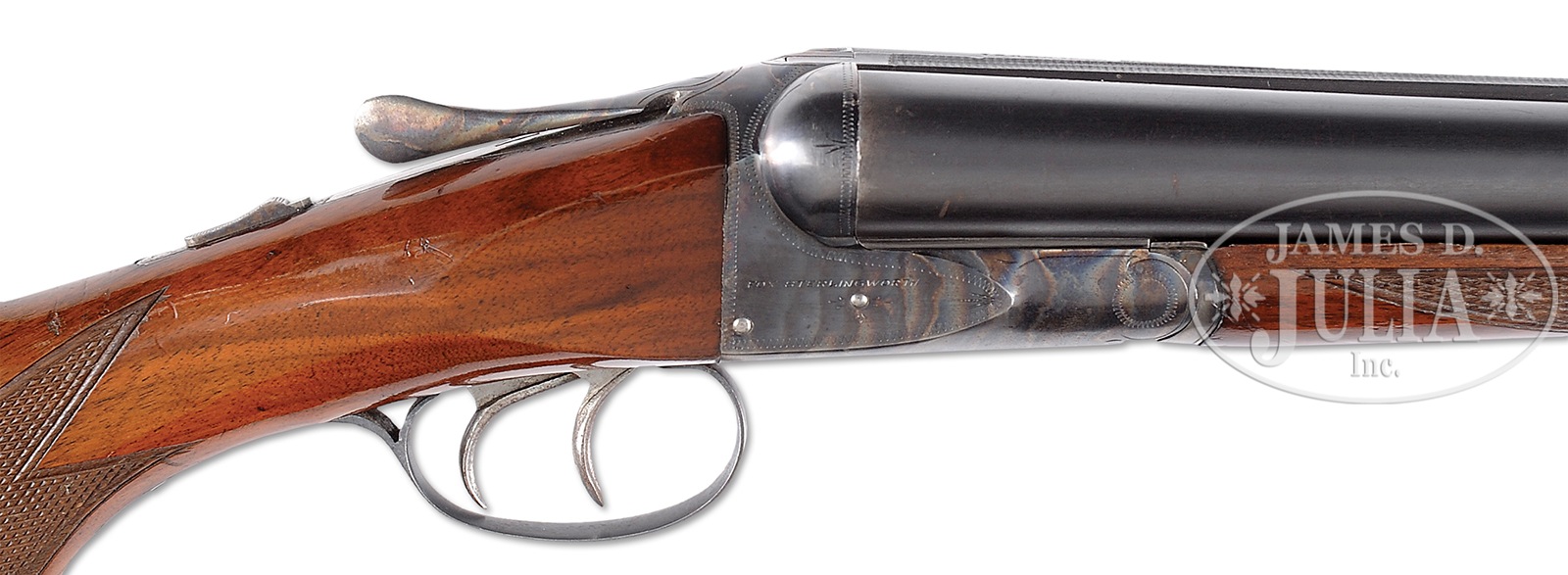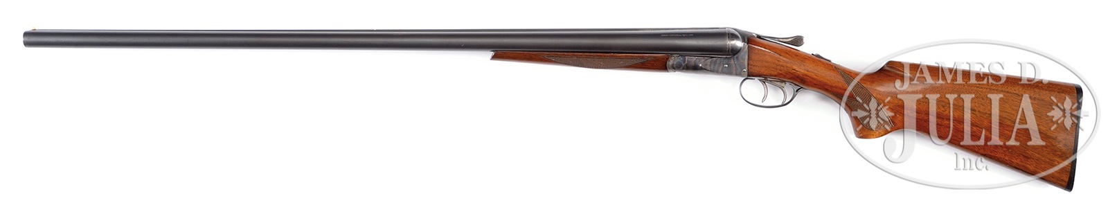 *RARE, HIGH ORIGINAL CONDITION A.H. FOX STERLINGWORTH “WILDFOWL” EJECTOR GUN.SN 134122. Cal. 12 ga. 3″ Chambers. 32″ Bbls. Sales of Super Fox guns slowed during the Great Depression and it has been surmised that in order to clear a large inventory of “Super Fox” parts, Savage Arms put together this model, which in reality is a “Super Fox” dressed down to “Sterlingworth” finish. This product idea didn’t work out as planned; total production of the Sterlingworth Wildfowl Grade is estimated at only about 35 guns! . Very heavy bbls with concave, matted rib are marked “SPECIAL ALLOY – FORGED STEEL” “SAVAGE ARMS CORPORATION, UTICA, N.Y. U.S.A.” and “PROOF TESTED – 12 GAUGE” on tops. Bbl flats are stamped with SN and “3 IN CHAMBERS”. Case hardened action featuring automatic safety and dbl triggers is wiggle border engraved and has “FOX STERLINGWORTH” on each side. Blued trigger guard has SN on tang. Plain American walnut square knob pistol grip buttstock measures 14-1/4″ over ribbed composition buttplate, and Sterlingworth type checkering is at grip. Matching shortened splinter forend with Deeley type release, instead of the normal spring friction release found on most Sterlingworths, is also fitted with Fox ejectors with patent dates stamped on iron. Bore diameter: left -.728, right – .728. Bore restrictions: left – .040 (super full), right – .040 (super full). Wall thickness: left – .048, right – .048. Drop at heel: 2-9/16″, drop at comb: 1-1/2″. Cast: Neutral. Weight: 9 lbs. 1 oz. LOP: 14-1/4″. This exact shotgun has been featured in the Winter 2015 edition of the Double Gun Journal. It was pictured in Michael McIntosh’s Fox book (Revised Edition) on page 228 and in the September 2002 American Rifleman magazine. Twin ivory beads. PROVENANCE: Callahan letter noting that this particular gun is missing from available records, but does enumerate that there are other guns in this series of the same type and states most all were shipped in 1945. He further states “I firmly believe that Savage at this late date had gotten a dealer or distributor to take these off their hands.” Copies of references on the Sterlingworth from Michael McIntosh’s book, Double Gun Journal, and American Rifleman. Special Note: This item(s) contains plant or animal properties that may be covered by the Endangered Species Act (ESA). We have taken care to ensure that this item(s) meets the standard for sale under the ESA. However, certain states and other countries have laws that are more restrictive than the ESA. It is the bidder’s responsibility to ensure that it is lawful to purchase or transport this item(s) into their state, and to obtain the necessary import and export approvals. Delay or failure to obtain any such permit or approval does not relieve the buyer of paying for the item(s) and consummating the purchase. CONDITION: Excellent, original, as found, with only a small number of minor marks in bbl blue, somewhat thin overall. Action retains over 95% orig vivid cyanide color hardening with some scattered flecking, mostly on front right. Thumbpiece slightly silvered. Blue of trigger guard is thinning a bit at grip. Stocks have a number of light scratches and rubs, as well as some chipping of orig varnish mostly around forend latch. Bores are excellent. Action is tight. Ejectors are in time. This is an extremely rare Fox, and this is the finest original condition example we have ever offered. 50539-1 (9,000-14,000) C&R; IVORY – Lot 3530 Click here to view provenance