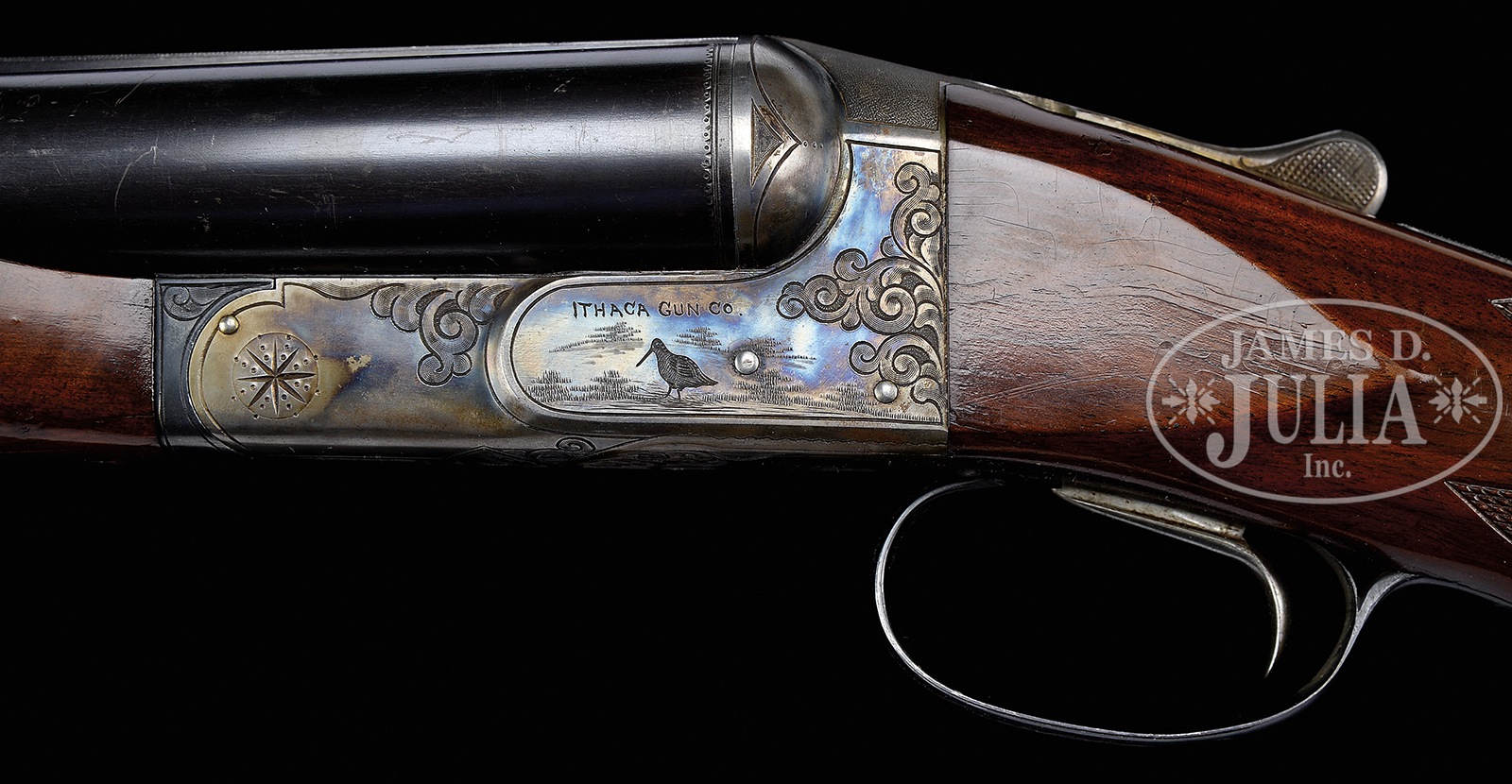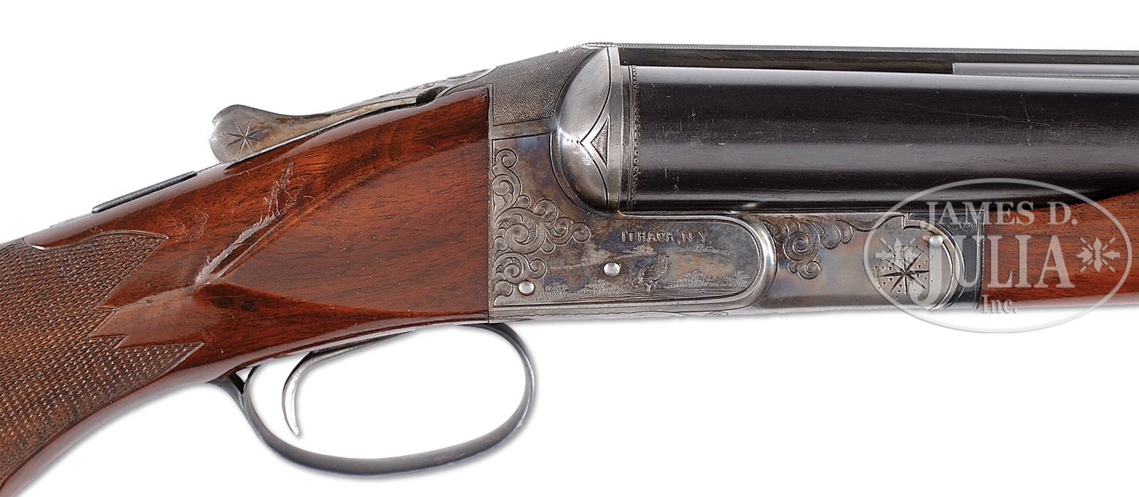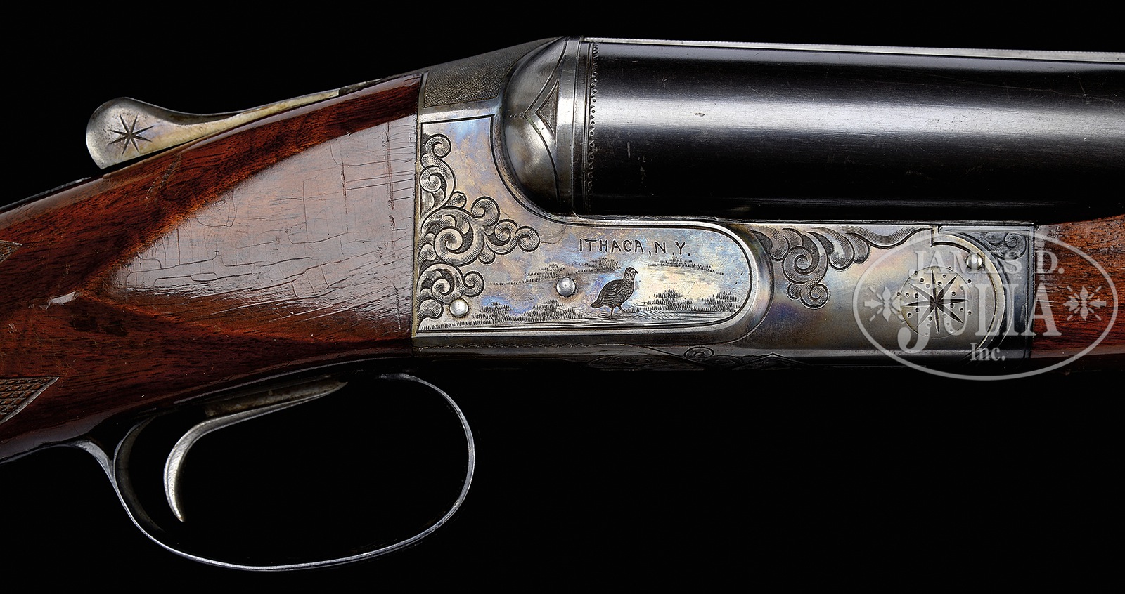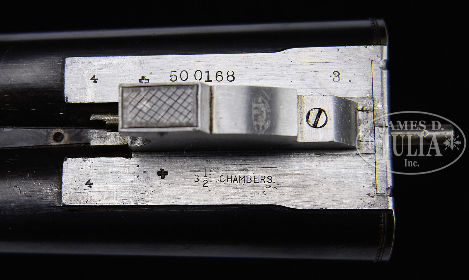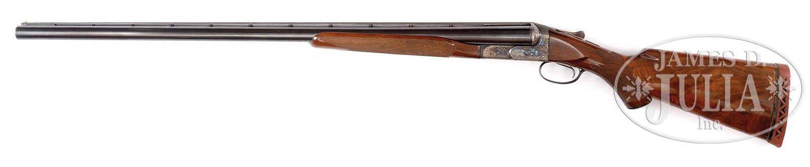 SN 500168. Cal. 10 ga. mag. 3-1/2″ Chambers. Any Ithaca 3-1/2″ mag shotgun in good condition is a treasure. This particular “3 Grade” All Option gun is most likely one of a kind. It has 32″ bbls with matted, ventilated rib. Bbl flats are stamped with SN, grade, and “3-1/2 CHAMBERS”. Case hardened NID action specially made for this cartridge, has cut through bottom to allow for protrusion of lump for added strength. It is fitted with single non-selective trigger. Action is engraved in typical “Grade 3” style, with 50% coverage large shaded scroll with stippled background. This scroll offsets scenes of birds on sides; standing snipe under “ITHACA GUN CO” on left, and a walking quail under “ITHACA, N.Y.” on right. A duck flies across marsh on bottom of action. Blued trigger guard with scroll on bow has SN on tang. Lightly figured American walnut capped pistol grip buttstock measures 13-7/8″ over open sided Hawkins pad, which appears to be original. Fancy pattern checkering is at grip. Matching large beavertail ejector forend has inset ebony tip and J-spring and Deeley type release. Bore diameter: left -.777, right – .790. Bore restrictions: left – .042 (full), right – .044 (full). Wall thickness: left – .060, right – .060. Drop at heel: 2-11/16″, drop at comb: 1-5/8″. Cast: Neutral. Weight: 11 lbs. 3 oz. LOP: 13-7/8″. Twin ivory bead sights. PROVENANCE: Remarkable William Larkin Moore Private Estate Collection of Fine Sporting Arms. Special Note: This item(s) contains plant or animal properties that may be covered by the Endangered Species Act (ESA). We have taken care to ensure that this item(s) meets the standard for sale under the ESA. However, certain states and other countries have laws that are more restrictive than the ESA. It is the bidder’s responsibility to ensure that it is lawful to purchase or transport this item(s) into their state, and to obtain the necessary import and export approvals. Delay or failure to obtain any such permit or approval does not relieve the buyer of paying for the item(s) and consummating the purchase. CONDITION: Excellent, original, as found. Bbls retain 90 – 95% orig blue with a number of light marks and dings, thinning a bit at breech ends where not protected by forend. Action retains approx 90% orig case hardening color, vivid where protected, silvering on sharp edges and fences, thinning a bit on bottom. Blue of trigger guard and forend latch remains excellent, with bow silvered a bit on sharp edges. Stocks retain over 90% orig varnish with numerous scratches and marks, a few fairly heavy. Varnish extends to mounting plate of pad where it is considerably alligatored and lifted. Checkering remains fairly light in color. There are two cracks at rear portion bottom of beavertail forend, one running from rear of latch escutcheon to iron, the other through reinforcing screw from iron into checkering. Bores are excellent, with a hint of frosting. Action is tight. Ejectors are in time. Trigger works. Walt Snyder in THE ITHACA GUN COMPANY FROM THE BEGINNING estimates 24 ten bore 3-1/2″ guns were made in number 3 grade. How many with “all options”? 50594-26 MGM137 (4,000-7,000) C&R; IVORY – Lot 3533