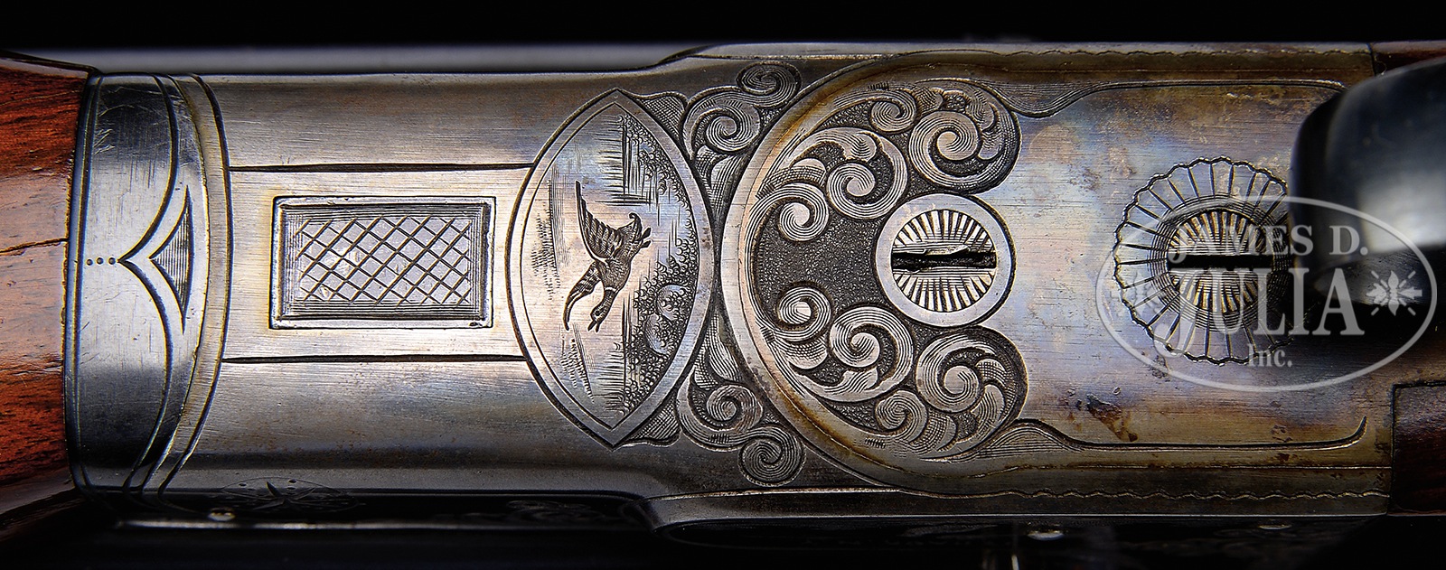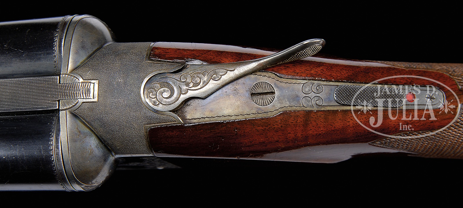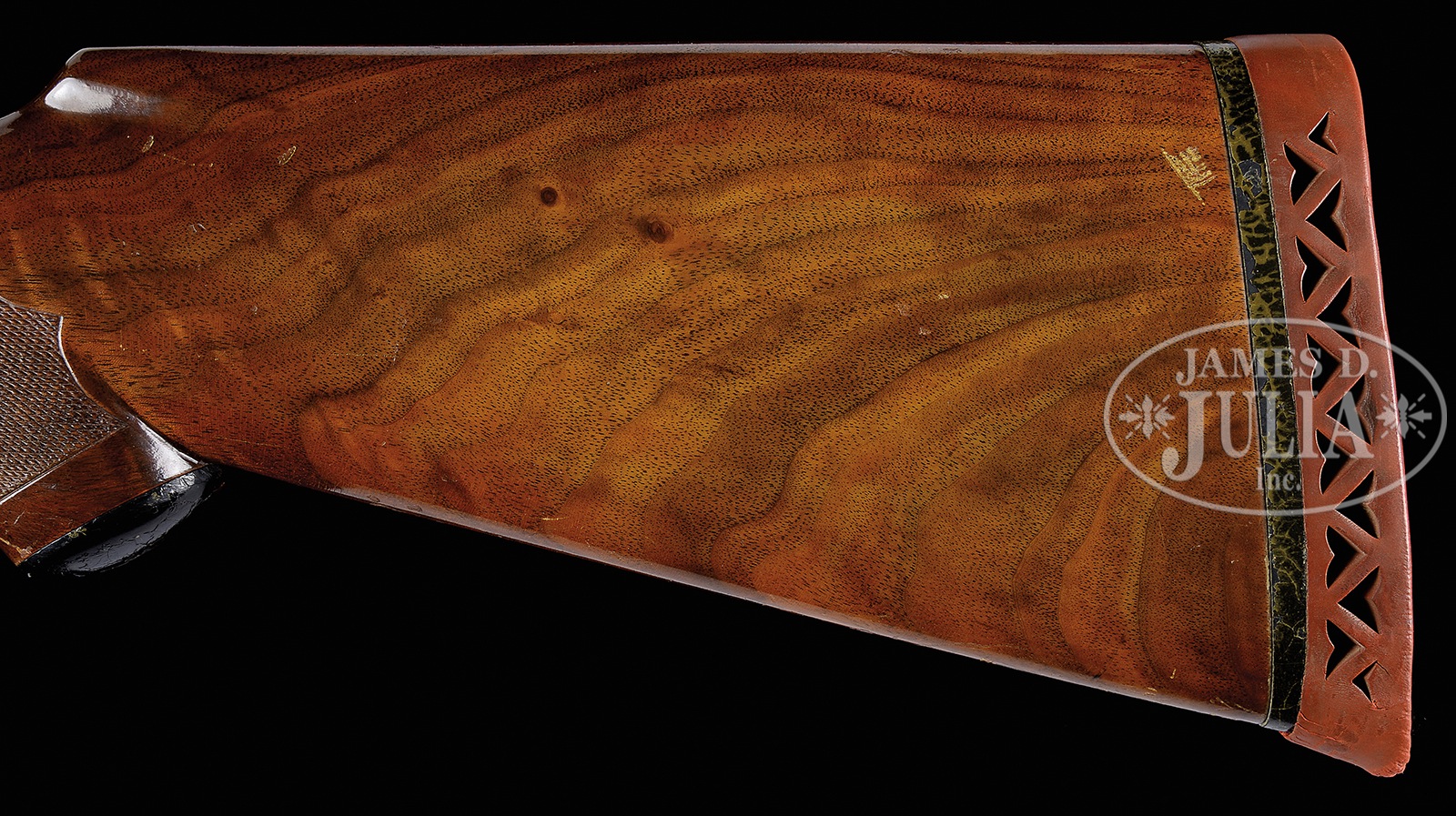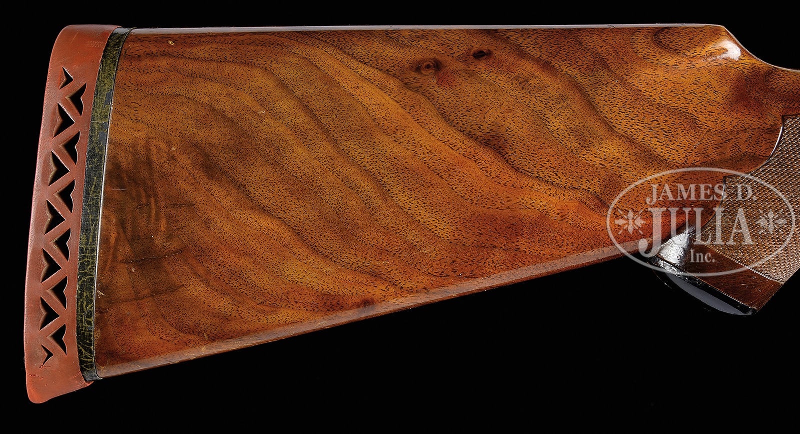 SN 500168. Cal. 10 ga. mag. 3-1/2″ Chambers. Any Ithaca 3-1/2″ mag shotgun in good condition is a treasure. This particular “3 Grade” All Option gun is most likely one of a kind. It has 32″ bbls with matted, ventilated rib. Bbl flats are stamped with SN, grade, and “3-1/2 CHAMBERS”. Case hardened NID action specially made for this cartridge, has cut through bottom to allow for protrusion of lump for added strength. It is fitted with single non-selective trigger. Action is engraved in typical “Grade 3” style, with 50% coverage large shaded scroll with stippled background. This scroll offsets scenes of birds on sides; standing snipe under “ITHACA GUN CO” on left, and a walking quail under “ITHACA, N.Y.” on right. A duck flies across marsh on bottom of action. Blued trigger guard with scroll on bow has SN on tang. Lightly figured American walnut capped pistol grip buttstock measures 13-7/8″ over open sided Hawkins pad, which appears to be original. Fancy pattern checkering is at grip. Matching large beavertail ejector forend has inset ebony tip and J-spring and Deeley type release. Bore diameter: left -.777, right – .790. Bore restrictions: left – .042 (full), right – .044 (full). Wall thickness: left – .060, right – .060. Drop at heel: 2-11/16″, drop at comb: 1-5/8″. Cast: Neutral. Weight: 11 lbs. 3 oz. LOP: 13-7/8″. Twin ivory bead sights. PROVENANCE: Remarkable William Larkin Moore Private Estate Collection of Fine Sporting Arms. Special Note: This item(s) contains plant or animal properties that may be covered by the Endangered Species Act (ESA). We have taken care to ensure that this item(s) meets the standard for sale under the ESA. However, certain states and other countries have laws that are more restrictive than the ESA. It is the bidder’s responsibility to ensure that it is lawful to purchase or transport this item(s) into their state, and to obtain the necessary import and export approvals. Delay or failure to obtain any such permit or approval does not relieve the buyer of paying for the item(s) and consummating the purchase. CONDITION: Excellent, original, as found. Bbls retain 90 – 95% orig blue with a number of light marks and dings, thinning a bit at breech ends where not protected by forend. Action retains approx 90% orig case hardening color, vivid where protected, silvering on sharp edges and fences, thinning a bit on bottom. Blue of trigger guard and forend latch remains excellent, with bow silvered a bit on sharp edges. Stocks retain over 90% orig varnish with numerous scratches and marks, a few fairly heavy. Varnish extends to mounting plate of pad where it is considerably alligatored and lifted. Checkering remains fairly light in color. There are two cracks at rear portion bottom of beavertail forend, one running from rear of latch escutcheon to iron, the other through reinforcing screw from iron into checkering. Bores are excellent, with a hint of frosting. Action is tight. Ejectors are in time. Trigger works. Walt Snyder in THE ITHACA GUN COMPANY FROM THE BEGINNING estimates 24 ten bore 3-1/2″ guns were made in number 3 grade. How many with “all options”? 50594-26 MGM137 (4,000-7,000) C&R; IVORY – Lot 3533