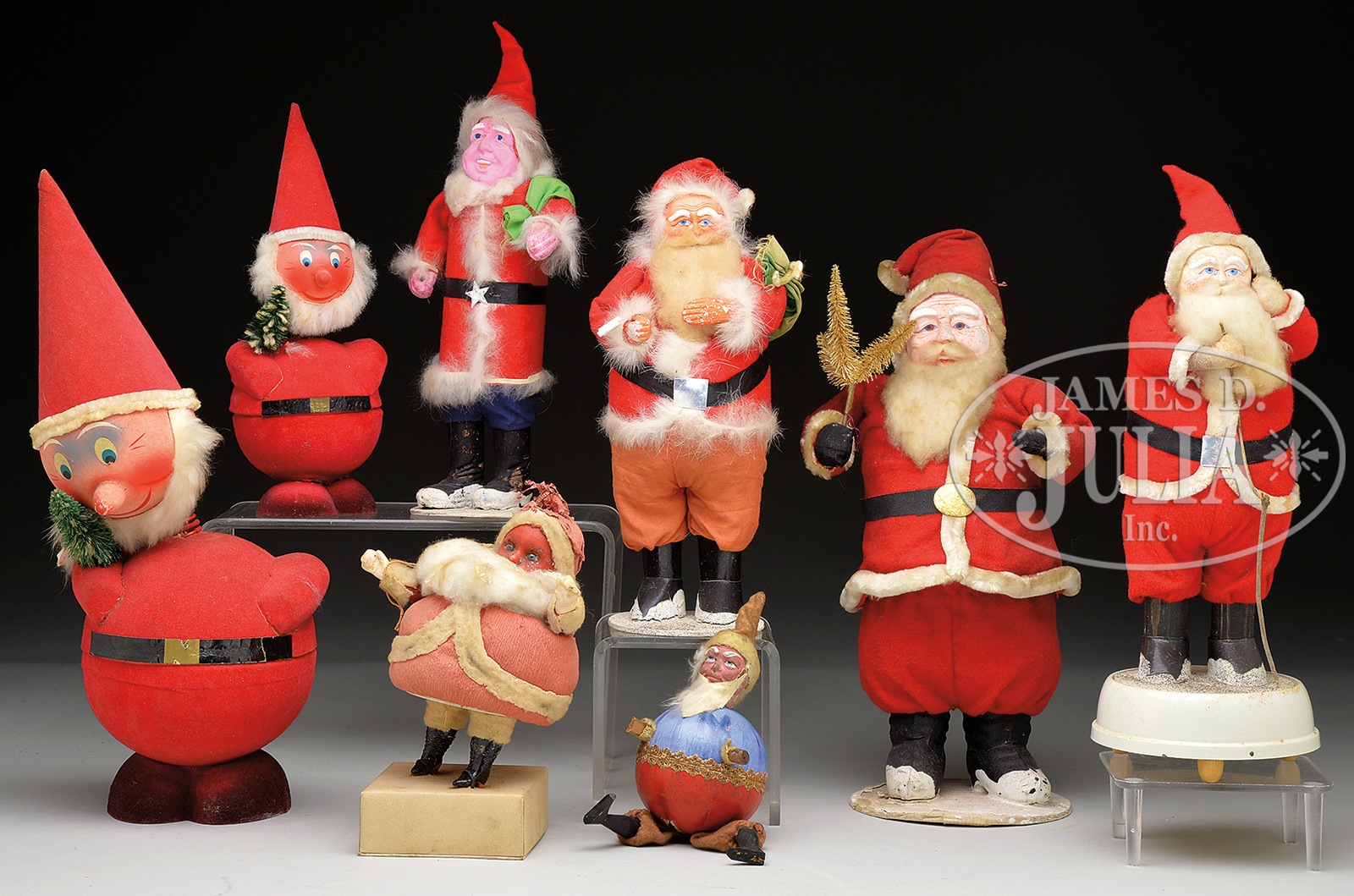 MISCELLANEOUS LOT OF EIGHT SANTAS.Lot includes two flocked West German Santa candy containers with springy heads, 10″ Santa with composition hands & face and white cotton trimmings, 12″ Santa on music box playing “Santa Claus is Coming to Town”, wax head Santa on crepe paper body standing on candy box, 13″ standing Santa made from composition, cotton and felt, 11″ standing Santa with loud pink face, cotton trim and composition body, and an unusual Santa with round body, wooden hands and feet, and composition head. SIZE: As mentioned above. CONDITION: Fair to good. 1-13966 (300-600) – Lot 3538 Auction: Advertising, Toy & Doll - Spring 2014 Please Note: All prices include the hammer price plus the buyer’s premium, which is paid by the buyer as part of the purchase price. The prices noted here after the auction are considered unofficial and do not become official until after the 46th day. |
