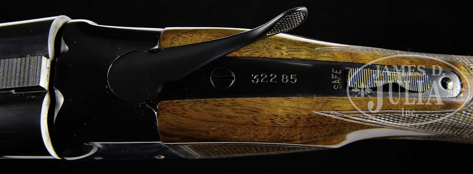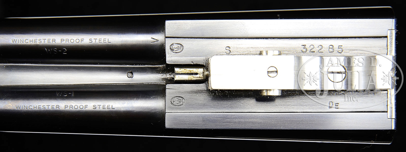 *28 GAUGE WINCHESTER MODEL 21 WITH VENTILATED RIB AND BOX.SN 32285. Cal. 28 ga. 2-3/4″ Chambers. 26″ Bbls with ventilated rib are choked “Skeet 1” and “Skeet 2”. Top of left bbl is marked “MODEL 21 – WINCHESTER – 28 GAUGE 2-3/4″. Bbl flats are stamped with SN and Winchester proofs. Standard type action features automatic safety and blued single trigger. Winchester markings and proof are on water table. Fancy flame figured American walnut capped pistol grip buttstock measures 14-3/8″ over checkered wood butt. Point pattern checkering with beaded border is at grip. Side panels are also checkered. Slimmed beavertail ejector forend has reinforcing brace. Drop at heel: 2-3/16″, drop at comb: 1-5/16″. Weight: 7 lbs. 4 oz. LOP: 14-3/8”. Winchester Olin marked box contains blank hang tag, shipping sleeves, and information booklet. CONDITION: Excellent, appears new. Mechanically crisp. Box is excellent. 4-50969 MGM93 (12,500-17,500) – Lot 3539