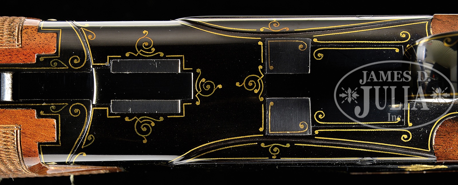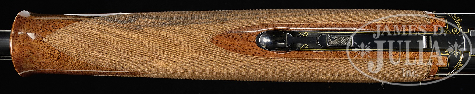 *28 GAUGE BROWNING SHOTGUN SUPERPOSED CUSTOM SHOP EXHIBITION SIDEPLATED SUPERLIGHT WITH GOLD INLAYS BY J. BAERTEN AND CASE.SN C184. Cal. 28 ga. This extremely attractive gun, product of the Browning Custom Shop, has 28″ bbls fitted with narrow, matted, ventilated rib, and has Browning Morgan Utah and Montreal P.Q. address, along with “MADE IN BELGIUM” on left side of top bbl. Left side of breech is marked for full and full chokes. Blued and specially filed superposed action is fitted with ornamental sideplates, and single selective gold plated trigger with finger blade checkered. Action is tastefully two-color gold wire inlaid along its beads and borders. The inlay has small open scroll terminations to very fine effect. This treatment continues onto sideplates and surrounds finely detailed dog and bird scenes with the major subjects relief gold inlaid; pointing setter watches a departing pheasant on left plate, and a quail wings across open grass with pines in background on the right. Another quail is in flight on trigger guard bow. This very attractive and well cut engraving is by noted Browning engraver, Jose Baerten whose signature appears at the bottom of left lockplate. Striking, flame figured claro walnut straight grip Superlight buttstock measures 14-3/8″ over skip line checkered wood butt. Modified point pattern checkering wraps over top of grip. Schnabeled Superlight forend is somewhat lighter in color, than buttstock. Bore diameter: top -.549, bottom – .549. Bore restrictions: top – .035 (full), bottom – .035 (full). Drop at heel: 2-1/16″, drop at comb: 1-3/8″. Cast: Neutral. Weight: 6 lbs. 5 oz. LOP: 14-3/8″. Vinyl Hartmann case is lined in faun faux fur, and contains Naugahyde tag and two keys. PROVENANCE: Remarkable William Larkin Moore Private Estate Collection of Fine Sporting Arms. CONDITION: Excellent, very near to new, with some light assembly and handling marks, major exception two index fingernail sized compressions in right bottom forend checkering, and a small ding on left side of rib about 4″ from breech. Mechanically crisp. Case is excellent. 50594-110 MGM92 (20,000-30,000) – Lot 3539