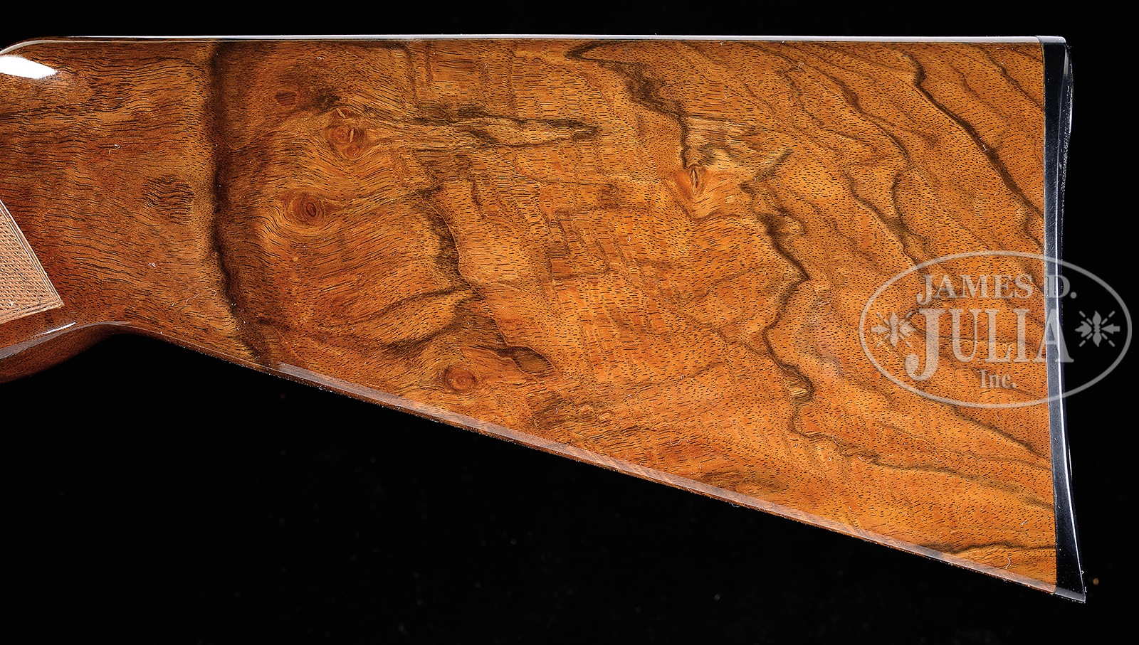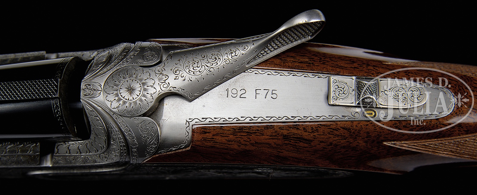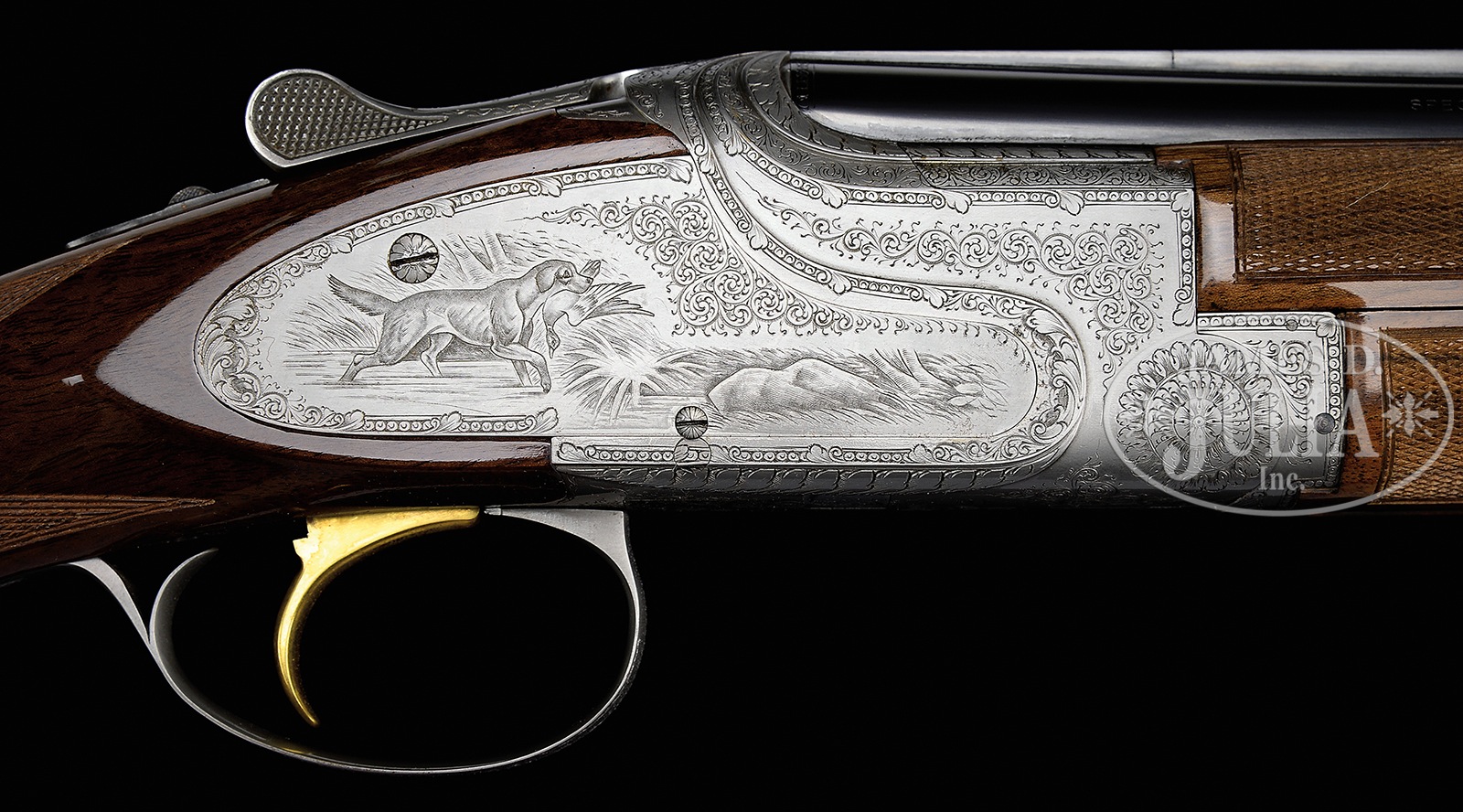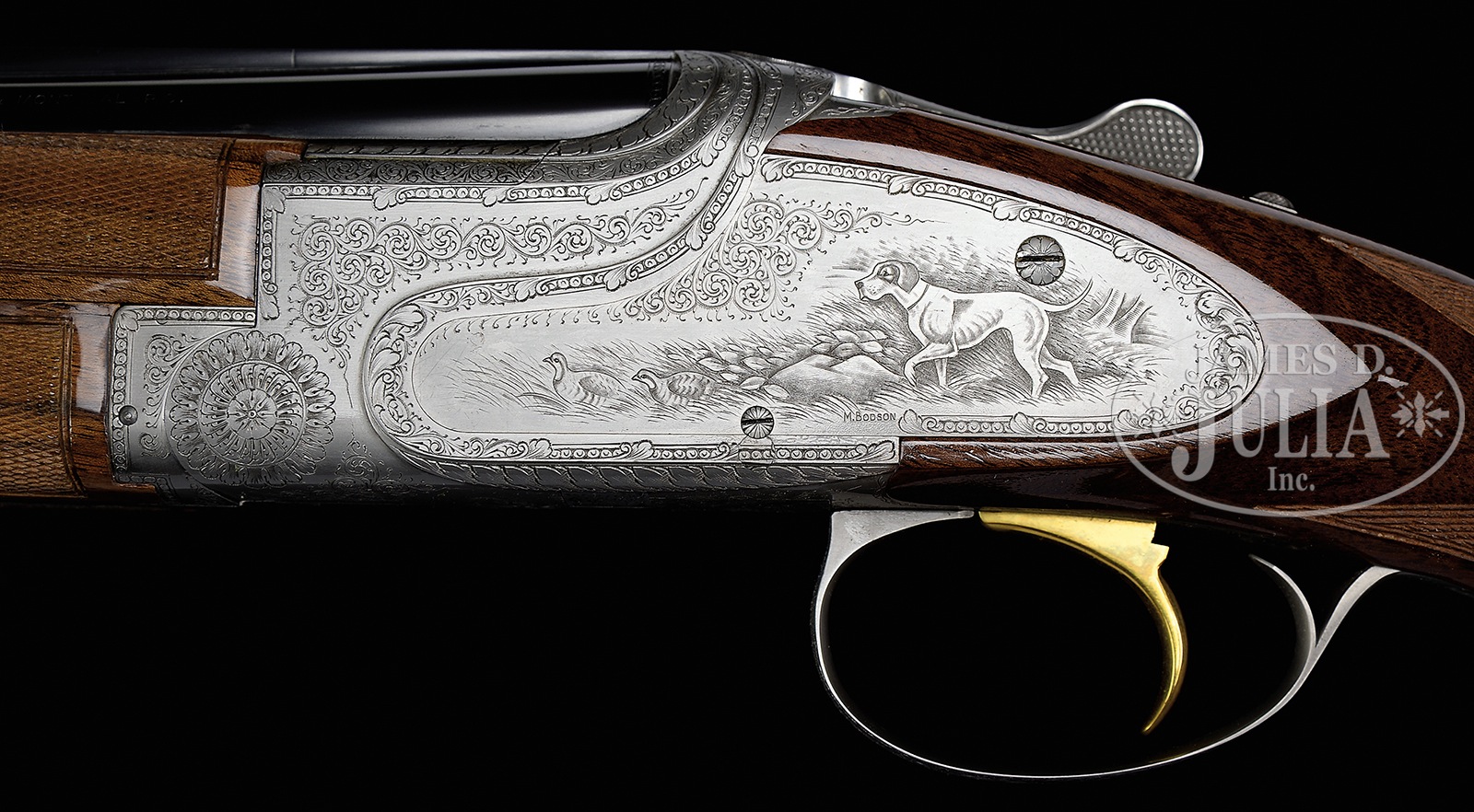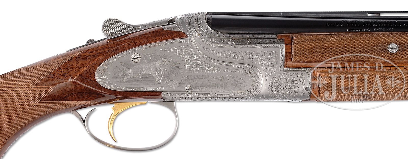 *FINE 28 GAUGE BROWNING SUPERPOSED EXHIBITION SHOTGUN W/SIDEPLATES AND FINE GAME SCENES BY BODSON AND SCROLL BY DUJARDIN.SN 192F75. Cal. 28 ga. 2-3/4″ Chambers. 26-1/2″ Bbls with narrow, ventilated rib are marked with Morgan Utah and Montreal addresses on top left. Browning patents, etc. are on right. Left side of breech is marked for mod and full chokes. Coin finished nicely filed rounded action with ornamental sideplates features non-automatic safety and gold plated single selective trigger. Action is engraved with well cut medium scroll within acanthus enhanced geometric borders. This scroll and bordering surround well rendered sporting vignettes of dogs and game birds on sideplates; a pointer pointing a pair of quail in rocky meadow on left, and a retriever, duck in mouth, stepping out of a pond on right. Bottom of action portrays a running rabbit. This interesting engraving is signed by noted Browning engraver “N. Bodson” at bottom of quail scene. “Dujardin” signature is on trigger plate. American walnut long tang square knob buttstock with interesting burl and flame/ stump figure measures 14-3/8″ over Browning embossed hard rubber buttplate. Point pattern checkering with line borders is at grip. Three piece schnabeled forend matches well. Bore diameter: top -.545, bottom – .542. Bore restrictions: top – .030 (full), bottom – .013 (mod). Drop at heel: 2-1/8″, drop at comb: 1-7/16″. Cast: approx 1/4″ off. Weight: 6 lbs. 7 oz. LOP: 14-3/8″. PROVENANCE: Remarkable William Larkin Moore Private Estate Collection of Fine Sporting Arms. CONDITION: Excellent, very near new, with only a few scattered handling and assembly marks in all fine factory finishes. There is scant evidence of firing. Mechanics are crisp. A super rare little Browning. 50594-61 MGM130 (17,500-27,500) – Lot 3540