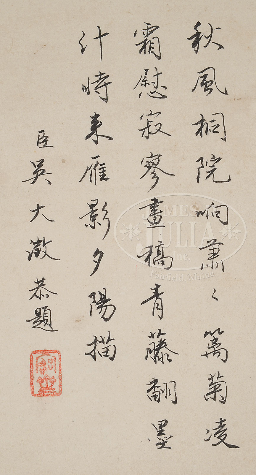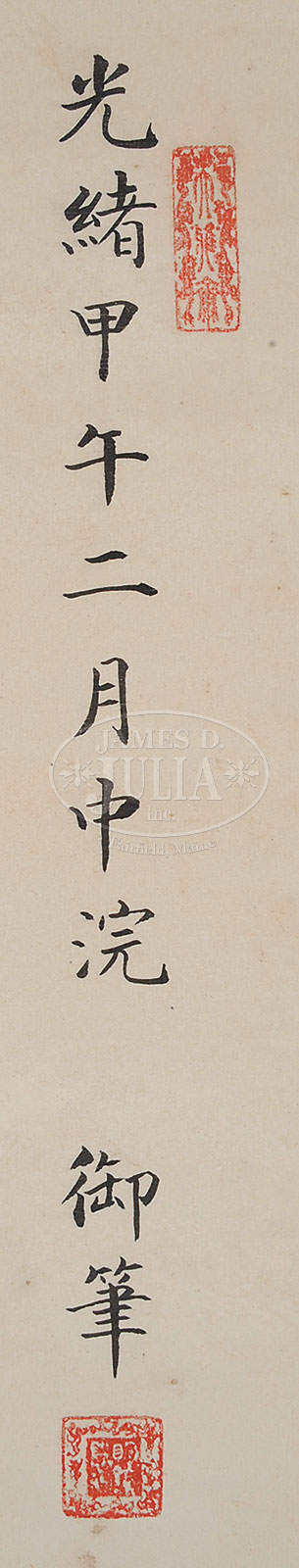 China. The painting with an elaborate and colorful arrangement of flowers held within a handled basket. Group of script along the left margin and bears the name of Emperor Guangxu. SIZE: Painting 49″ x 26″. Overall 87″ x 32″. CONDITION: Some staining and toning to the paper along with scattered creases and minor repairs. On newer mount. 51997-1 (6,000-8,000) – Lot 3542
