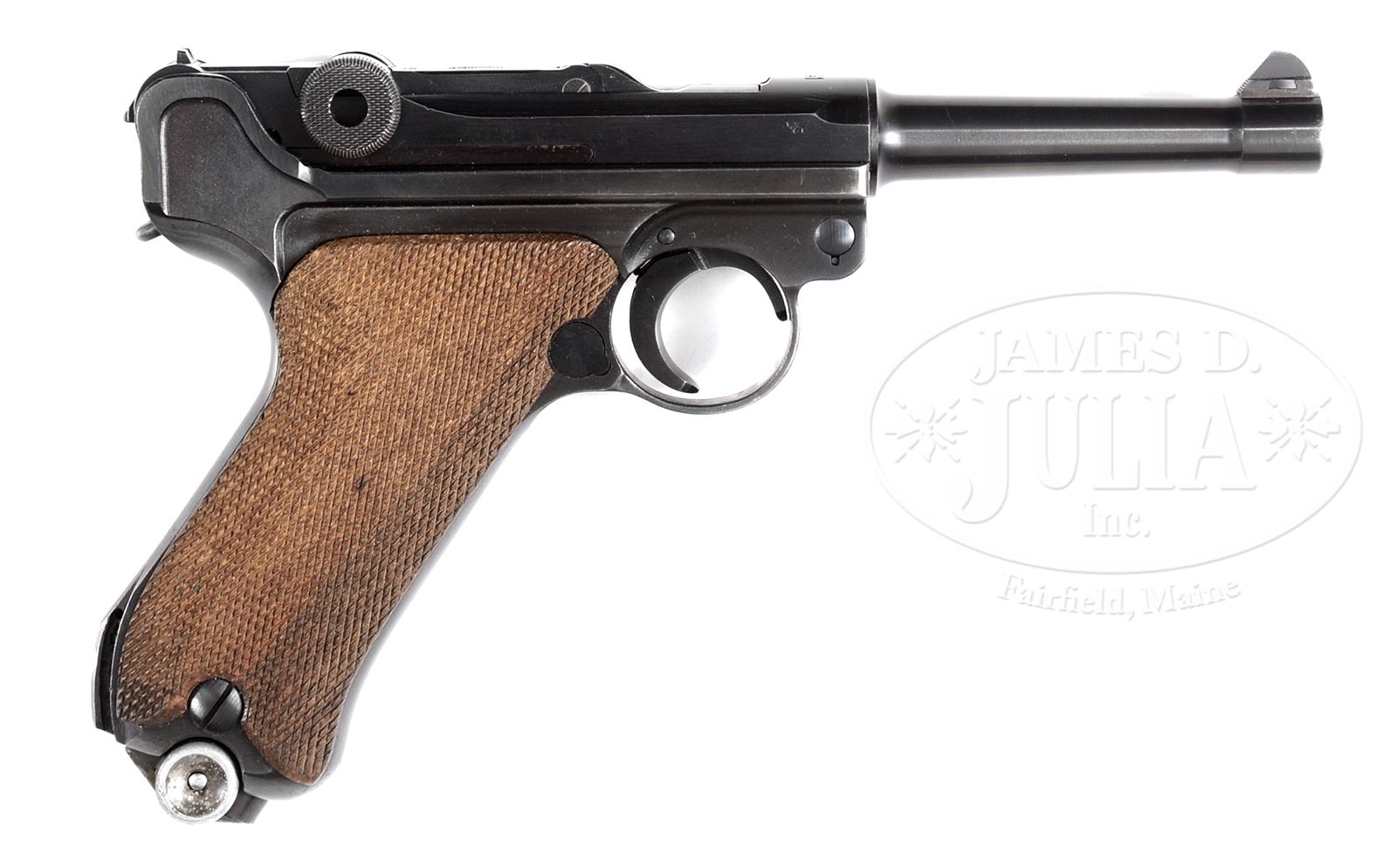 *EXCEPTIONAL MAUSER BANNER 1941 POLICE EAGLE L LUGER & RIG WITH TWO MATCHING MAGAZINES.SN 495y. Cal. 9mm Parabellum. Extraordinary Mauser Banner Luger, “1941” chamber date, with 4″ bbl, drift adjustable front sight and fixed rear sight. Mauser banner on middle toggle link. Full SN and letter suffix on forward frame with full SN repeated on left receiver. Unnumbered bbl marked with bore diameter. Eagle “L” proof on right side of receiver with sear safety. Fitted with full checkered walnut grips that are unnumbered. Accompanied by two matching numbered magazines in an “A. FISCHER / BERLIN C.2 / 1942″ marked orig black leather holster. The #2 magazine is a “HAENEL SCHMEISSER PATENT” & the other a standard magazine. No takedown tool. A nicer, as issued, WWII German Police Luger rig would be extremely difficult to find. PROVENANCE: Ex Doug Smith Collection. The William Smith Collection. CONDITION: Extraordinarily fine, all matching including two magazines & grips. Approx 98-99% crisp orig salt blue excepting around stock lug where there is a small area of discoloration. Sear safety pin is correctly in-the-white. Grips are very sharply checkered with minimal oil discoloration. Excellent condition magazines with the #1 magazine having been lightly cleaned above the follower button. Near mirror bore. Perfect manual mechanics. Outstanding holster with orig white stitching showing no evidence of repolishing or staining. 49312-31 FTL C&R (6,000-9,000) – Lot 3543