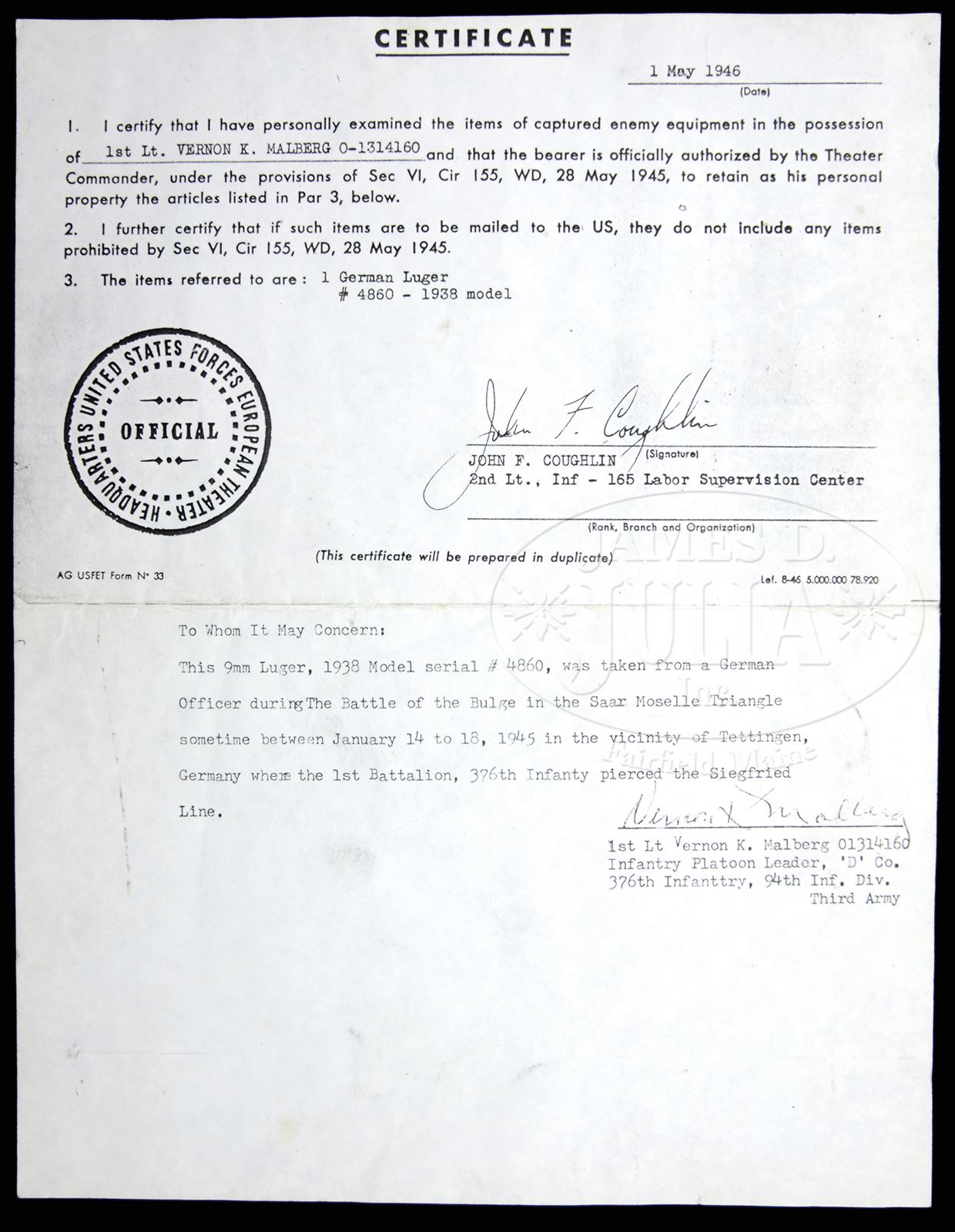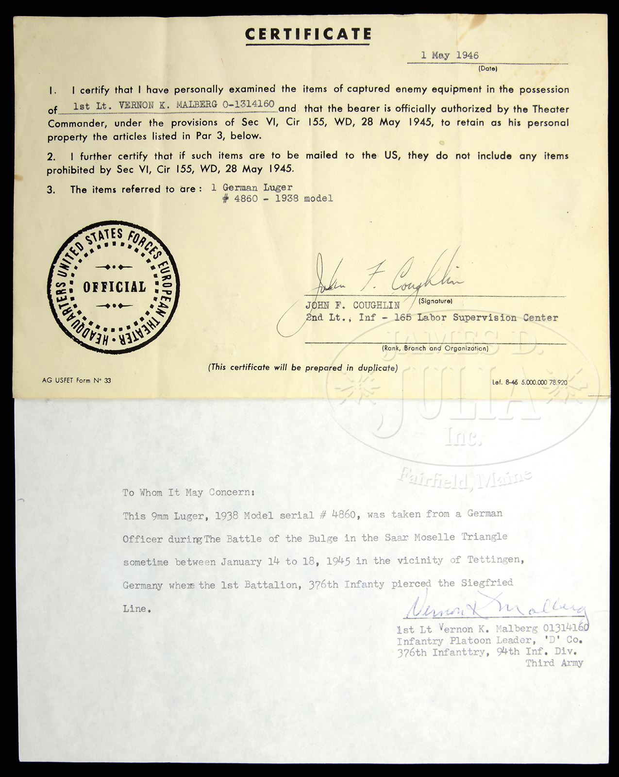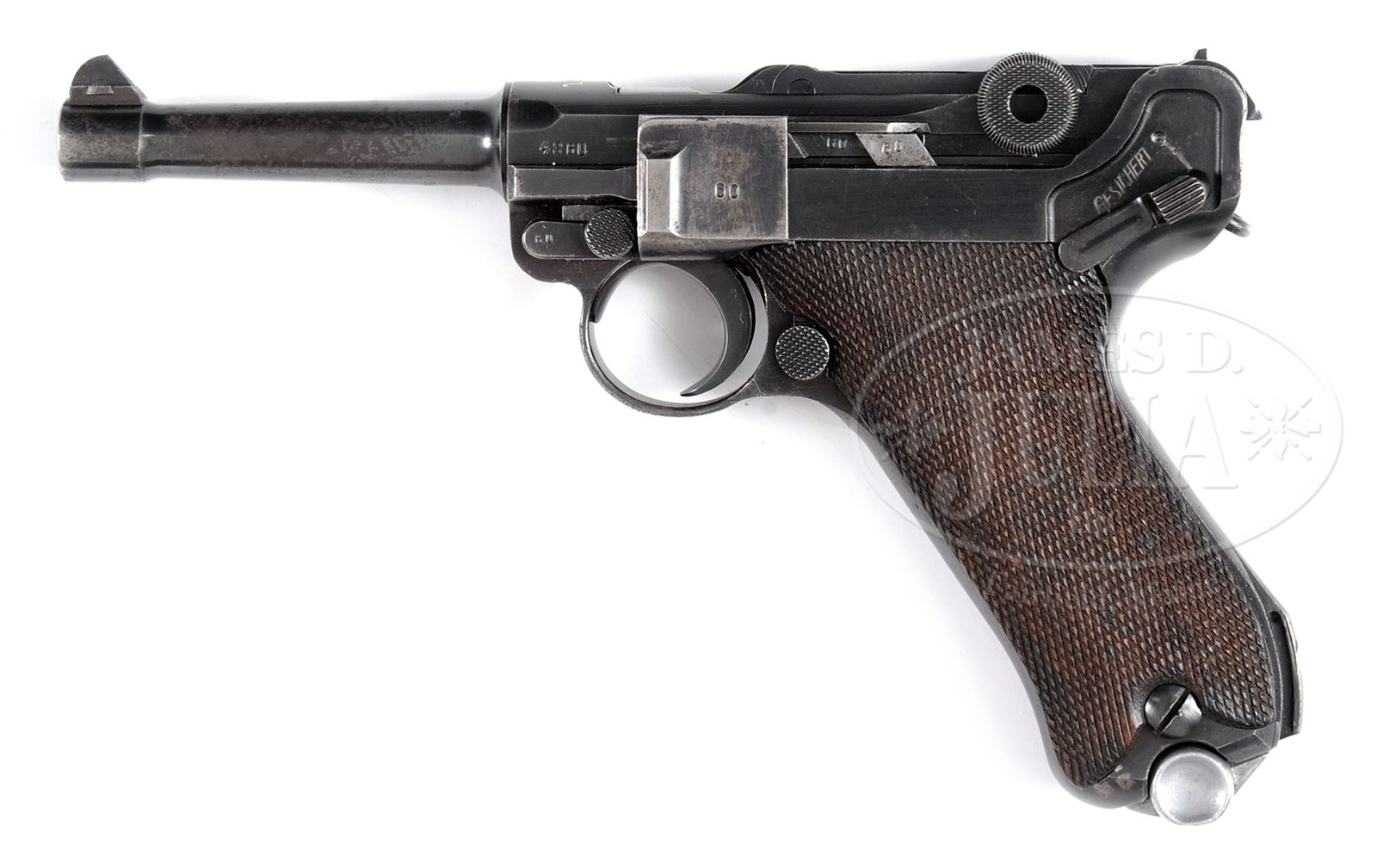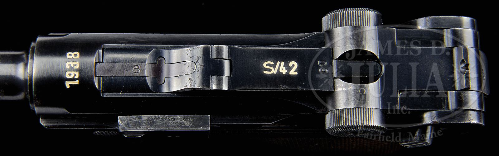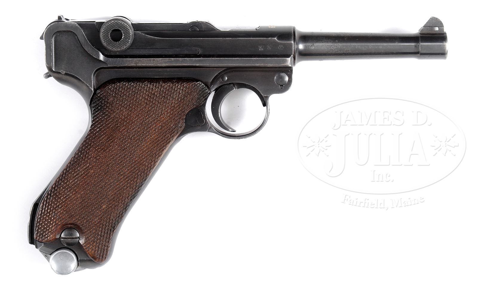 *HISTORIC MAUSER 1938 DATE LUGER WITH CAPTURE PAPERS AND CERTIFICATE.SN 4860b. Cal. 9mm Parabellum Standard 1938 date S/42 Luger with 4″ bbl having a drift adjustable front sight and fixed rear sight. “1938” chamber date with S/42 middle toggle link code. Full SN with letter suffix on forward frame and under bbl, and SN repeated on left side of the receiver. Waffamt markings in usual places on bbl and right side of the receiver. Disassembly shows all matching small parts including the firing pin and each of the checkered wood grip panels. Correct magazine with blued body and aluminum base numbered “4095 x” with “+” denoting spare magazine and Eagle/655 code. Complete with orig capture papers and certificate dated 1 May 1946, showing the gun as property of Vernon K. Malberg. A second attestation, signed by Vernon K. Malberg, mentions that this exact pistol was taken from a German officer during the Battle of the Bulge sometime between 14/18 January 1945. PROVENANCE: The William Smith Collection. CONDITION: Approx 80% orig salt blue and with noticeable fading and etching on left side of bbl and sideplate. Orig grips with sharp checkering and comparable or slightly better condition. Bright bore with sharp rifling and only minimal etching. Excellent magazine and base. A real find for the collector wishing a Luger with a well-documented history. 49312-18 LMA C&R (3,000-5,000) – Lot 3544 Click here to view provenance