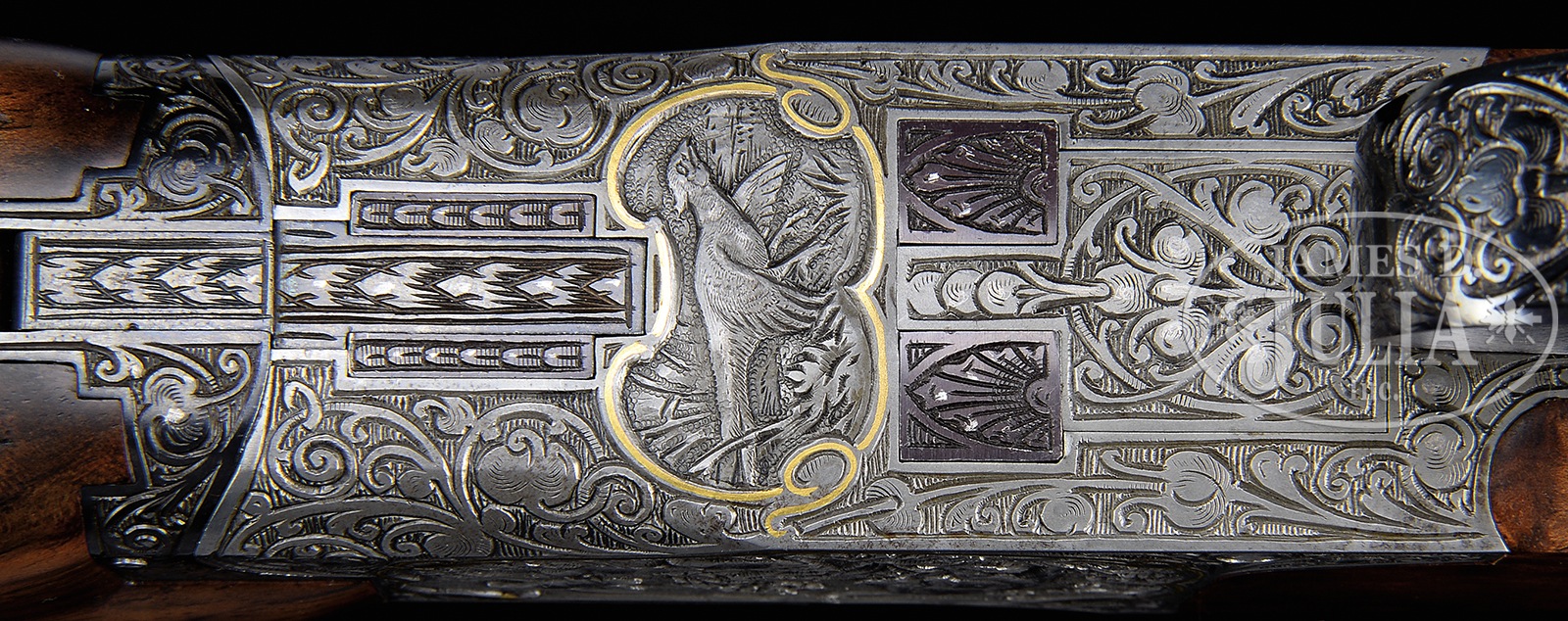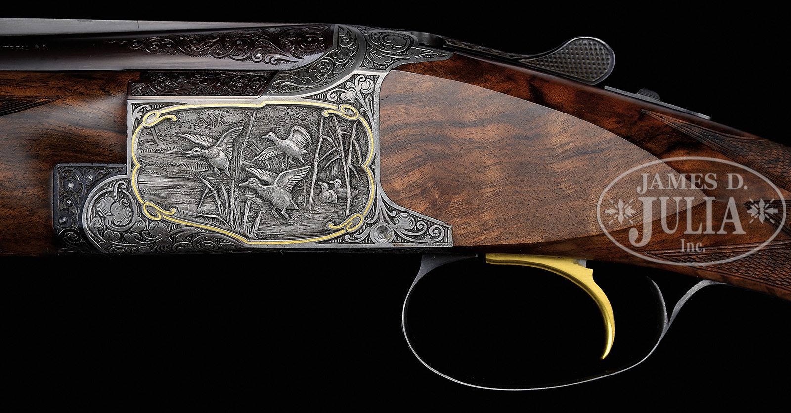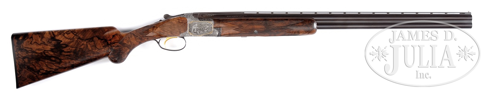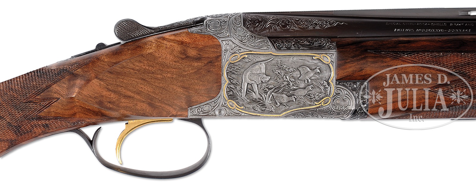 *FINE 20 GAUGE CUSTOM BROWNING SUPERPOSED SHOTGUN WITH EXCEPTIONAL HIGH RELIEF GAME SCENE CARVING AND SUPERB STOCK WOOD.SN 42562V6. Cal. 20 ga. 3″ Chambers. 26-1/2″ Bbls with narrow, ventilated rib are marked with St. Louis and Montreal addresses on top left. Browning patents, etc. are on right. Left side of breech is marked for IC and mod chokes. Coin finished action features non-automatic safety and gold plated single selective trigger, and is engraved with very well cut Germanic large open scrolling acanthus with shaded background surrounding deep relief carved scenes of birds and dogs framed by flush scrolling gold wire inlay; a group of three mallards take wing from cattails while another two remain swimming on left side of action, and a pointer watches a trio of quail run and fly away on right. Bottom of action portrays a pheasant about to spring into the air. This fine custom work is reminiscent of that by Hans Obiltschnig, but no signature is found. Blued trigger guard with central oval on bow is gold inlaid with “V” surrounded by V-shaped scroll flourish. Intricately dark marbled and stump figured exhibition quality European walnut long tang round knob buttstock measures 14-1/2″ over Browning embossed hard rubber buttplate. Point pattern checkering with double line borders is at grip. Well matched forend is of field type. Bore diameter: top -.623, bottom – .620. Bore restrictions: top – .013 (mod), bottom – .005 (IC). Drop at heel: 2-1/16″, drop at comb: 1-7/16″. Cast: approx 3/8″ off. Weight: 6 lbs. 2 oz. LOP: 14-1/2″. PROVENANCE: Remarkable William Larkin Moore Private Estate Collection of Fine Sporting Arms. CONDITION: Excellent, near new, as custom finished, with only a few light handling and assembly marks in all wood and metal finishes. Bores are excellent. Mechanics are excellent. An attractive custom Browning. 50594-58 MGM131 (7,000-11,000) – Lot 3544