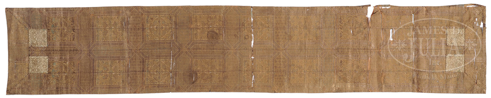 SILK LAMPAS TEXTILE FRAGMENT.China, 13th century. The long fragment with alternating panels of phoenix and confronting dragons done with gold accented thread. SIZE: 62″ x 11-1/2″. CONDITION: In fragile condition, scattered tears and small losses. Wear consistent with age. 51415-1 (2,000-3,000) – Lot 3544