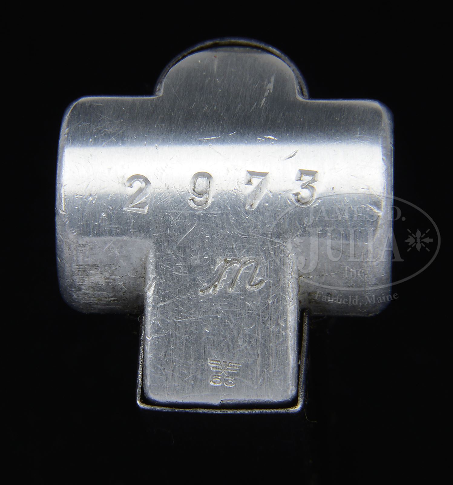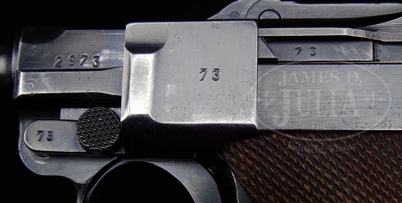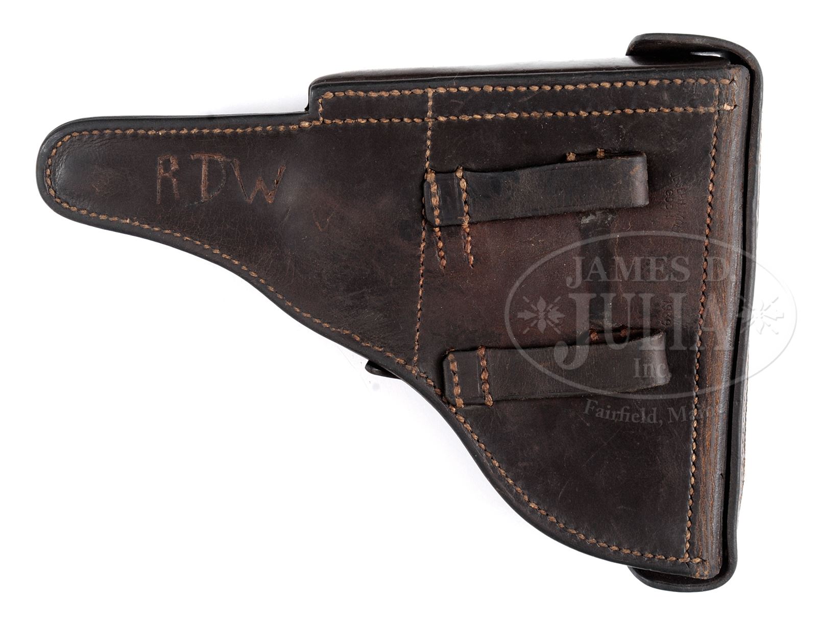 *MAUSER 1938 S/42 LUGER PISTOL RIG WITH TWO MATCHING MAGAZINES & CAPTURE PAPER.SN 2973M. Cal. .9mm. 4″ bbl, with Eagle/63 proof on upper left and 4 digit SN on bottom, 1938 date above chamber. “S/42” on center toggle link (code for Mauser manufacture). Eagle/63 proof on right receiver. Numbered parts on gun are matching down to the firing pin. Un-numbered checkered walnut grips. Both orig matching numbered aluminum bottom Eagle/63 proofed mags and Eagle/63 proofed takedown tool. Dark brown leather “JOSEPH MOLL / GOCH” marked, 1939 dated holster. With Capture Paper to Ralph T. Walker, dated April 24, 1946. PROVENANCE: The William Smith Collection. CONDITION: Fine, retaining 95% orig blue with very light scattered corrosion, fading on grip straps & normal sharp edge wear. Grips are lightly worn with minor indents. Bore is frosted. Mags have very little wear other than dings on aluminum bottom of extra mag. Takedown tool retains 50% blue. Mechanics are very good. Holster has been re-dyed to cover moderate wear and cracking “RTW” (Ralph T. Walker) carved on back of holster. 49312-32 BWS C&R (2,500-3,500) – Lot 3545 Click here to view provenance
