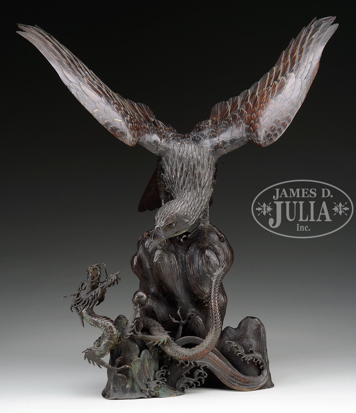 BRONZE SCULPTURE OF EAGLE WITH DRAGON.Meiji Period, Japan. The statue depicting a raptor with fierce expression perched upon a rockery and peering down at a dragon below. SIZE: 22-3/4″ h. CONDITION: Repair to one leg. Old repair to underside of bird’s neck. Scattered tarnishing to the surface. 50262-8 (600-800) – Lot 3547