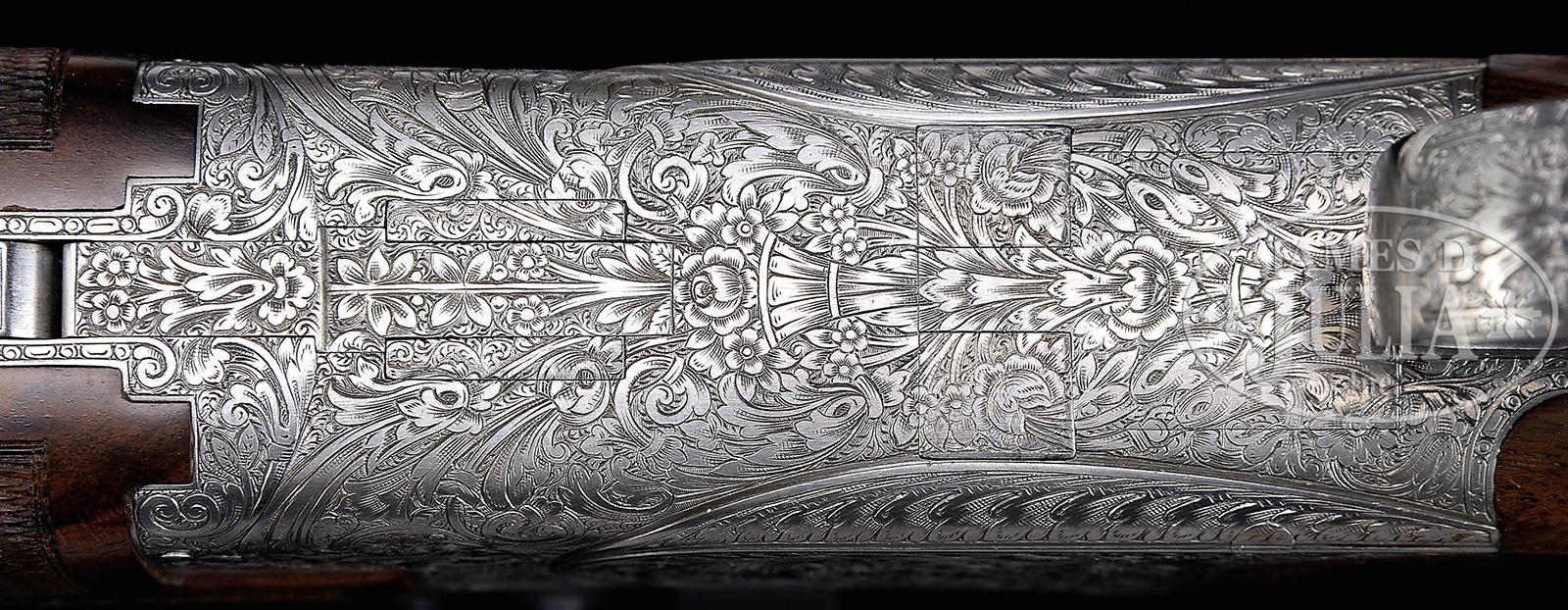 *SUPERB BROWNING SUPERPOSED “D5” VERREES & CO (LEBEAU-COURALLY) DOUBLE RIFLE WITH EXTRA SHOTGUN BARRELS, SCOPE, AND CASE.SN 177PM01156. Cal. 30-06 and 20 ga. 3″ Chambers. Browning/ FN Custom shop is often in partnership with Lebeau-Courally/ Verrees in producing unusual exhibition quality guns and rifles. This particular example built on a B 25 small sized action, is fitted with 24″ mono-bloc OU double rifle bbls. Bbls are fitted with hand matted quarter rib holding single folding leaf express rear sight and claw scope bases. Matching front ramp holds silver bead. Left side of top bbl is engraved “BROWNING ARMS CO MADE IN BELGIUM”; right side with “VERREES & CO” and with caliber. 26-1/2″ Shotgun bbls are marked for modified and full chokes, are fitted with narrow, hand matted, ventilated rib, and are engraved with same makers names. Browning B 25 Superposed action is coin finished, and has nicely filed beads. It is engraved in “D5” pattern with full coverage large swirling acanthus scroll with floral terminations and highlights. This fine engraving is signed “Janssen” beside trigger. Engraving continues onto trigger guard bow, as well as tang, which extends to steel grip cap, also engraved in matching pattern. Exhibition quality, beautifully marbled European walnut with striking fiddle/ flame figure, measures 14-1/2″ over skip line checkered wood butt. Side panels have nicely chip carved drop points and checkering at grip is of modified point pattern with line borders. Each bbl set has its own nicely matched 3-pc forend. Leupold Vari X III 1.5 – 5X scope with duplex reticle is in Recknagel type claw rings. Shotgun bbls 20 ga: Bore diameter: top -.617, bottom – .618. Bore restrictions: top – .018 (mod), bottom – .009 (IC). Drop at heel: 2-3/16″, drop at comb: 1-1/2″. Cast: Neutral. Weight: 5 lbs. 14 oz. LOP: 14-1/2″. 30-06 Rifle BBLS: Drop at heel: approx 2-7/16″, drop at comb: approx 1-5/8″. Weight without scope: 7 lbs. 4 oz. LOP: 14-1/2″. Tan vinyl Hartmann case lined in faux fur, contains a Naugahyde tag, and the key. PROVENANCE: Two test targets for rifle bbls dated 2007. Remarkable William Larkin Moore Private Estate Collection of Fine Sporting Arms. CONDITION: Excellent, very near to new, with a few handling marks in all fine factory finishes on wood and metal, most notably some light scratches on both side panels of buttstock. Mechanically crisp. Scope is excellent, optically clear. Case is excellent with one or two bumps. Interior is lightly soiled. A super rare high end combo. 50594-95 MGM122 (12,500-17,500) – Lot 3547