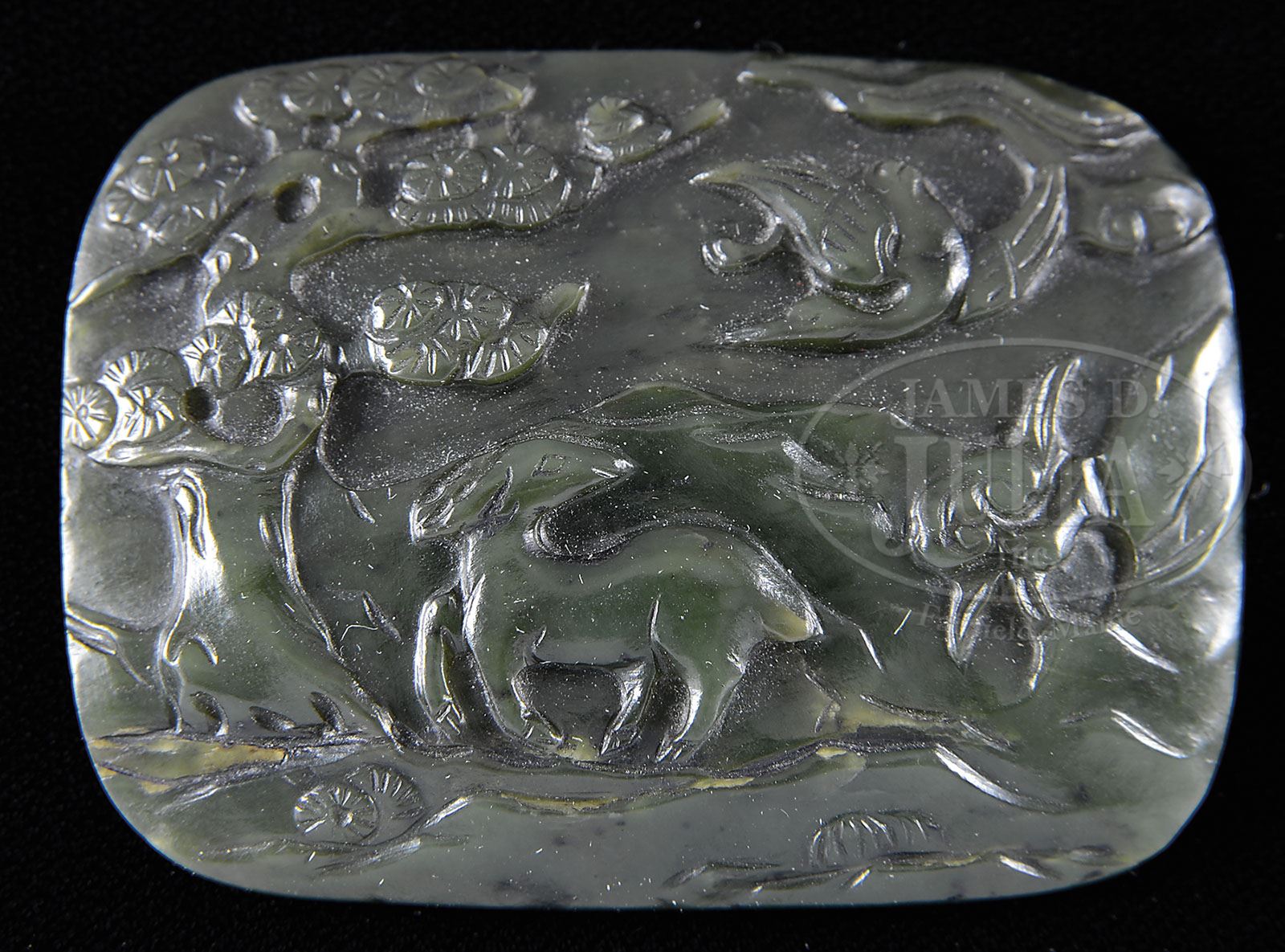 JADE PLAQUE. 18th century or earlier, China. Rectangular jade plaque with rounded corners. Olive green stone with black markings. Scene of a landscape with a pine tree, deer, crane, and ling chih. SIZE: 2-5/8″ w x 1-5/8″ t. CONDITION: Very good. 9-91591 (300-500)
