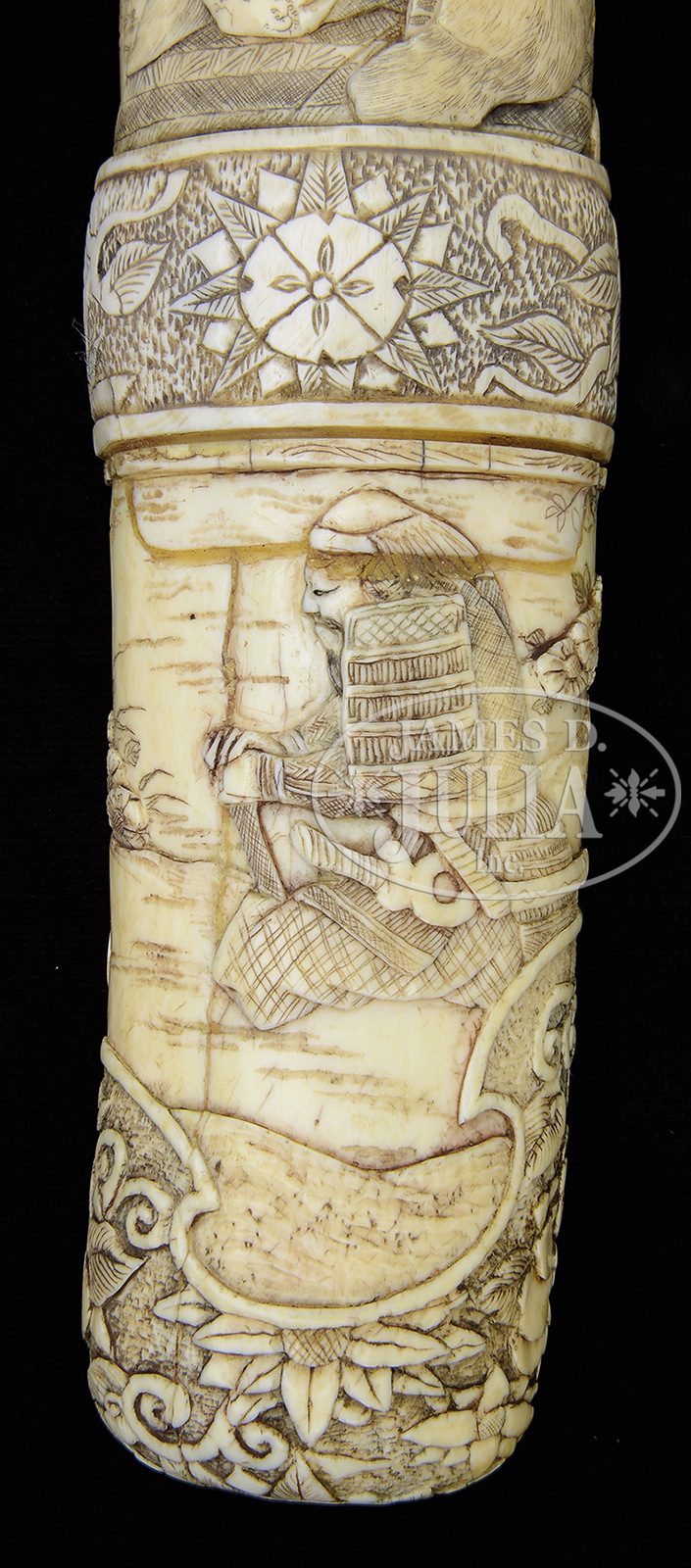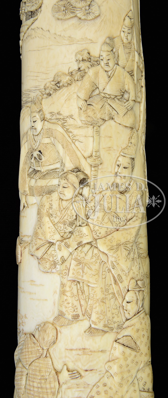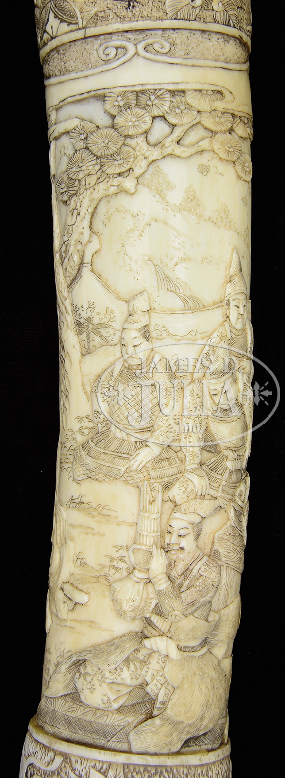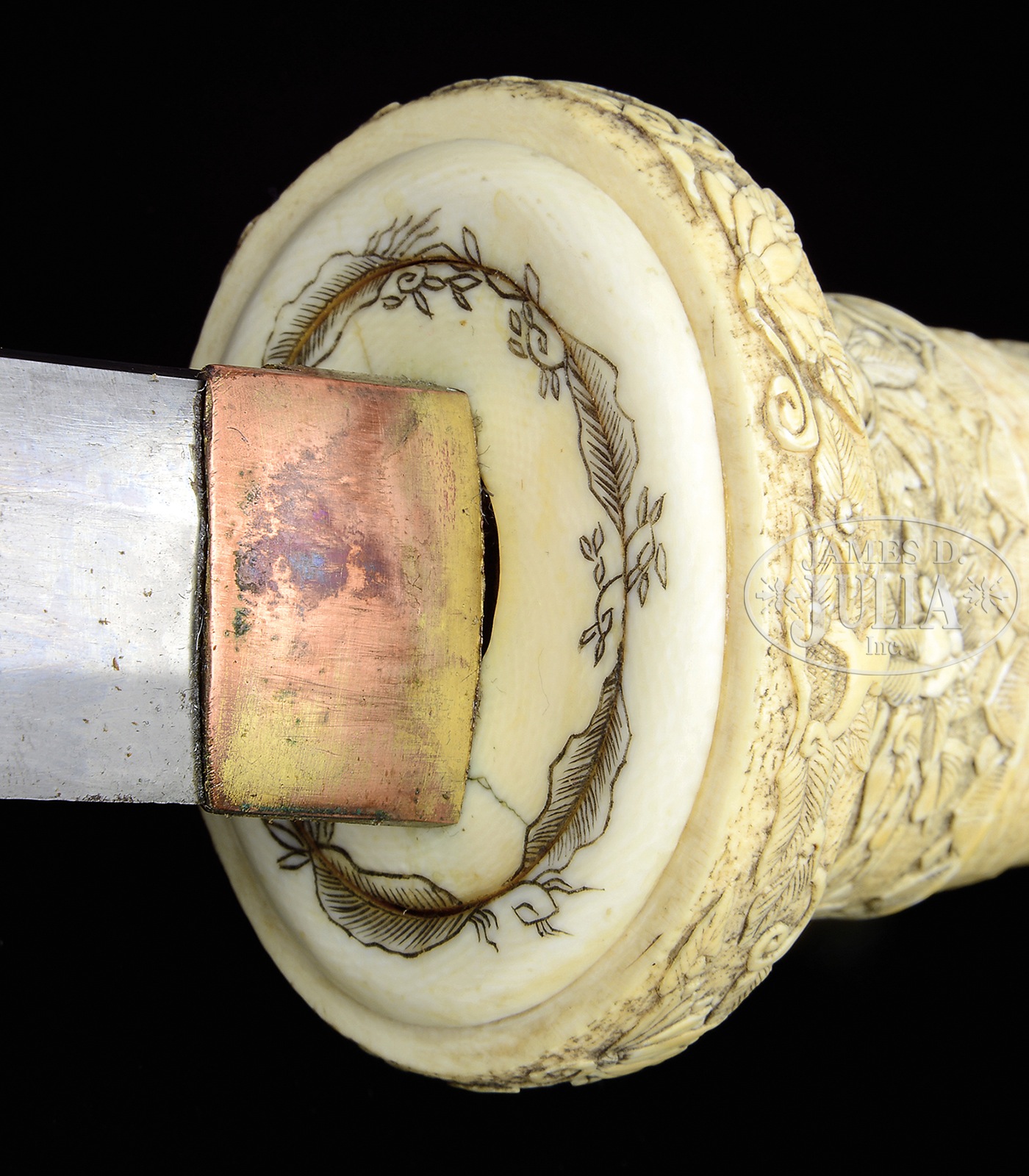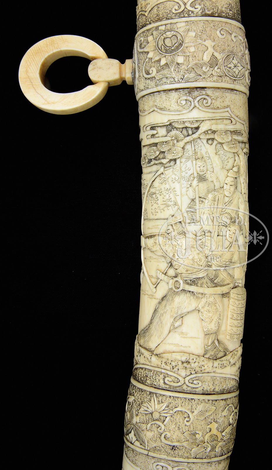 FABULOUS 19th CENTURY SOLID IVORY MOUNTED KATANA.Ivory carving at its finest is presented in this pre-Meiji katana saya carved intricately in 15 seperately pieces. Rarely do such fine ivory mounted swords of this era come to market, much less the quality and condition offered here. Certifiable antique elephant ivory. SIZE: Overall: 39-1/2″. Blade: 25-1/2″. Blade & handle: 36-1/2″. Special Note: This item contains plant or animal properties that may be covered by the Endangered Species Act (ESA). We have taken care to ensure that this item meets the standard for sale under the ESA. However, certain states and other countries have laws that are more restrictive than the ESA. It is the bidder’s responsibility to ensure that it is lawful to purchase or transport this item into their state, and to obtain the necessary import and export approvals. Delay or failure to obtain any such permit or approval does not relieve the buyer of paying for the item and consummating the purchase. CONDITION: Fine overall, there are a few glued hairlines unaffecting aesthetics, mellow ivory patina. Blade retains much of its original polish, bright/gray overall patina. 50711-3 IVORY (7,000-8,000) – Lot 3550