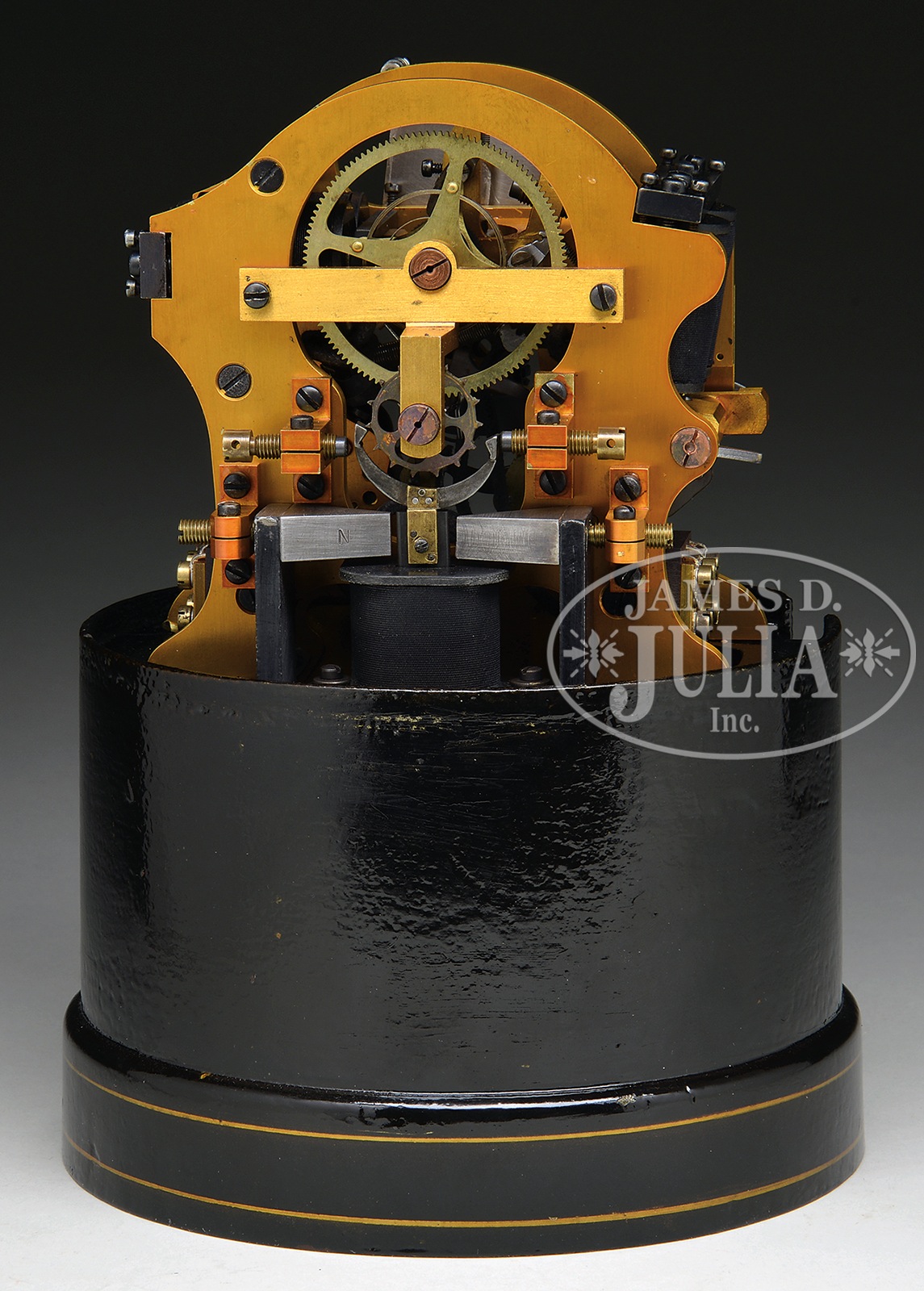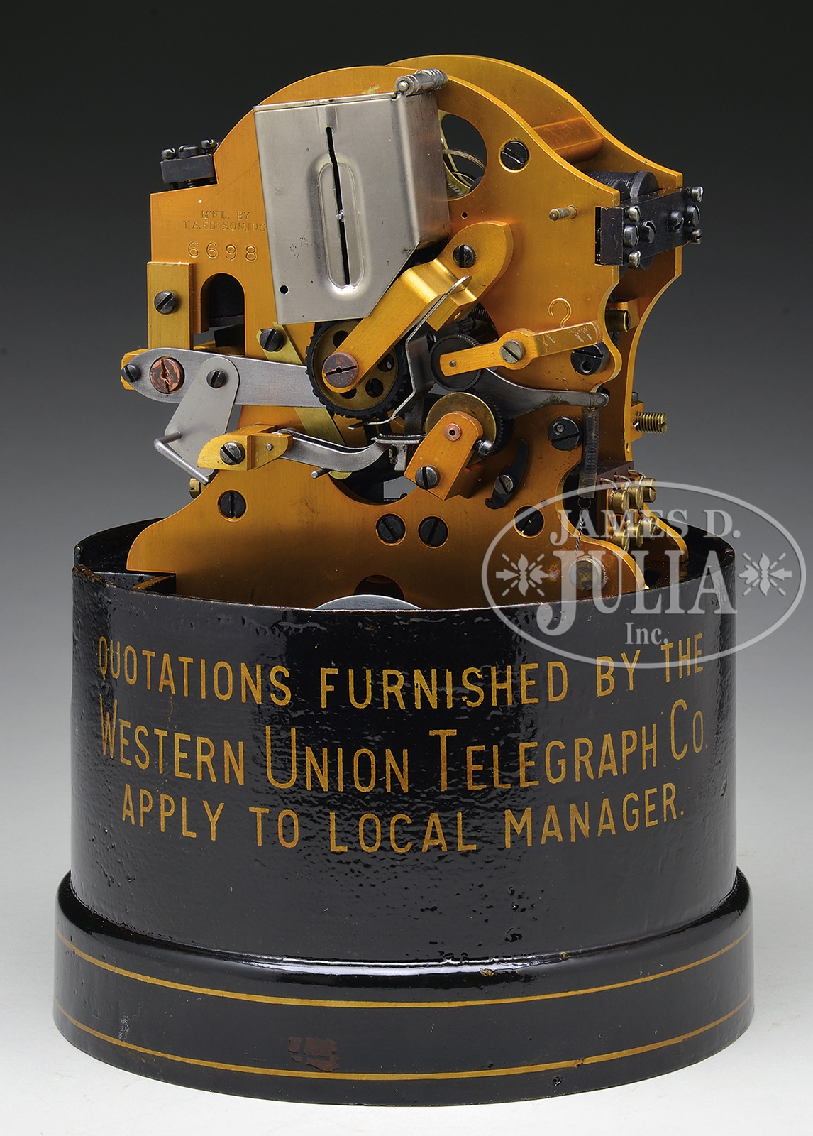 WESTERN UNION STOCK TICKER.Technically known as the Western Union Automatic Self-Winding Ticker used throughout the 1920s and into the 1940s it provided stock quotes and later news and sporting event info. The black painted cast iron base reads “Quotations furnished by the Western Union Telegraph Co. Apply to local manager.” Interior contains elaborate electromagnetic device stamped “M’F’D BY T.A. Edison, Inc.” as well as the serial number 6698. Comes with glass dome that is a probable replacement. SIZE: 13-1/4″ h x 7-1/2″ diam. CONDITION: Very good to near excellent with just a few minor paint chips. 1-14258 (6,500-8,500) – Lot 3552 Auction: Advertising, Toy & Doll - Spring 2014 Please Note: All prices include the hammer price plus the buyer’s premium, which is paid by the buyer as part of the purchase price. The prices noted here after the auction are considered unofficial and do not become official until after the 46th day. |
