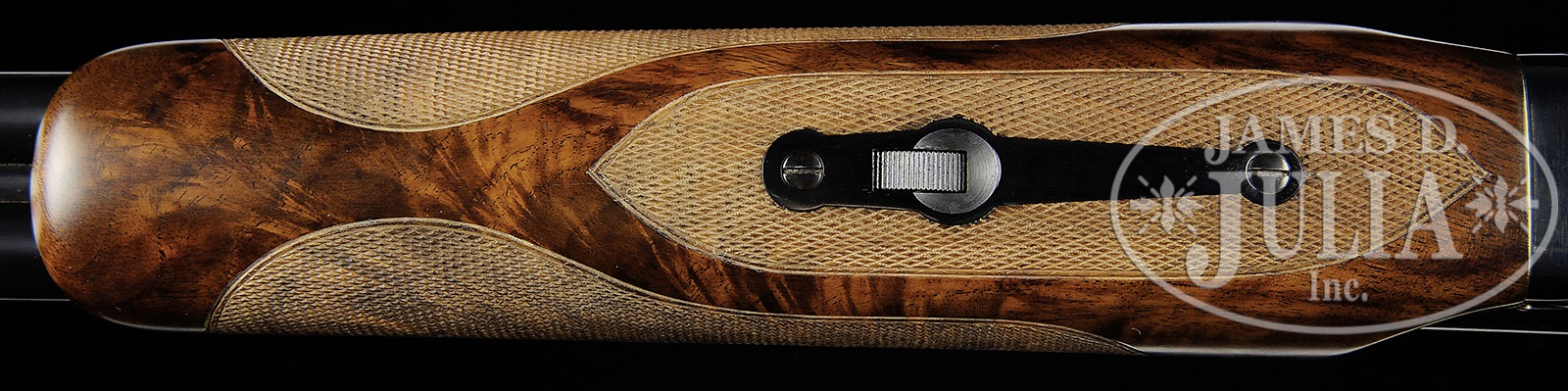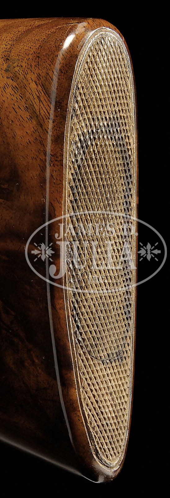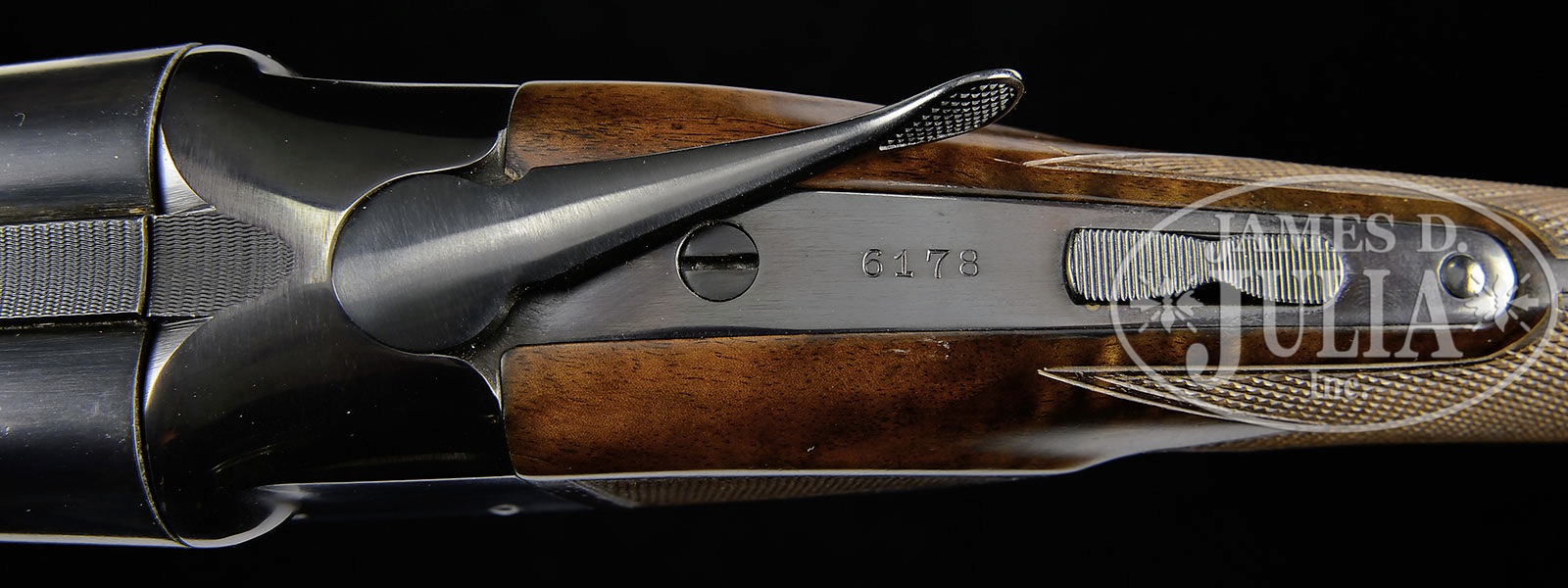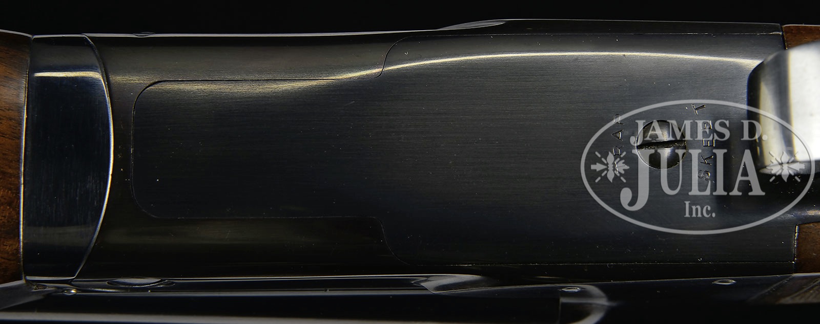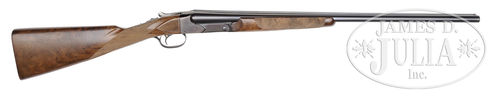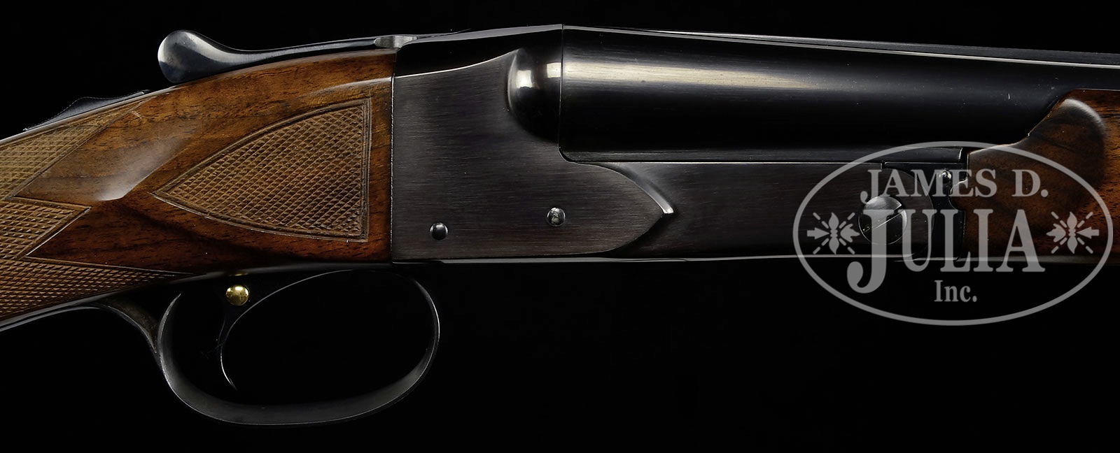 *FINE WINCHESTER MODEL 21 TRAP/SKEET GRADE 20 GAUGE.SN 6178. Cal. 20 ga. 2-3/4″ Chambers. 26″ Bbls have matted rib. Side of left bbl is marked “WINCHESTER – 20 GAUGE”. Bbl flats are stamped with SN and Winchester proofs, bottom of bbls with “WINCHESTER PROOF STEEL”, and are marked skeet and skeet. Standard blued action is stamped with Winchester information on water table. Action is marked “TRAP/ SKEET” on bottom. Feather crotch figured American walnut straight grip buttstock has point pattern checkering with beaded borders at grip, and checkered wood butt. Matching beavertail ejector forend is unbraced. Drop at heel: 1-15/16″. Drop at comb: 1-1/2″. Weight. 6 lbs 10 oz. LOP: 14″. CONDITION: Excellent, as completely refurbished, possibly by factory, retaining nearly all finishes on wood and metal. Wood appears new, checkering is clean and sharp. Bores are excellent. Action is off face with forend in place. Ejectors are in time. Trigger works. 4-50372 MGM225 (5,000-8,000) – Lot 3553