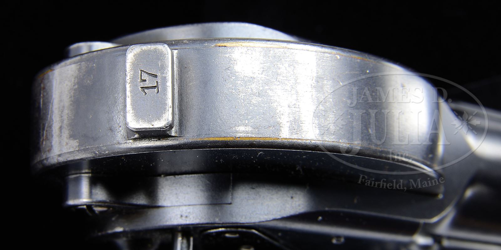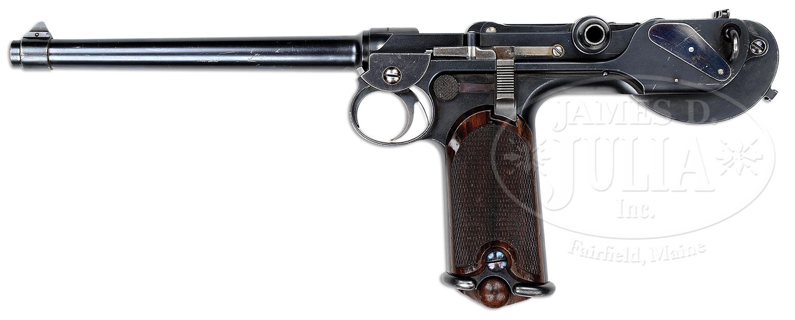 VERY RARE LOEWE PRE-PRODUCTION BORCHARDT PISTOL SN 17.SN 17. Cal. .30 Borchardt. Pre-production or extremely early production Loewe Borchardt. Standard features include a 7-1/2″ bbl and the usual “Ludw. Loewe & Co./Berlin/1893” marking address above chamber. “D.R.P./No 758537.” on center toggle link. The interesting area centers about the pivoting sear whose forward arm extends in an unprotected manner above the plane of the receiver; the rearward arm is secured by a screwed-in flat spring. In later guns, the screw fixation was eliminated in favor of a recessed insertion. The full SN appears under the bbl, on the mainspring housing stock lug and on the bottom of the frame. Wide bordered, checkered walnut grips. Proper non-matching wood bottom magazine numbered “8”. This gun is featured on pgs. 113, 115, 116, 121, 137, 138 of The Borchardt & Luger Automatic Pistols by Joachim Gortz & Dr. Geoffrey Sturgess. PROVENANCE: Collection of Dr. Geoffrey Sturgess. CONDITION: Very fine retaining 95% orig blue with minor wear, scratches and light dings. Straw is 70% on the sear and has faded to a dull grey on toggle latch. Trigger has 50% fire blue and each of the cover plates & grip screws have approx 80% fire blue. Grips have light wear with visible grain. Mirror bore with minimal wear. Excellent magazine with small dings on base. Perfect manual mechanics. 43475-71 BWS (20,000-30,000) – Lot 3554