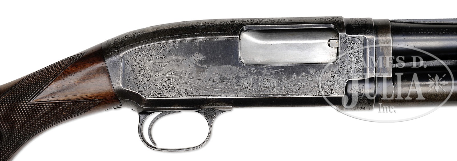 *VERY FINE 20 GAUGE WINCHESTER MODEL 12 WITH FACTORY PIGEON TYPE ENGRAVING.SN 310368. (1923) Cal. 20 ga. 2-1/2″ Chamber. 25″ Bbl choked modified, with full length, matted, solid rib has Winchester nickel steel information and choke on left side of rib, with patent dates, etc. on right. Importers mark is at bottom rear of left side of bbl. Blued action is factory engraved in Pigeon style, with large, shaded scroll at either end of game scenes; left side with quattro of mallards rising from marsh, right side depicts a setter and pointer on point with a pair of grouse flushing from meadow. Consignor states that this gun was engraved by George Ulrich, Master Engraver for Winchester. Lightly figured American walnut pistol grip buttstock measures 14-3/8″ over red Winchester pad. Point pattern checkering with beaded borders is at grip. Later forend is of extension type. Drop at heel: 2″, drop at comb: 1-3/8″. Weight: 7 lbs. 0 oz. LOP: 14-3/8″. CONDITION: Very fine. Metal retains approx 75% orig blue, considerable loss due to flaking. Action is thinning at top and bottom, with some freckling. Stocks retain most of their orig finish with numerous light marks and scratches. What appears to be orig pad is petrified, crazed, and chipped. Bore is excellent. Action is smooth. An unusual early Model 12. 4-50309 (10,000-15,000) – Lot 3557