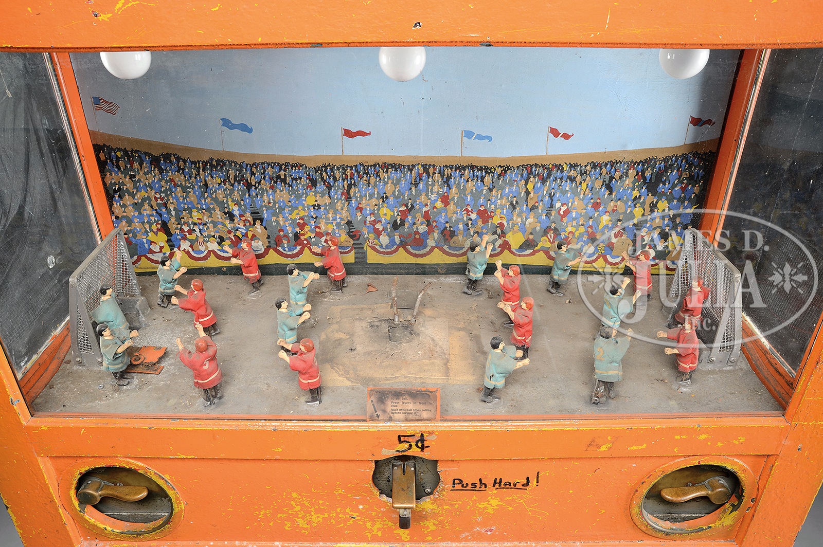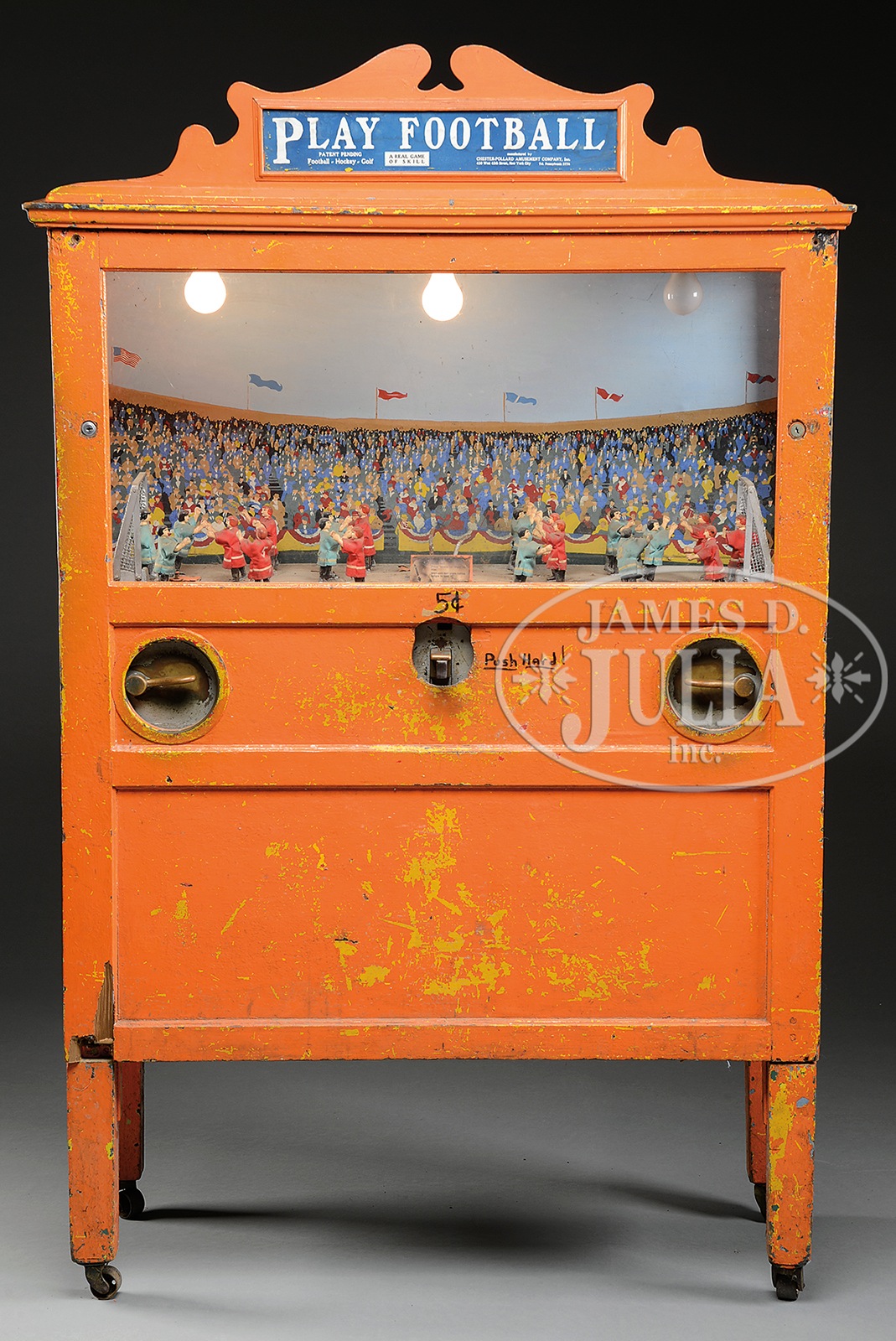 CHESTER POLLARD COIN-OPERATED “PLAY FOOTBALL” GAME.A great coin-op piece often found in arcades from the 1920s-40s. Charging only a nickel, two people would control their respective teams and play a simulated game of soccer/football. Lifelike actions with kicking and moving figures as well as the frustration your opponent would feel when you scored against them. These American made machines were quite popular arcade and amusement park attractions and were heavily used. They yielded the operator a significant return on investment, which at a cost of $550 in 1926 was quite a hefty sum. As in this case, oftentimes the oak cabinetry was repainted to freshen it up for the following seasons. Machine appears to be a good solid example, but in need of some mechanical as well as cosmetic attention if one were inclined to do so. SIZE: 73″ h x 28″ d x 46″ w. CONDITION: Coin entry area appears complete, but in need of a cover plate so as not to expose the interior mechanism. Retains original marquee with paper insert. Players would benefit from a freshening of uniforms. 1-13931 (1,000-2,000) – Lot 3557 Auction: Advertising, Toy & Doll - Spring 2014 Please Note: All prices include the hammer price plus the buyer’s premium, which is paid by the buyer as part of the purchase price. The prices noted here after the auction are considered unofficial and do not become official until after the 46th day. |