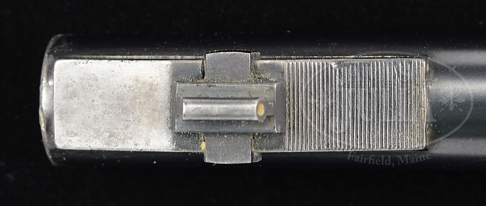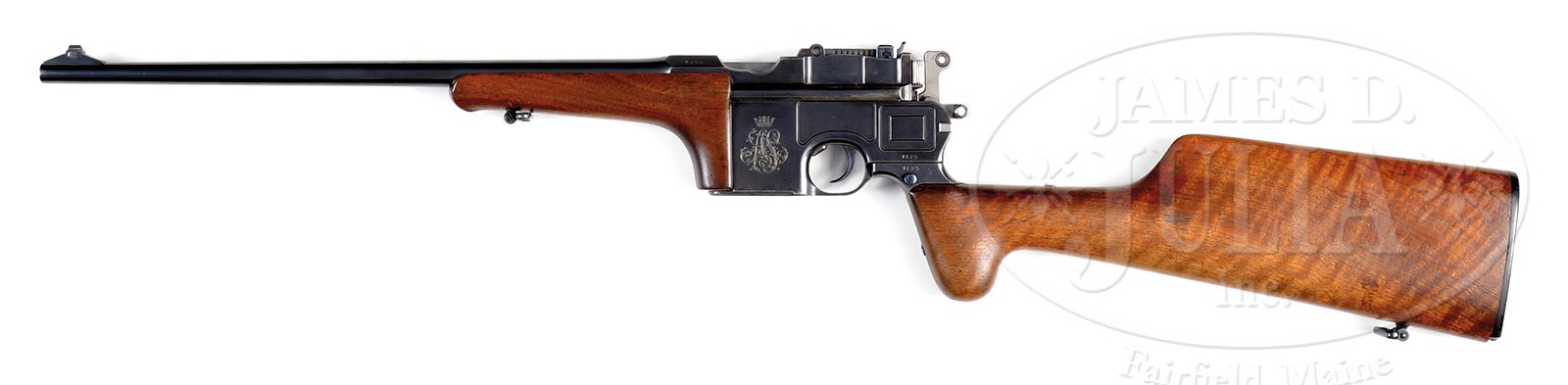 *◊ MAUSER C96 9MM EXPORT SMALL RING HAMMER CARBINE WITH INTERNAL FLOORPLATE RELEASE & PRESENTATION MONOGRAM.SN 1023. Cal. 9mm Export. This was the final form of Mauser’s standard production carbine. About 100 of these guns were assembled with most examples in the serial range 945-1050. Of these, relatively few were chambered for the 9mm Export. This carbine has a 15-3/4″ bbl, dovetailed bead front sight, short extractor, a slip-in 50-500 rear sight with a full center line, a standard cursor, grooved follower, two-lug firing pin, small ring hammer, and an internal (inside trigger guard) release of the floorplate. Usual Mauser address on top of the chamber; full SN is on left chamber flat and repeated on left rear frame and over the push button on the shoulder stock iron. The matching number is on the bolt stop, bolt, hammer and subframe. On the left side of the magazine housing is a Regal monogram, traces of gold at its base, in which a crown surmounts a lavishly intertwined “AS”. Monogram is 1-3/8″ in height & 1-1/8″ in width, attribution unknown. Two-line Mauser address is on right side of frame. Smooth forearm and buttstock each fitted with orig sling swivel. Buttstock with Mauser logoed buttplate. PROVENANCE: Collection of Dr. Geoffrey Sturgess. CONDITION: Old professional restoration with correct rust blue, now with approx 95-97% coverage. Rust blue has also been applied to body of stock lug. Small parts have been lightly polished and re-heat treated for an enhanced fire blue. Forend & buttstock have orig finish, though thinned & darkened from oil, with a scattering of surface dings. Orig buttplate in comparable condition, missing a chip at the toe. Bright bore with shallow rifling, moderate corrosion. Perfect manual mechanics. An interesting carbine whose impressive monogram deserves further research. 43475-41 LMA123 (7,500-12,500) – Lot 3557