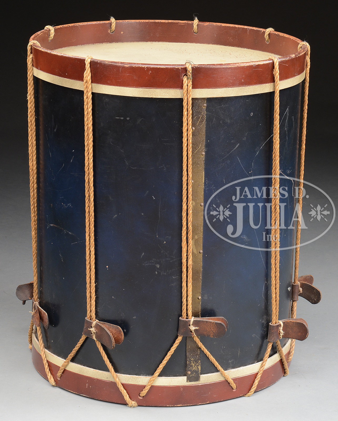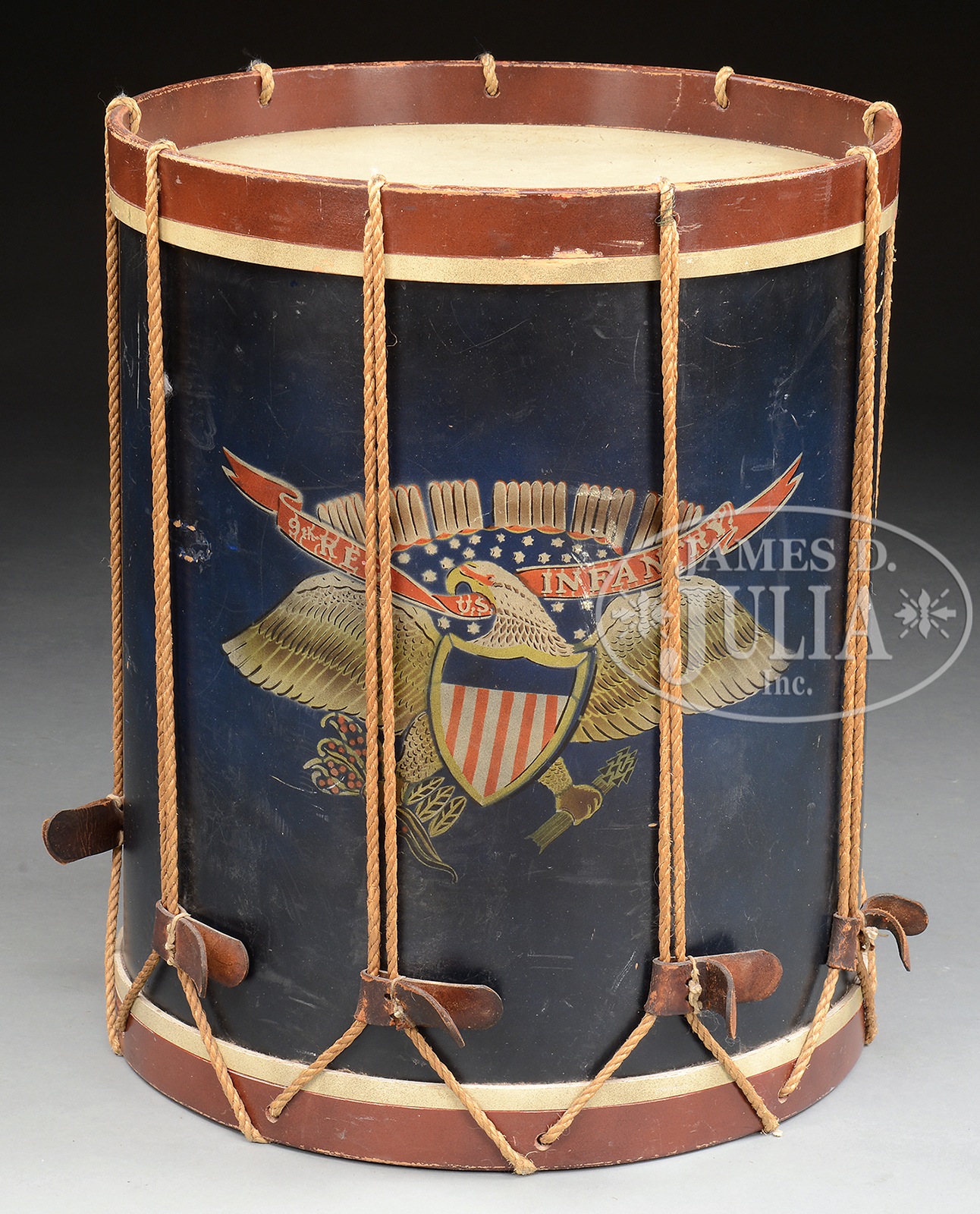 DECORATIVE TABLE IN THE FORM OF A DRUM WITH SPREAD WING FEDERAL EAGLE DECORATION.American circa 1920. Highly decorative red, white and blue drum form table with faithful stringing and leather tabs. Eagle presents correctly when drum is placed on side. Drum heads are solid for use as a table. SIZE: 25″ h x 20″ d. CONDITION: In very good condition and patina. 1013-2 (800-1,200) – Lot 3557
