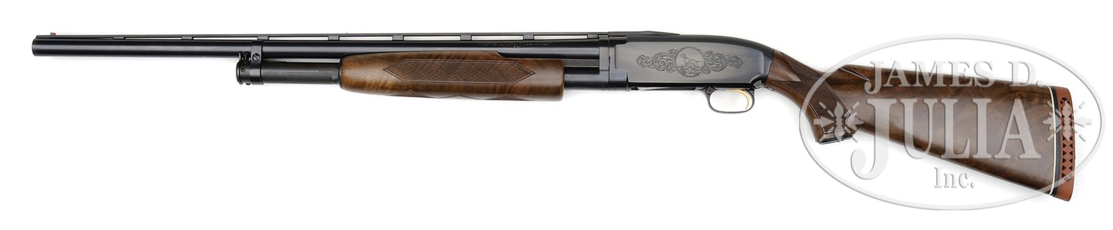 *WINCHESTER MODEL 12 WITH 12-1C ENGRAVING, FOUR BARREL SET WITH BOXES.SN 1370044. Cal. 12 ga. 2-3/4″ Chambers. 26″ bbls choked skeet, 26″ choked improved cylinder, 28″, choked modified, and 30″ bbls, choked full. All are fitted with raised ventilated ribs having rectangular posts, with two beads, silver mids and Bradley red fronts. Typical standard type action with gold-plated trigger, and engine turned bolt and follower, is engraved in Model 12-1C style with large, shaded scroll flanking circular vignettes of pointing pointers on left and right sides of action. XXX flame figured American walnut steel capped pistol grip buttstock measures 14-1/4″ over open sided, red Winchester pad over 1/16″ white line spacer. Point pattern checkering with heavy beaded border is at grip. Steel cap is embossed “WINCHESTER REPEATING ARMS”. Each bbl set has its own matching checkered extended beavertail forend. Drop at heel: 2-9/16″, drop at comb: 1-1/2″. Weight with IC bbl set: 8 lbs. 3 oz. LOP: 14-1/4″. Accompanied by red, white, and blue Winchester marked boxes; one marked “Gun and Mod”, another marked “Imp Cylinder”, and the last marked “Skeet and Full”, all in brown corrugated cardboard shipping box with UPS labels. PROVENANCE: Email from consignor with history of this gun as he knows it, stating “I was told the gun originally belonged to Spencer Olin” and “I purchased the gun in 1978, it was in the carton used to ship it from the factory when it was redone. The gun has remained unfired since it was restored.” CONDITION: Excellent, originally made in 1954 as a three bbl set, gun was returned to Winchester for 4th bbl. In the early 1970’s the gun was returned to the factory and completely redone to include new forends and stocks. It currently retains all of these factory finishes, with only some marks and rubs on magazine tubes from contact with tube retainers and forends during assembly and disassembly. Bores are excellent. Action is crisp. Boxes are excellent, outer shipping box shows some wear. 4-48707 MGM187 (4,500-7,500) – Lot 3559