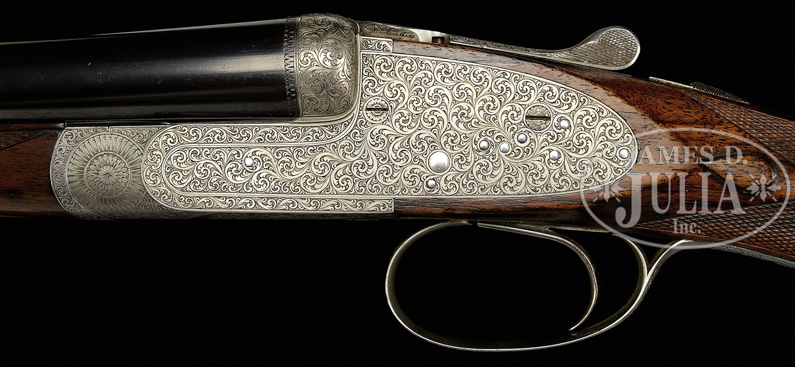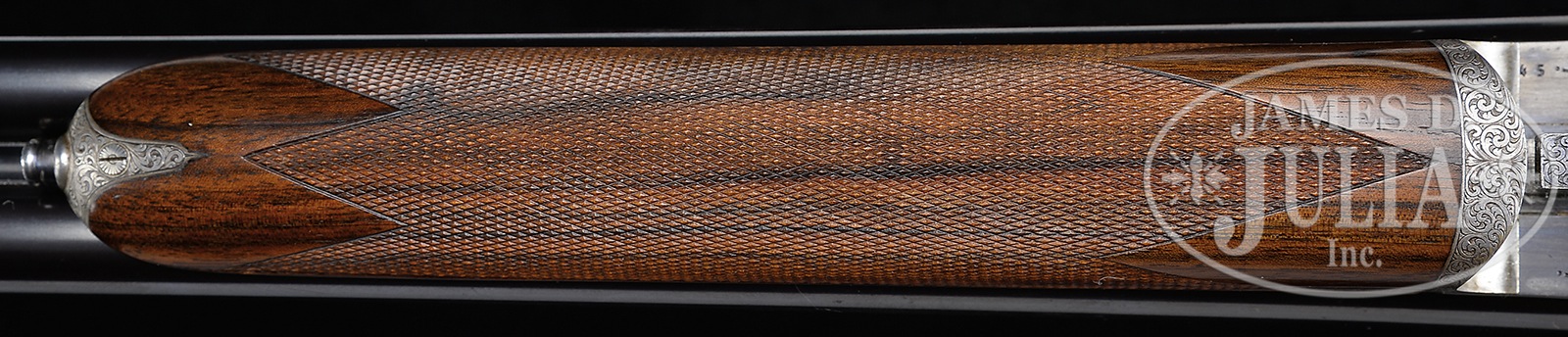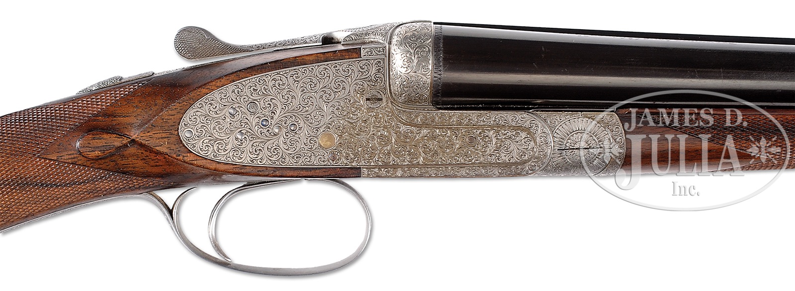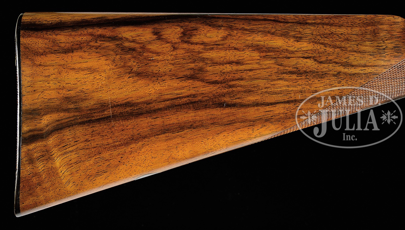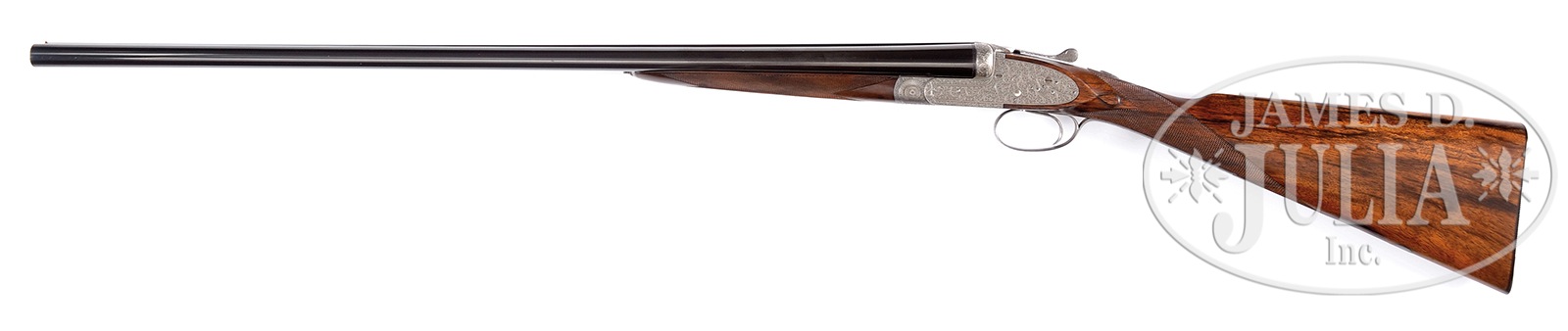 *EXCEPTIONALLY RARE PRE WAR BROWNING 20 GAUGE SIDELOCK EJECTOR SINGLE TRIGGER GAME GUN WITH CASE.SN 1006. Cal. 20 ga. These fine Browning marked guns were mostly produced by the esteemed firm of Lebeau-Courally, and are very desirable. This fine small gauge example has 28″ dovetailed bbls with matted, slightly swamped, narrow game rib engraved “Browning Arms Co Ogden Utah” and “Made in Belgium” on tops. Bbl flats are stamped with 1930 Belgian nitro proofs for 2-3/4″ chambers. Coin finished sidelock action features non-automatic safety (S inlaid in gold), hidden third fastener, bushed strikers, and single non-selective trigger. Action is engraved with near full coverage very well cut, varying sized, open, shaded scroll. Bottom of action is engraved “Browning Arms Company” in scroll terminated arched riband. Trigger guard with matching scroll has SN on tang. Nicely marbled European walnut straight grip buttstock measures 14″ over ribbed horn buttplate, and features classic drop points and borderless point pattern checkering. Matching splinter ejector forend has Anson release. Bore diameter: left -.626, right – .626. Bore restrictions: left – .006 (IC), right – .015 (mod). Wall thickness: left – .029, right – .031. Drop at heel: 2-7/16″, drop at comb: 1-1/2″. Cast: approx 1/2″ off. Weight: 5 lbs. 12 oz. LOP: 14″. Tan vinyl Hartmann case is lined in faux fur, and contains a key. PROVENANCE: Remarkable William Larkin Moore Private Estate Collection of Fine Sporting Arms. CONDITION: Excellent, as partially refinished. Bbls retain nearly all of a fine quality rust re-blue, subsequently thinning on sides from normal hand wear. Coin finish of action is fine with some darkening and very light pitting on right side. Stocks retain nearly all of an old hand rubbed oil finish with subsequent light marks. Checkering is freshened. Bores are excellent. Action is tight. Bbls are on face. Ejectors are slightly out of time. Trigger seems to work well. Case is excellent. A very fine handling light weight gun. 50594-99 MGM99 (8,500-14,500) C&R – Lot 3561