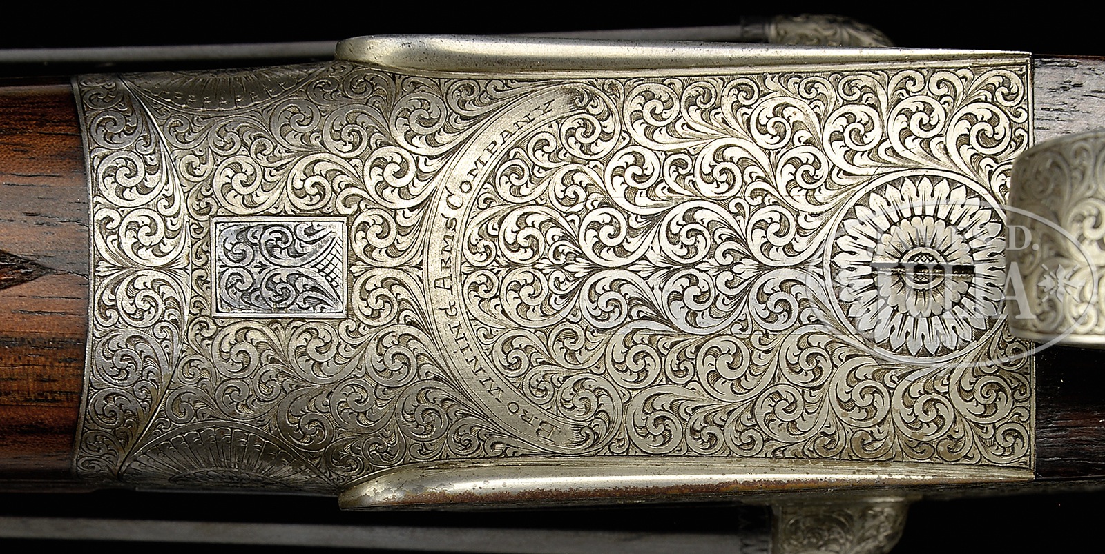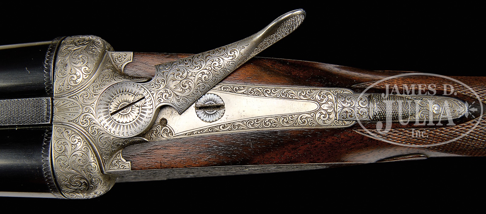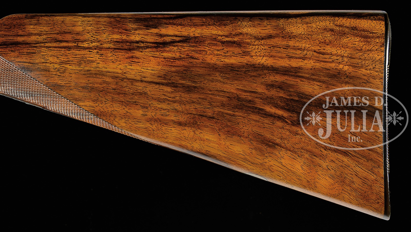 *EXCEPTIONALLY RARE PRE WAR BROWNING 20 GAUGE SIDELOCK EJECTOR SINGLE TRIGGER GAME GUN WITH CASE.SN 1006. Cal. 20 ga. These fine Browning marked guns were mostly produced by the esteemed firm of Lebeau-Courally, and are very desirable. This fine small gauge example has 28″ dovetailed bbls with matted, slightly swamped, narrow game rib engraved “Browning Arms Co Ogden Utah” and “Made in Belgium” on tops. Bbl flats are stamped with 1930 Belgian nitro proofs for 2-3/4″ chambers. Coin finished sidelock action features non-automatic safety (S inlaid in gold), hidden third fastener, bushed strikers, and single non-selective trigger. Action is engraved with near full coverage very well cut, varying sized, open, shaded scroll. Bottom of action is engraved “Browning Arms Company” in scroll terminated arched riband. Trigger guard with matching scroll has SN on tang. Nicely marbled European walnut straight grip buttstock measures 14″ over ribbed horn buttplate, and features classic drop points and borderless point pattern checkering. Matching splinter ejector forend has Anson release. Bore diameter: left -.626, right – .626. Bore restrictions: left – .006 (IC), right – .015 (mod). Wall thickness: left – .029, right – .031. Drop at heel: 2-7/16″, drop at comb: 1-1/2″. Cast: approx 1/2″ off. Weight: 5 lbs. 12 oz. LOP: 14″. Tan vinyl Hartmann case is lined in faux fur, and contains a key. PROVENANCE: Remarkable William Larkin Moore Private Estate Collection of Fine Sporting Arms. CONDITION: Excellent, as partially refinished. Bbls retain nearly all of a fine quality rust re-blue, subsequently thinning on sides from normal hand wear. Coin finish of action is fine with some darkening and very light pitting on right side. Stocks retain nearly all of an old hand rubbed oil finish with subsequent light marks. Checkering is freshened. Bores are excellent. Action is tight. Bbls are on face. Ejectors are slightly out of time. Trigger seems to work well. Case is excellent. A very fine handling light weight gun. 50594-99 MGM99 (8,500-14,500) C&R – Lot 3561