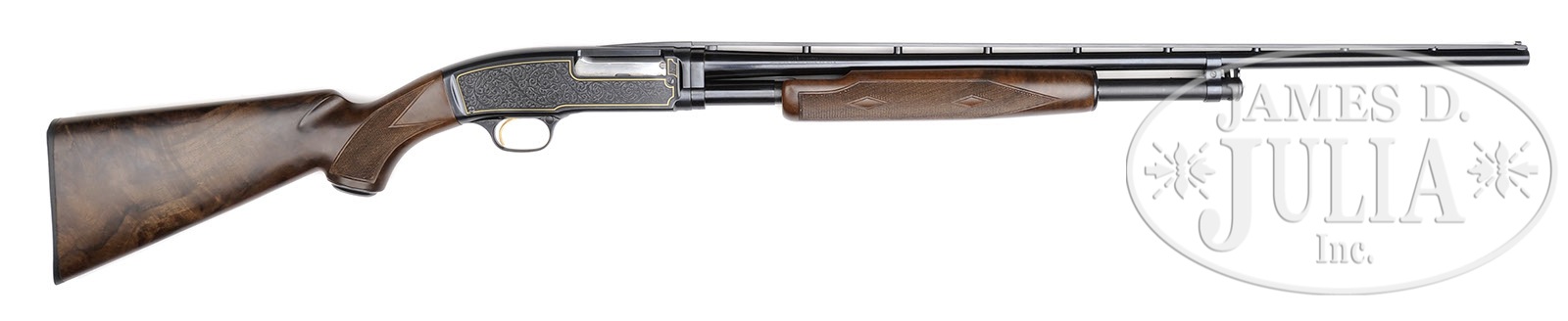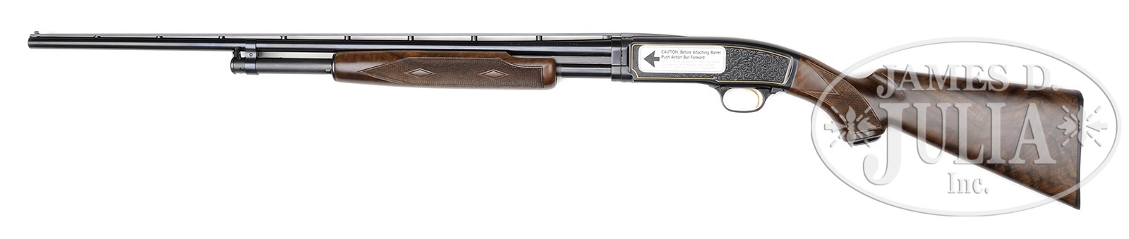 *.410 WINCHESTER MODEL 42 GRADE 7 WITH BOX.SN WFT284. Cal. .410. 3″ Chamber. 26″ Ventilated rib bbl is marked with Winchester information on left, and “MADE IN JAPAN” “IMPORTED TO NEW HAVEN, CT. U.S.A.” on right. Blued action has inlaid gold band surrounding large, shaded scroll “engraving” on both sides. Crotch figured American walnut steel capped pistol grip buttstock has checkering at grip. Matching forend has open diamonds in middle of checkering pattern. Drop at heel: 2-1/2″, drop at comb: 1-1/2″. Weight: 6 lbs. 4 oz. LOP: 14″. Original red Winchester box has correct end label for this gun. PROVENANCE: Hang tag with instructions. CONDITION: Excellent, essentially as new. Caution label is still on left side of action. Box and end label are fine. 4-49527 MGM101 (2,000-4,000) – Lot 3562