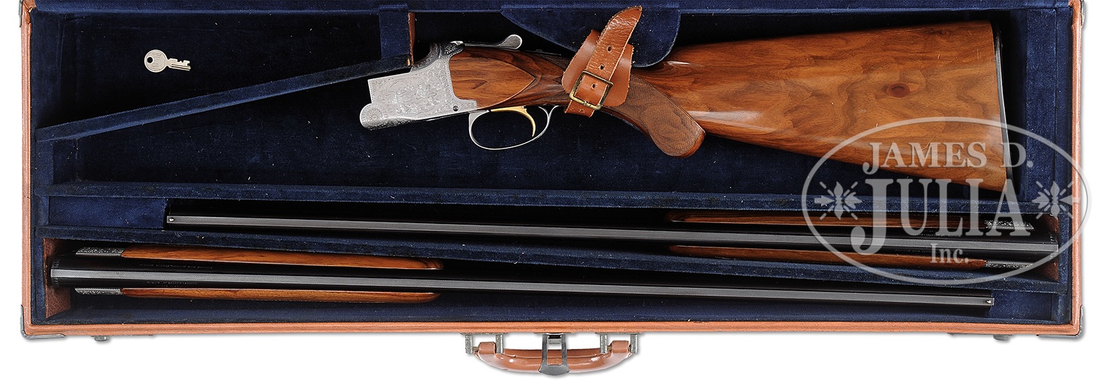 *SUPERB EARLY 20 GAUGE BROWNING SUPERPOSED SHOTGUN “FIGHTING COCKS” “GRADE III” ENGRAVED BY FELIX FUNKEN WITH EXTRA BARRELS AND TOLEX CASE.SN 8559. (1955) Cal. 20 ga. 2-3/4″ Chambers. 26-1/2″ and 28″ Bbls with narrow, matted, ventilated ribs and only St. Louis addresses, are marked with SN and “1” (28″) or “2” (26-1/2″) on left sides breech ends of bottom bbls. Set “1” is marked for mod and full chokes, and “2” for IC and skeet (minus sign has “S” struck over). Coin finished action with non-automatic safety and gold-plated single selective trigger is engraved in “Grade III” style with well cut, varying sized classic scroll within stamped heart borders surrounding vignettes of game; pair of fighting black game cocks with harem of females watching, on left, and large group of pheasant, mostly standing and feeding, on right. Bottom of action has fine portrait of spaniel retrieving a duck. This tasteful engraving is by the revered Felix Funken whose signature appears on the bottom of both bird scenes. Well streaked European walnut long tang round knob buttstock measures 14-1/4″ over Browning embossed horn buttplate, and features well cut point pattern checkering at grip with double line borders. Each bbl set is fitted with its own field type forend, which match well. BBL set “1” 28″: Bore diameter: top -.612, bottom – .612. Bore restrictions: top – .035 (full), bottom – .015 (mod). Drop at heel: 2-3/8″, drop at comb: 1-1/2″. Cast: Neutral. Weight: 6 lbs. 10 oz. LOP: 14-1/4″. BBL set “2” 26-1/2″: Bore diameter: top -.612, bottom – .610. Bore restrictions: top – .007 (IC), bottom – .002 (skeet). Drop at heel: 2-7/16″, drop at comb: 1-9/16″. Cast: Neutral. Weight: 6 lbs. 8 oz. LOP: 14-1/4″. What is most likely orig Tolex case has space for action and both bbl sets, is lined in royal blue cloth, and contains a key. PROVENANCE: Remarkable William Larkin Moore Private Estate Collection of Fine Sporting Arms. CONDITION: Excellent, original, near new. Bbls have only a few light handling and assembly marks. Coin finish of action is excellent, bright, with only a few small dings. Stocks are excellent with some light marks and scratches, checkering still light in color. Breechfaces show little evidence of firing. Bores are excellent. Mechanically crisp. Case exterior is excellent with some rubs and nicks, hardware somewhat frosted. Interior cloth is very fine with some rubs and compressions. A wonderful closet queen from the 1950’s. 50594-100 MGM126 (8,500-13,500) – Lot 3562