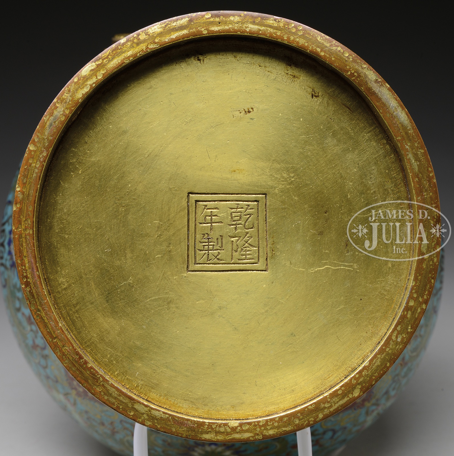 CLOISONNE VASE TIME PIECE.20th century, China. Decorated with Ju-i and garlands of bats, resonance stones, double and lotus scrolls on a turquoise ground. Acanthus leaf borders at the base. One side inset with a European clock. SIZE: 12-1/2″ h. CONDITION: Clock not in working condition. 7-75633 (500-700) – Lot 3563